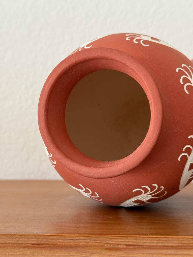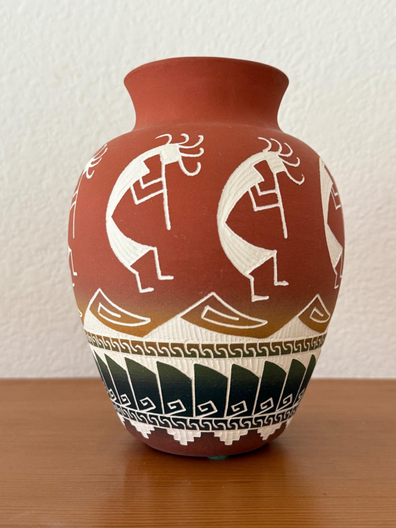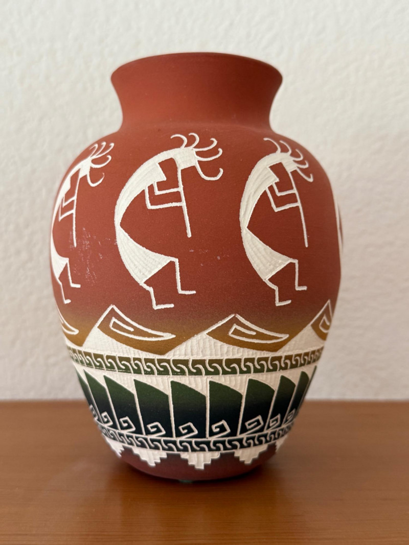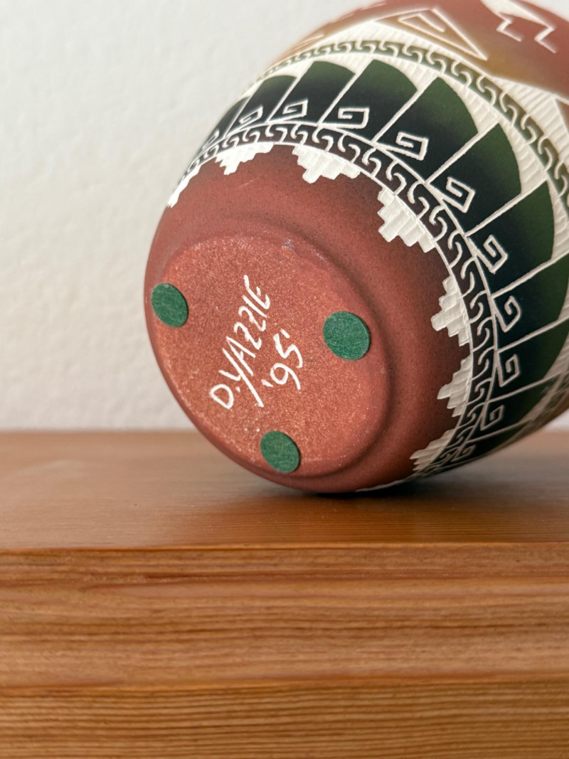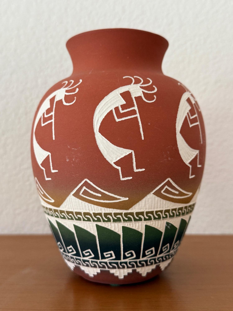 Donna Yazzie Navajo Pottery Vase - Kokopelli Design Hand-painted Navajo pottery vase by renowned artist Donna Yazzie. Features striking Kokopelli figures and traditional geometric designs. 6 inches tall. Signed and dated '95.