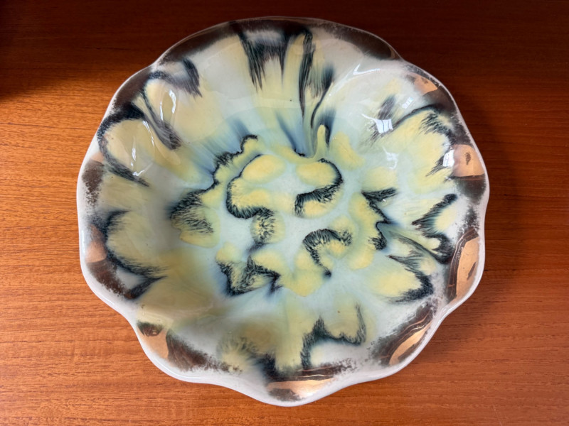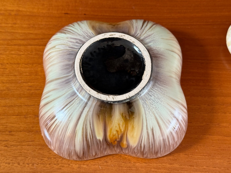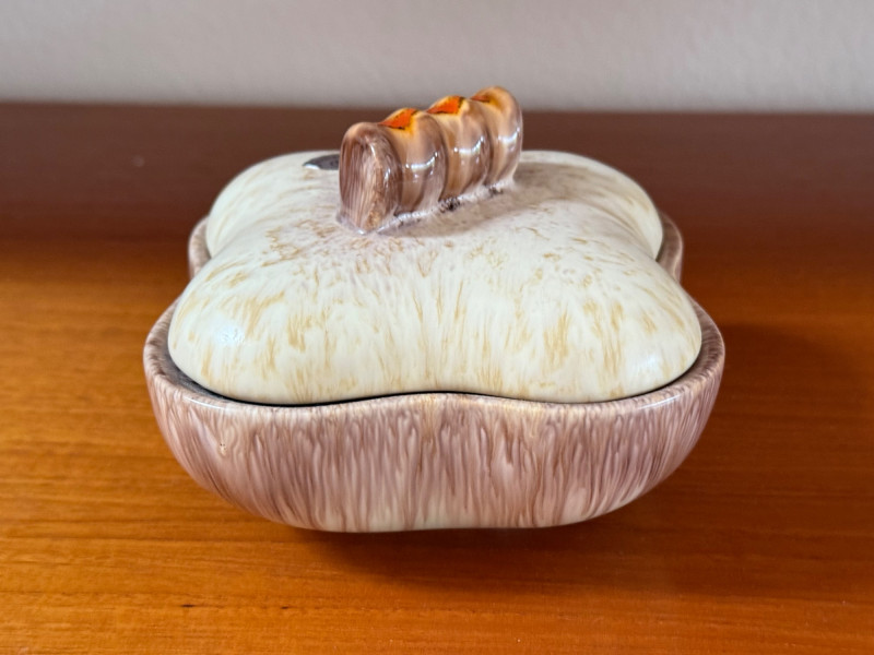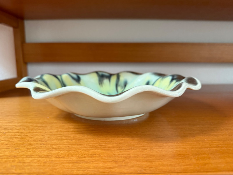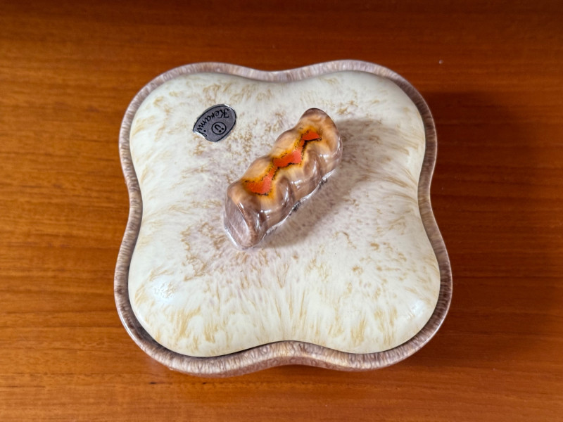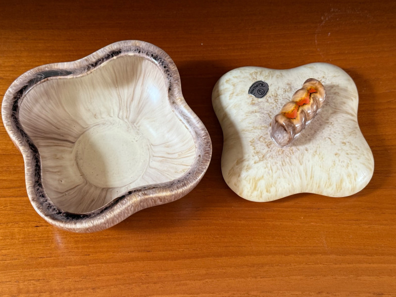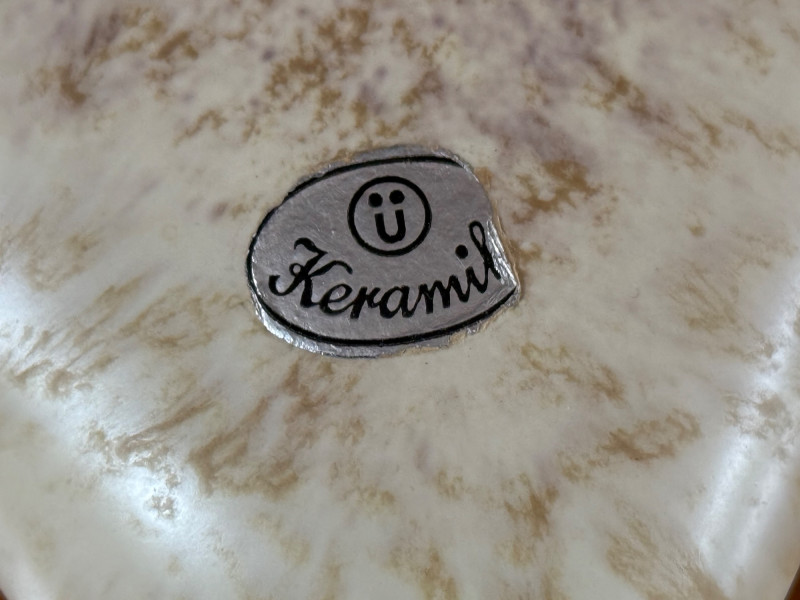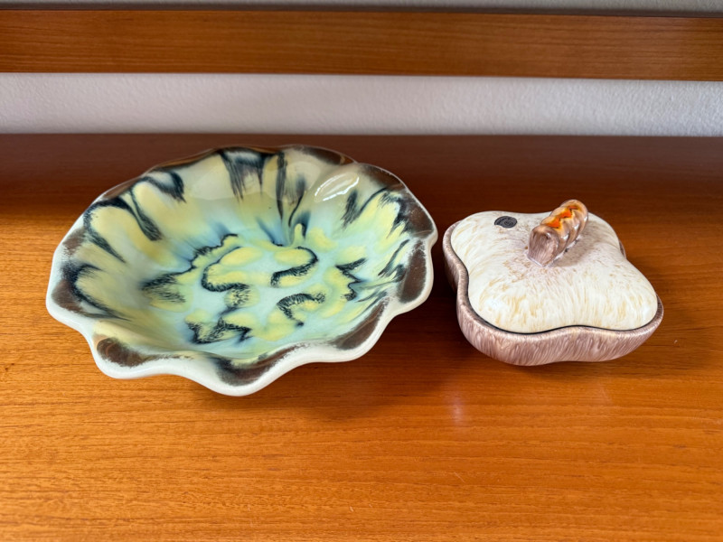 Vintage Mid Century German Pottery Set - Keramil & Green Dish This charming vintage set features two distinct pieces of German pottery, perfect for adding a touch of Mid Century flair to your home. The set includes a unique Keramil lidded bowl, showcasing a creamy, mottled glaze and a stylized handle. The lid bears the "Keramil" mark, indicating its quality and design. Accompanying this is a vibrant West German ceramic trinket dish, finished in a striking green glaze with colorful accents. Ideal for storing small treasures or simply as a decorative accent, this dish adds a delightful pop of color. Both pieces are wonderful examples of vintage German craftsmanship and design from the Mid Century era. Dimension: Measures 5 to 10 inches wide