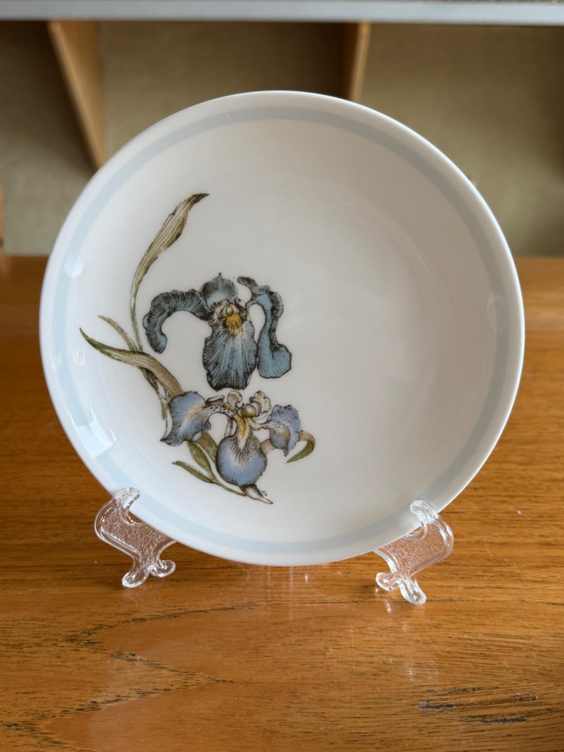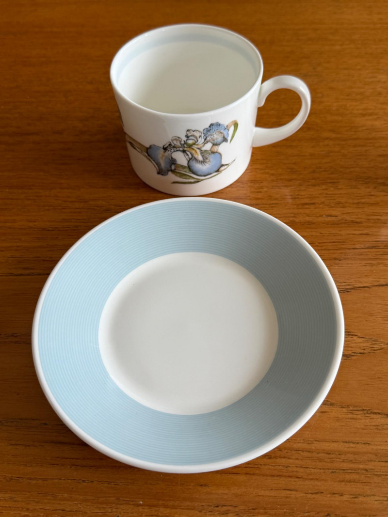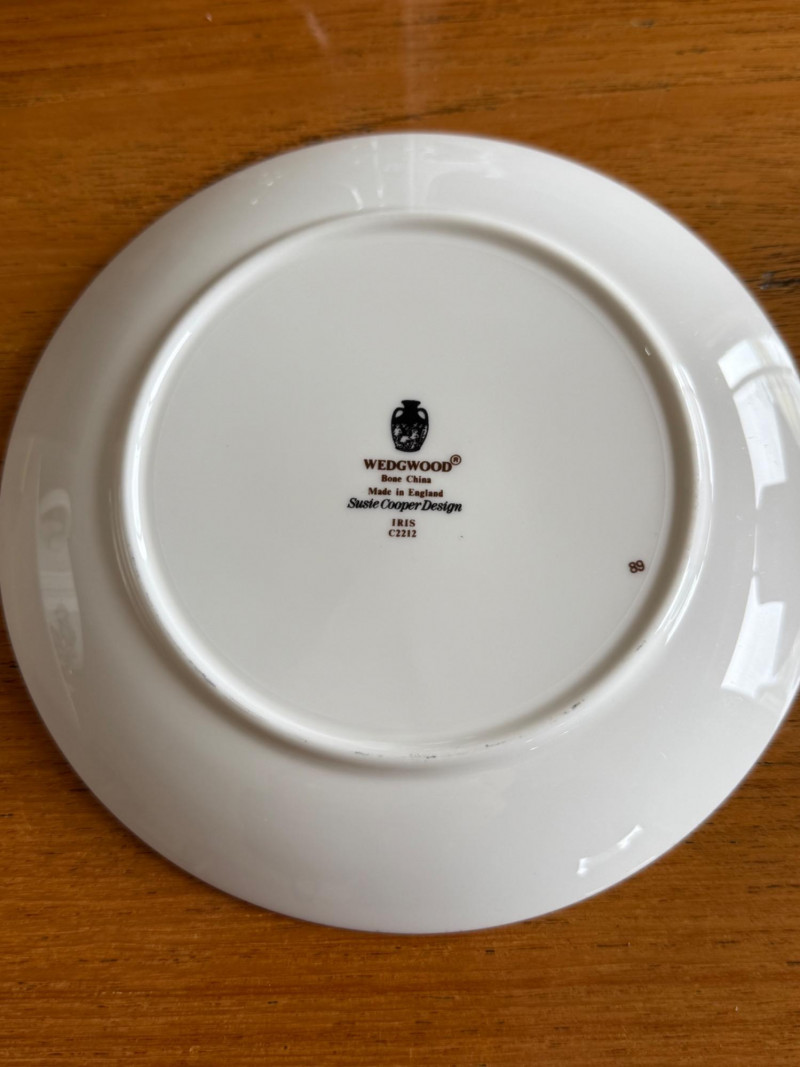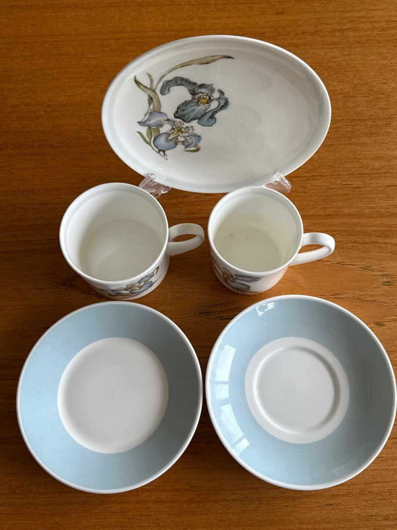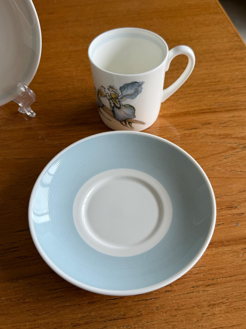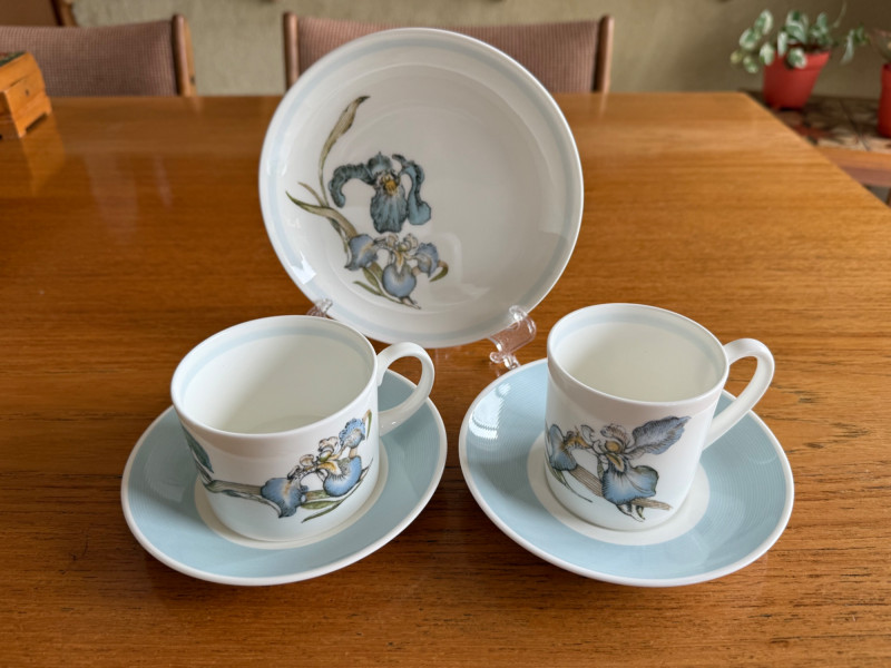 Collectible Wedgwood Susie Cooper "Iris" Tea Set Trio (5 Pieces) A wonderful opportunity to acquire a five-piece Wedgwood bone china tea set in the iconic "Iris" pattern, a celebrated design by Susie Cooper. This set comprises two teacups, two saucers, and a matching side plate, all adorned with the signature blue and grey iris flowers and a soft blue accent. A highly collectible pattern and a testament to timeless elegance.