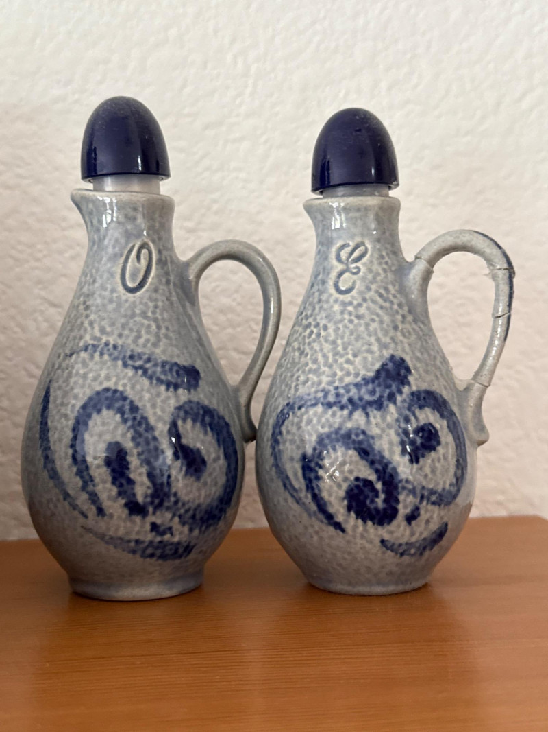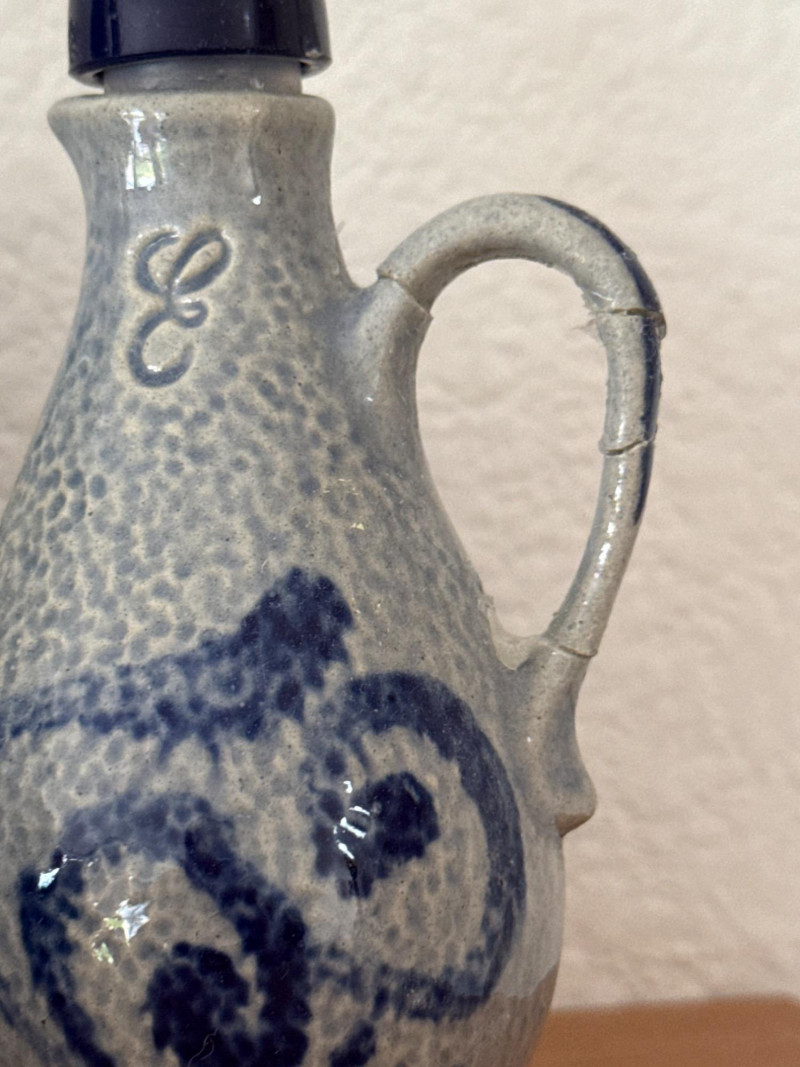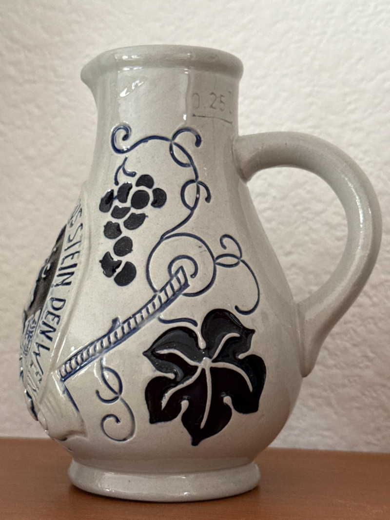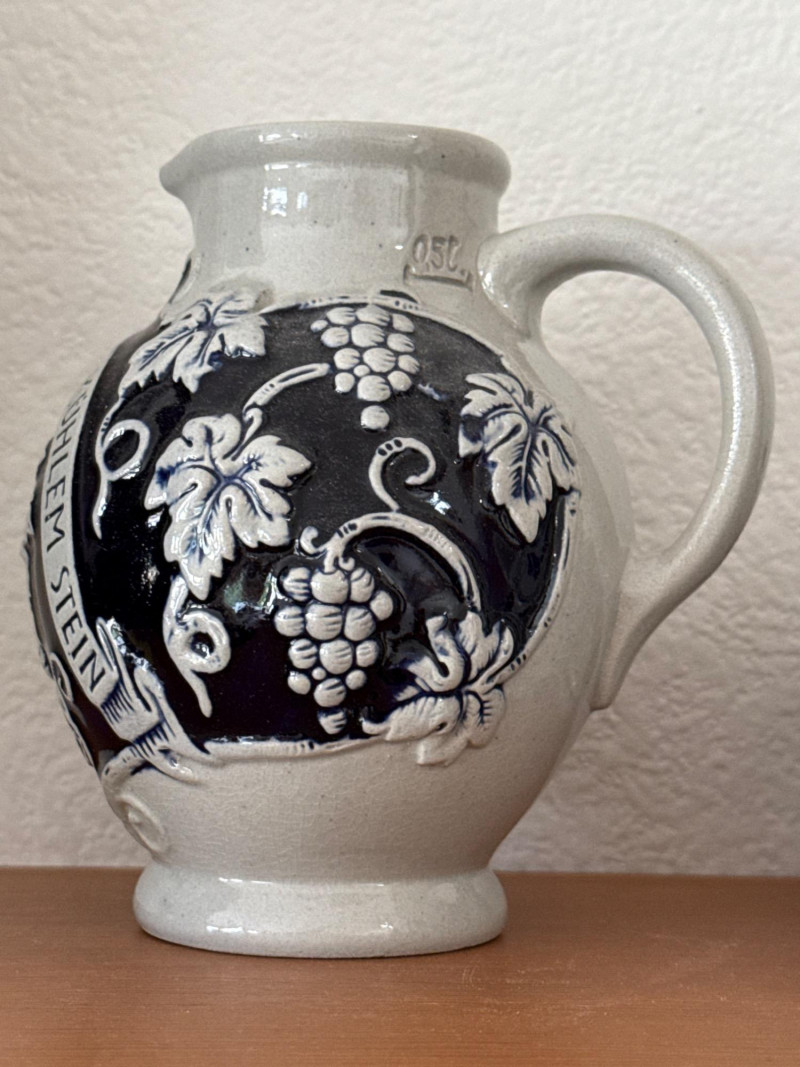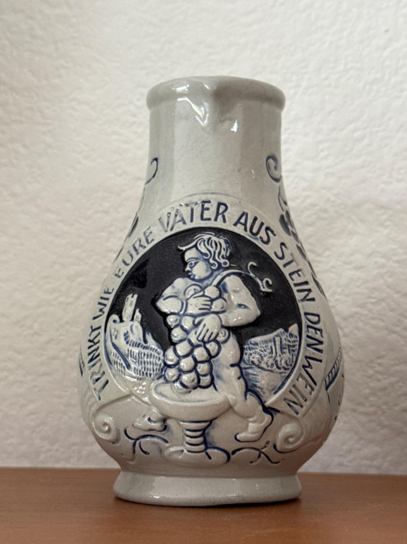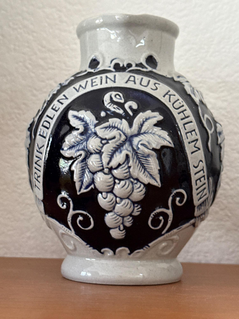 Vintage German Marzi & Remy & Wine Themed Blue Stoneware Collection A delightful set of eight vintage German blue stoneware pieces, featuring notable maker Marzi & Remy and charming wine-related themes. Included are: