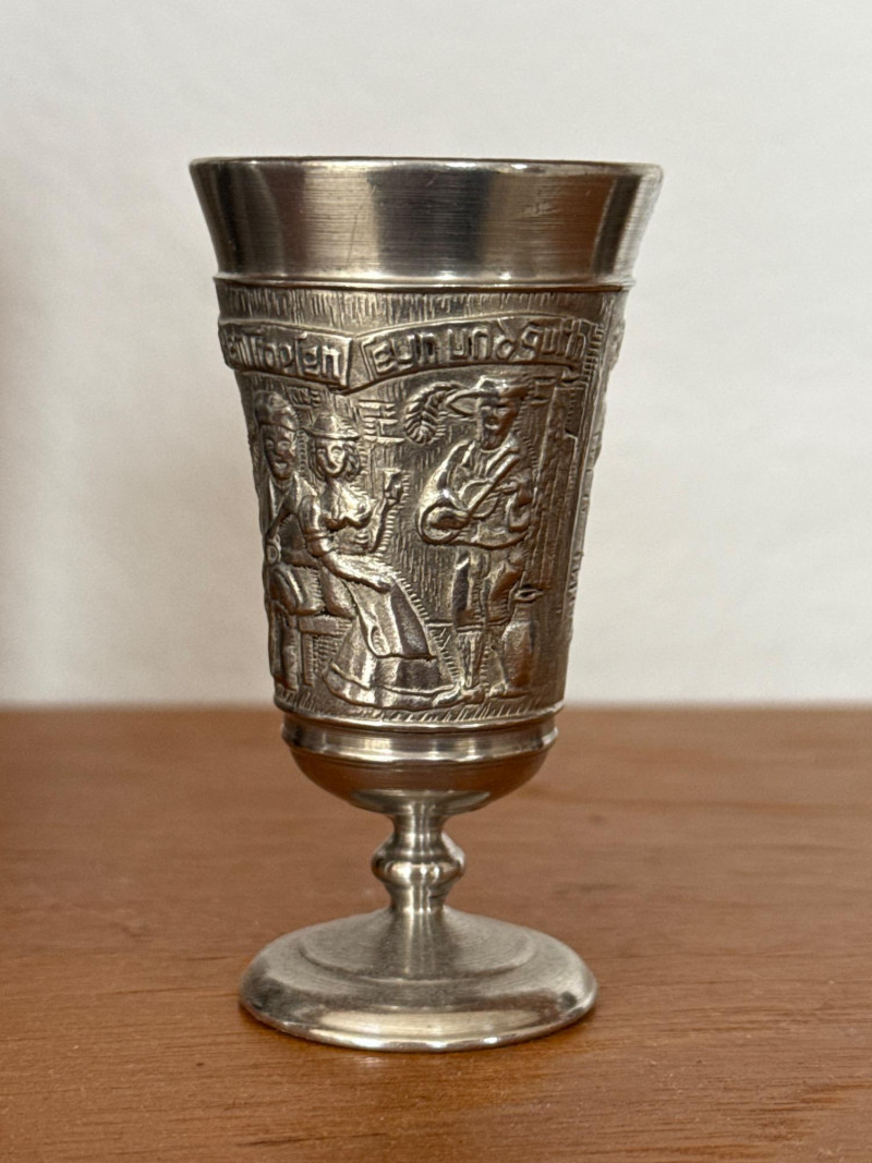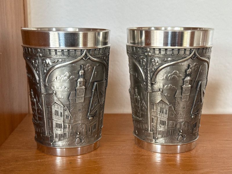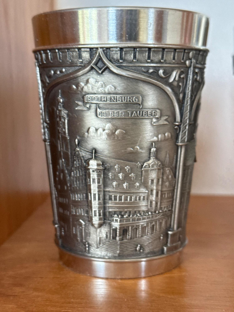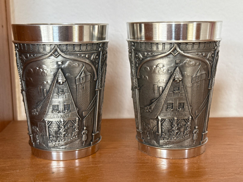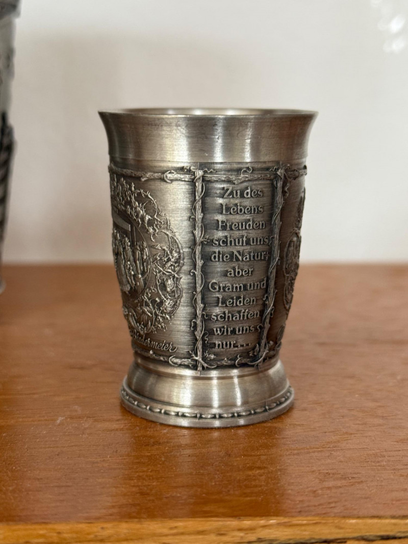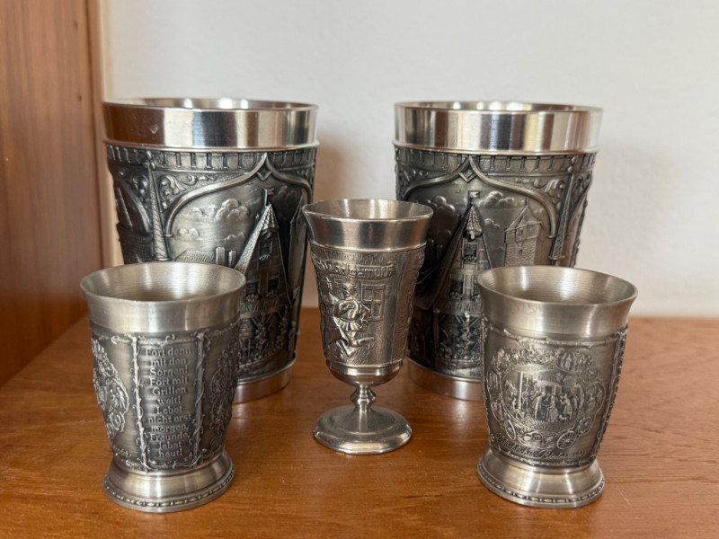 Set of 5 Vintage German Pewter Cups - Embossed Scenes & Text Measures 2 1/2 to 4 inches tall. This is an excellent opportunity to acquire a set of five vintage German pewter cups, each telling a story through its detailed embossing. The collection includes two cups celebrating the historic town of Rothenburg ob der Tauber, a stemmed goblet with figural representations, and two smaller cups, one referencing "Glücklicher Blumeter" and another with narrative scenes and German script. These cups bear maker's marks such as "Zinn" and "WMZ," indicating their German origin and pewter composition. A fascinating set for enthusiasts of German history, culture, and metalware.