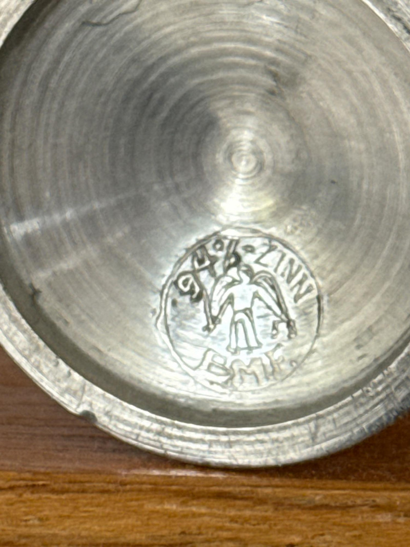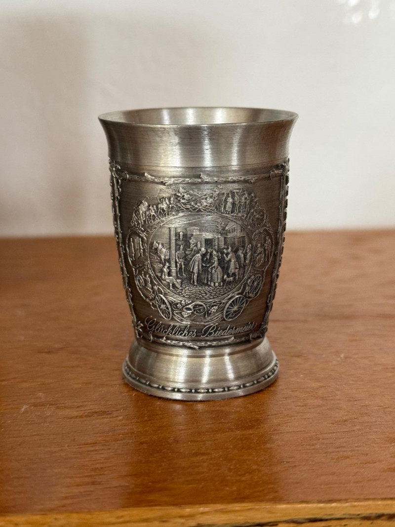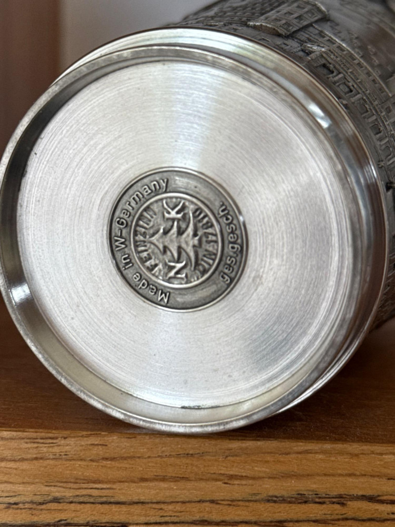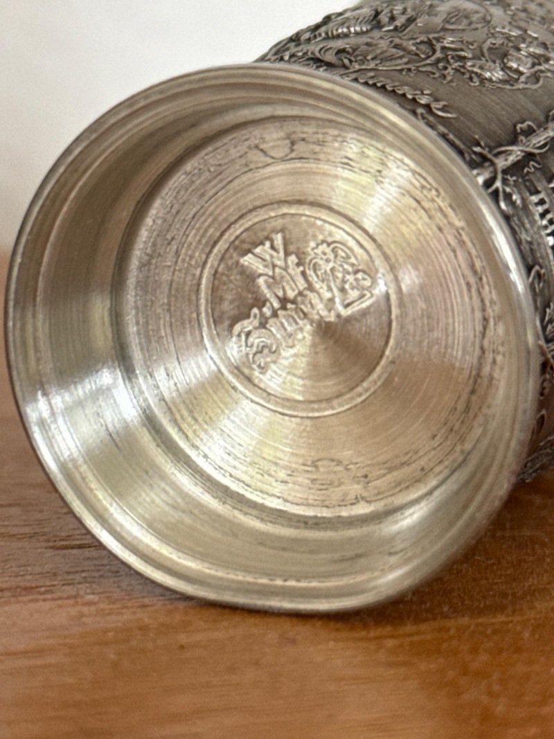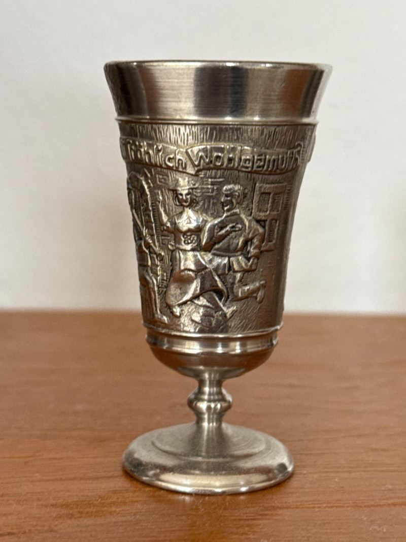 Set of 5 Vintage German Pewter Cups - Embossed Scenes & Text Measures 2 1/2 to 4 inches tall. This is an excellent opportunity to acquire a set of five vintage German pewter cups, each telling a story through its detailed embossing. The collection includes two cups celebrating the historic town of Rothenburg ob der Tauber, a stemmed goblet with figural representations, and two smaller cups, one referencing "Glücklicher Blumeter" and another with narrative scenes and German script. These cups bear maker's marks such as "Zinn" and "WMZ," indicating their German origin and pewter composition. A fascinating set for enthusiasts of German history, culture, and metalware.