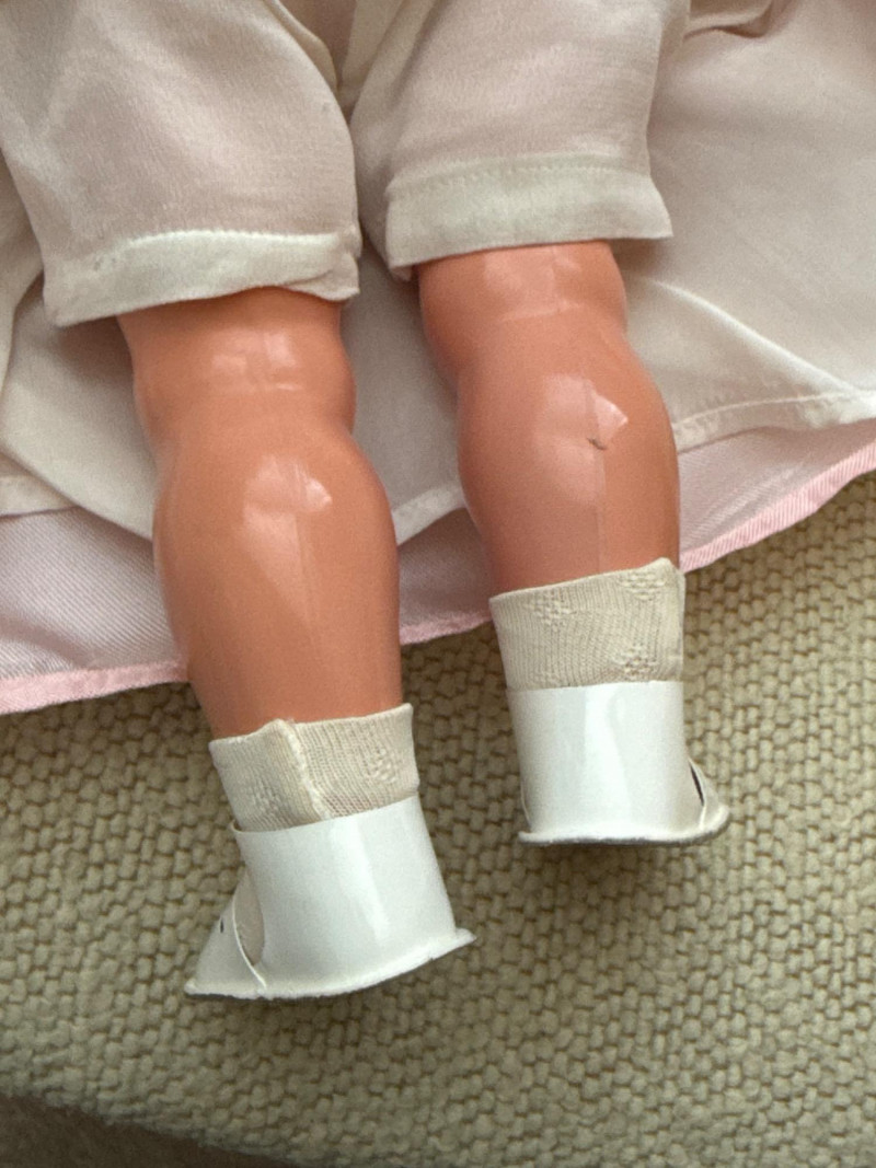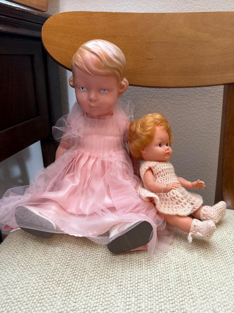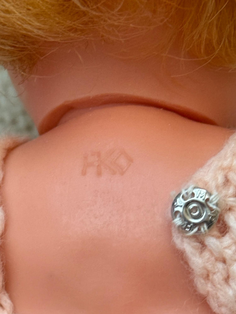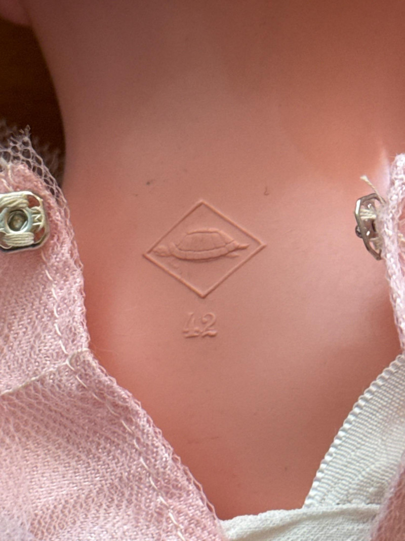Vintage Schildkröt Doll & Companion – Hard Plastic, Marked Charming pair of vintage hard plastic dolls featuring molded hair, hand-painted features, and original or handmade clothing. The larger doll is marked with the Schildkröt turtle logo and number 42 & 24” tall, indicating German manufacture. The smaller doll bears a diamond HK mark, possibly from East German or other mid-century European origins. Both have a nostalgic presence, perfect for collectors of mid-20th century dolls or display in vintage decor settings.