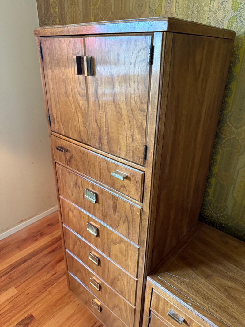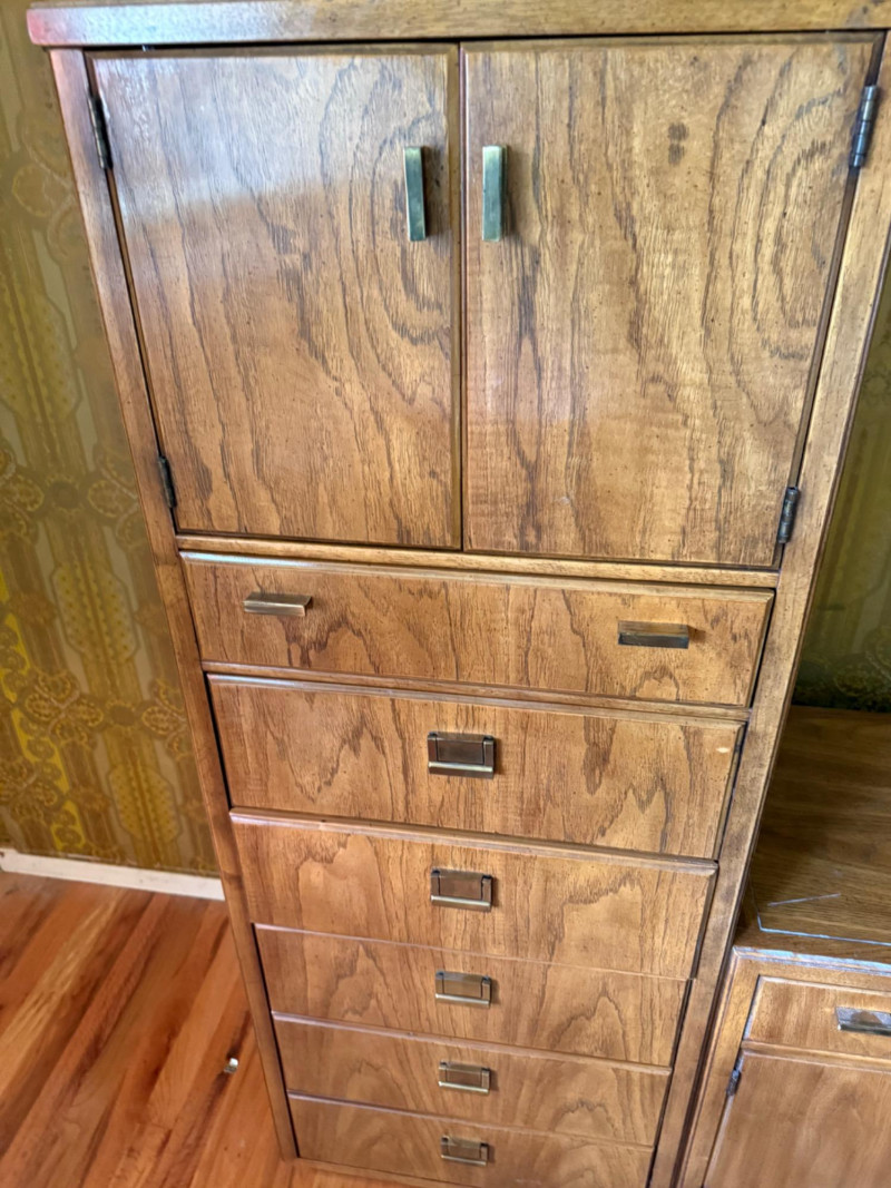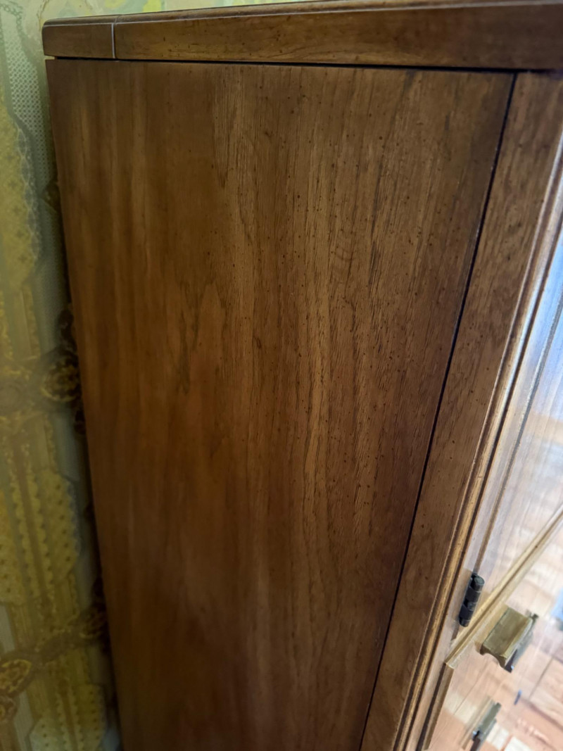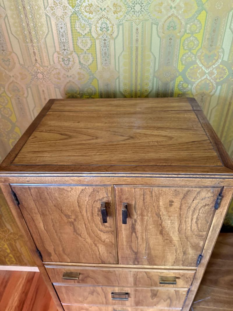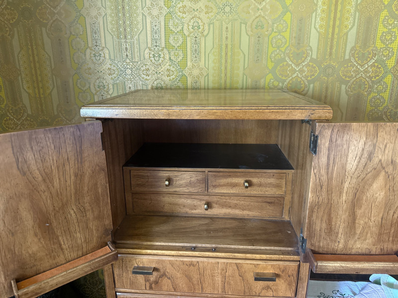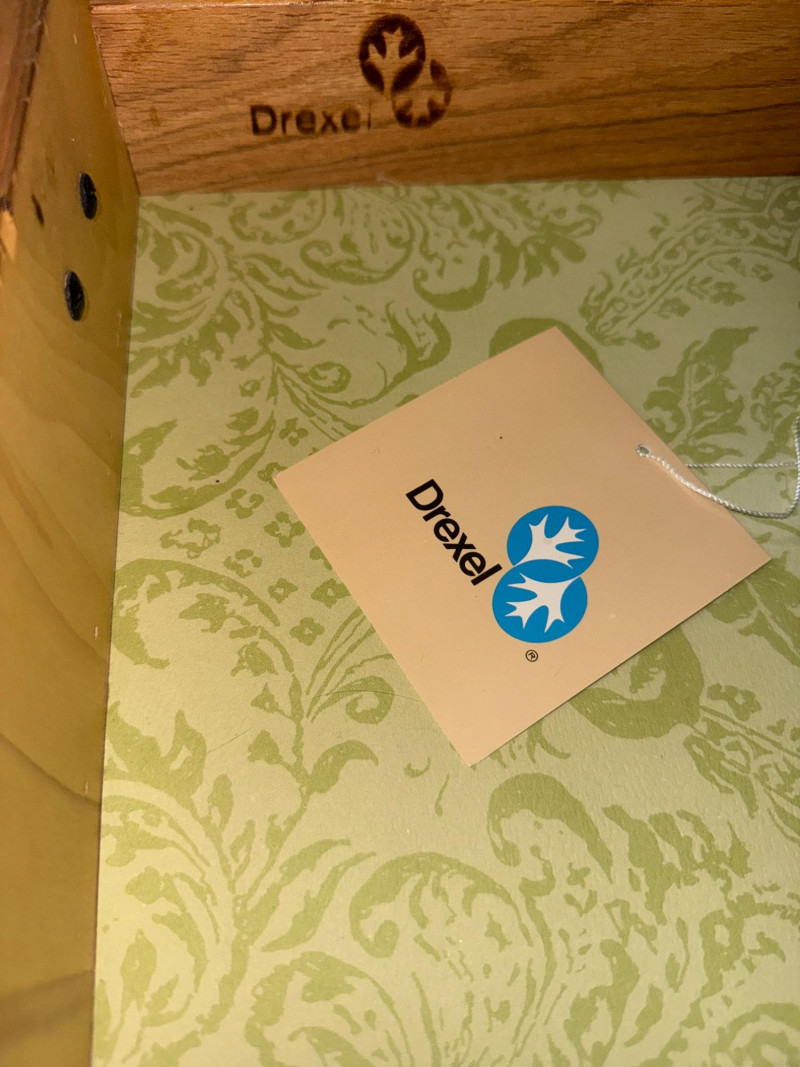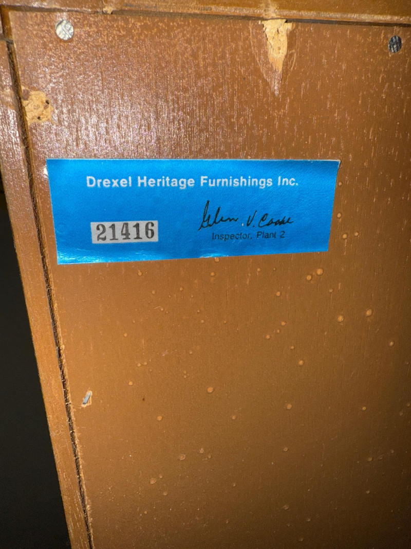 Elegant and functional, this Drexel Heritage Consensus Campaign Gentlemen's Dresser showcases the brand's renowned craftsmanship. Part of the "Consensus" line, it features a sturdy wooden construction with brass hardware accents. The dresser includes a spacious upper cabinet with a fold-out mirror and organizational drawers, perfect for accessories and essentials. Below, five smooth-gliding drawers offer ample storage for clothing and personal items. Key Features: Brand: Drexel Heritage, Consensus Collection Dimensions: 20.5" W x 16" D x 54" H Material: Solid wood with brass hardware Features: Upper cabinet with a fold-out mirror, multiple drawers for optimal storage Marked with original Drexel Heritage label and inspector signature
