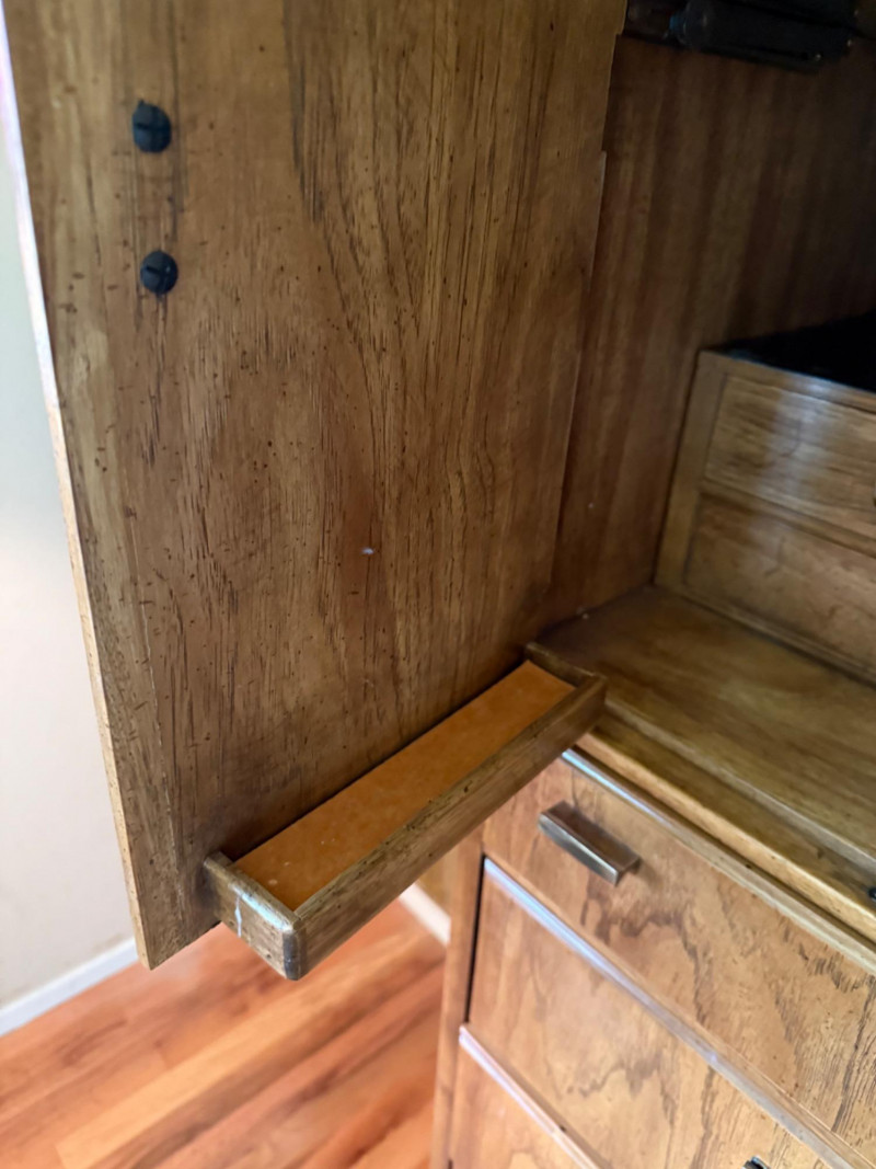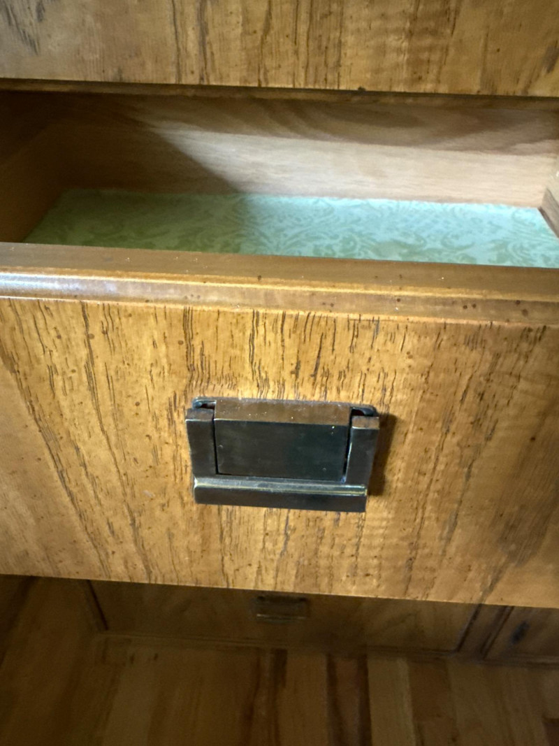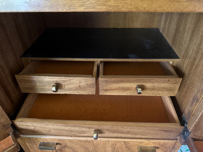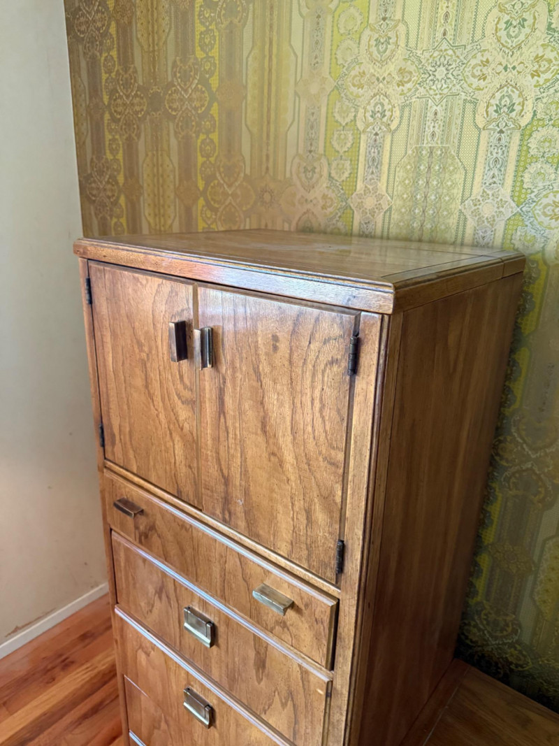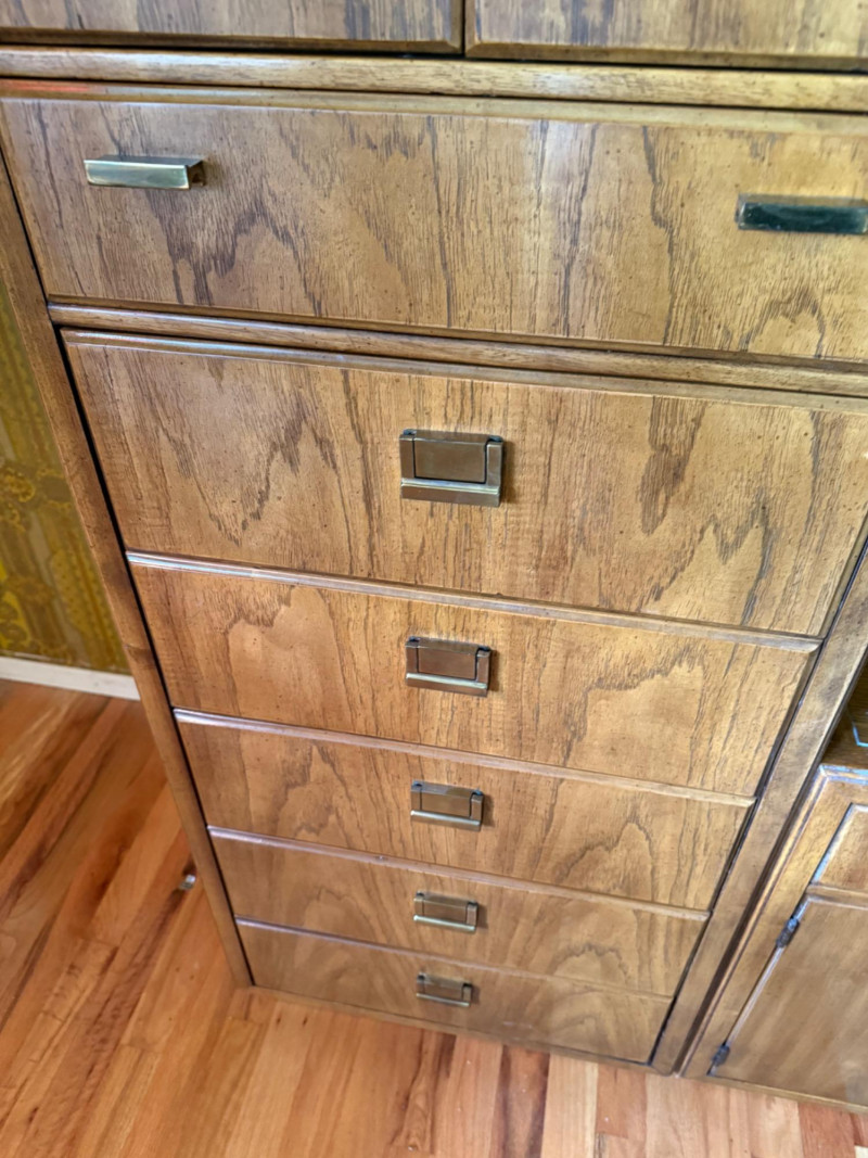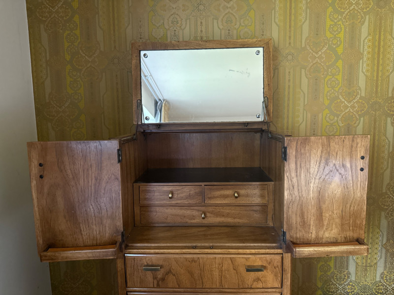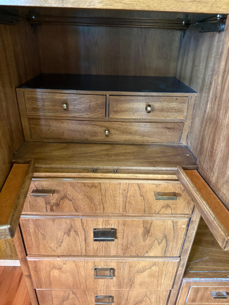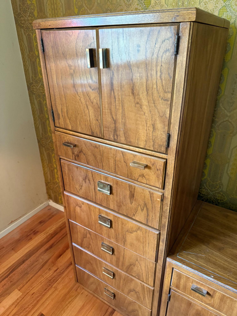 Elegant and functional, this Drexel Heritage Consensus Campaign Gentlemen's Dresser showcases the brand's renowned craftsmanship. Part of the "Consensus" line, it features a sturdy wooden construction with brass hardware accents. The dresser includes a spacious upper cabinet with a fold-out mirror and organizational drawers, perfect for accessories and essentials. Below, five smooth-gliding drawers offer ample storage for clothing and personal items. Key Features: Brand: Drexel Heritage, Consensus Collection Dimensions: 20.5" W x 16" D x 54" H Material: Solid wood with brass hardware Features: Upper cabinet with a fold-out mirror, multiple drawers for optimal storage Marked with original Drexel Heritage label and inspector signature