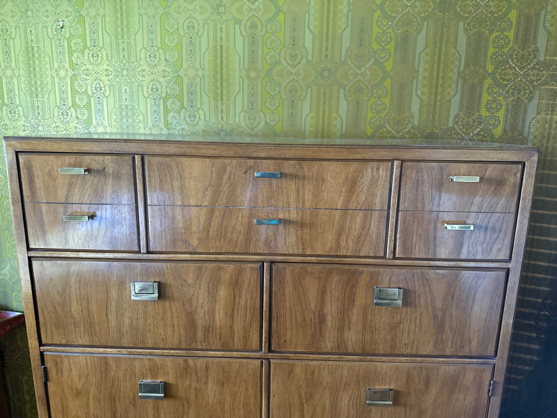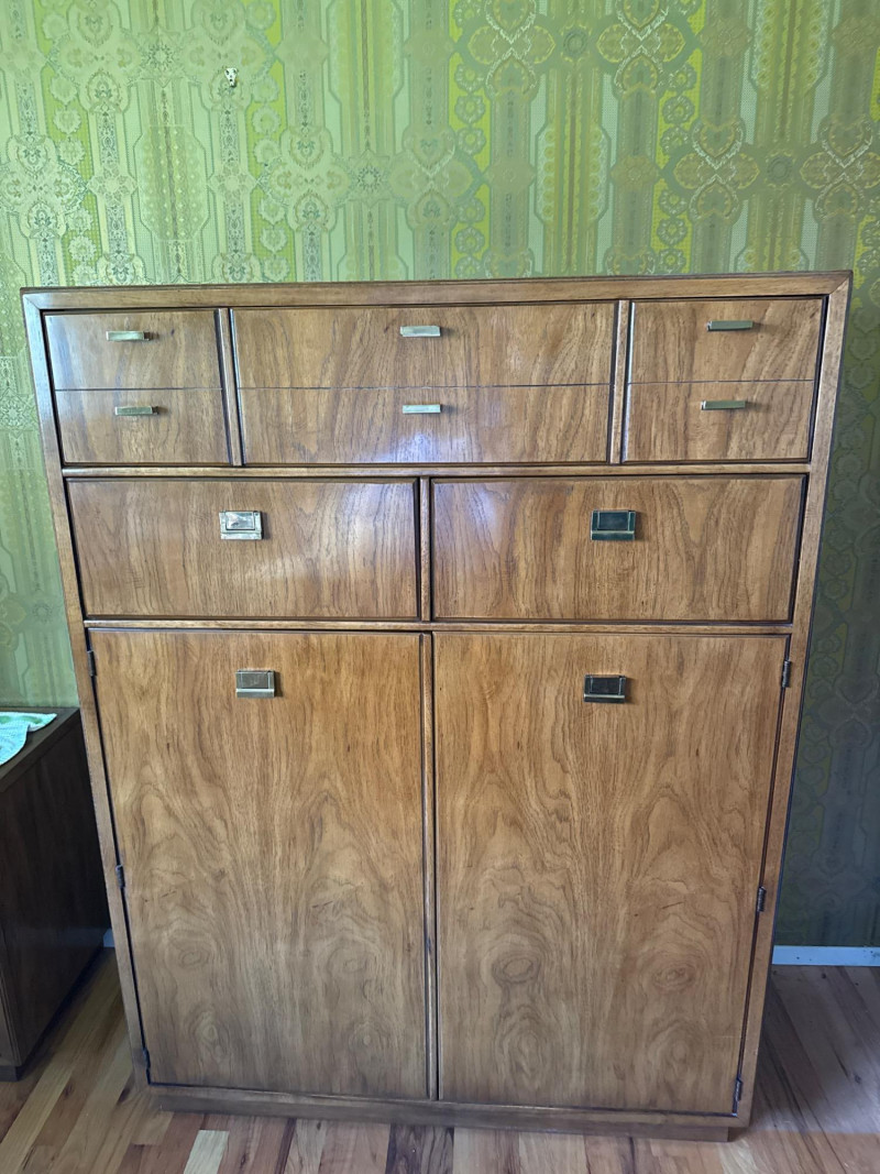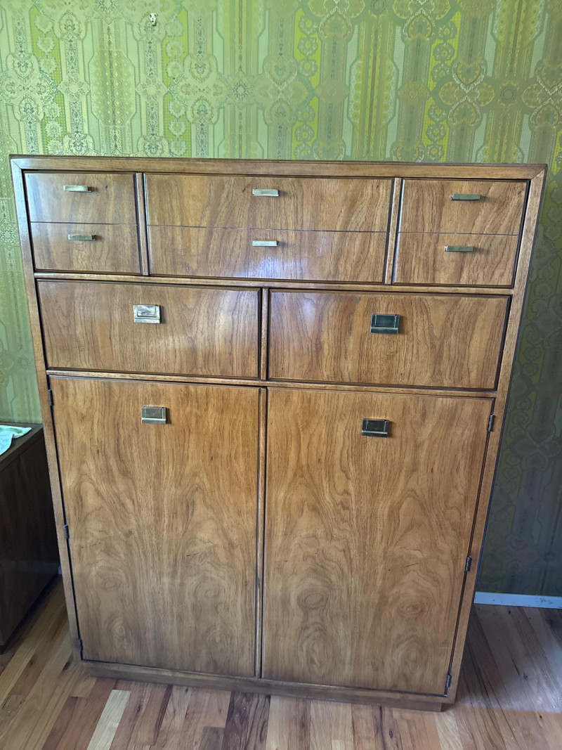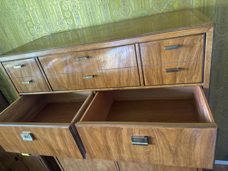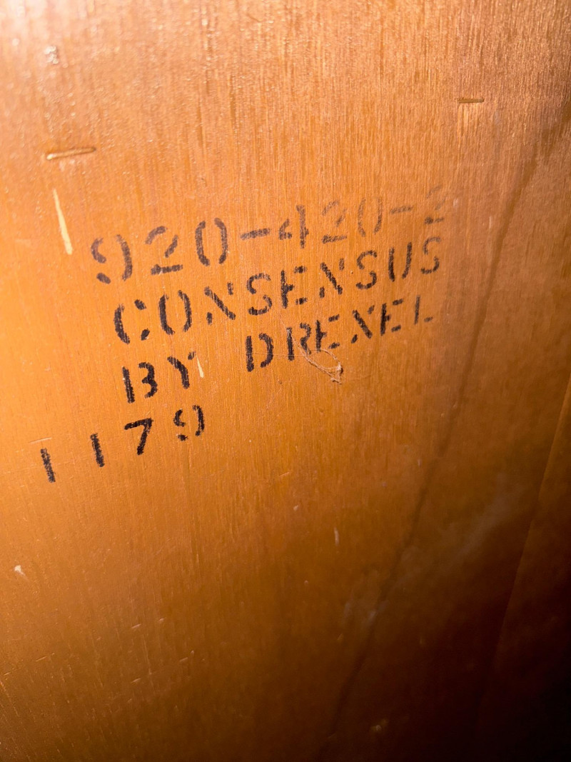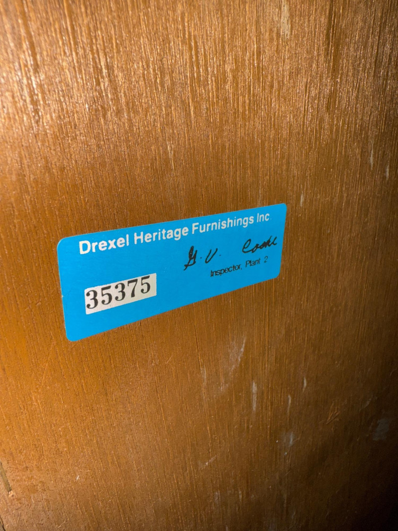 This striking Drexel Consensus Highboy Dresser features a solid wood construction with a rich walnut finish, emblematic of the iconic Drexel Heritage craftsmanship. The minimalist design is enhanced by clean lines, recessed paneling, and original brass hardware, offering both mid-century charm and modern functionality. The dresser includes multiple spacious drawers and cabinet compartments, ideal for organized storage. Marked with Drexel Heritage insignia and production details on the back, confirming its authenticity. A timeless piece that complements both vintage and contemporary interiors. Key Features: Maker: Drexel Heritage Model: Consensus Dimensions: 42” W x 18” D x 56” H Material: Walnut with brass hardware Multiple drawers and cabinet storage Stamped with Drexel Heritage mark