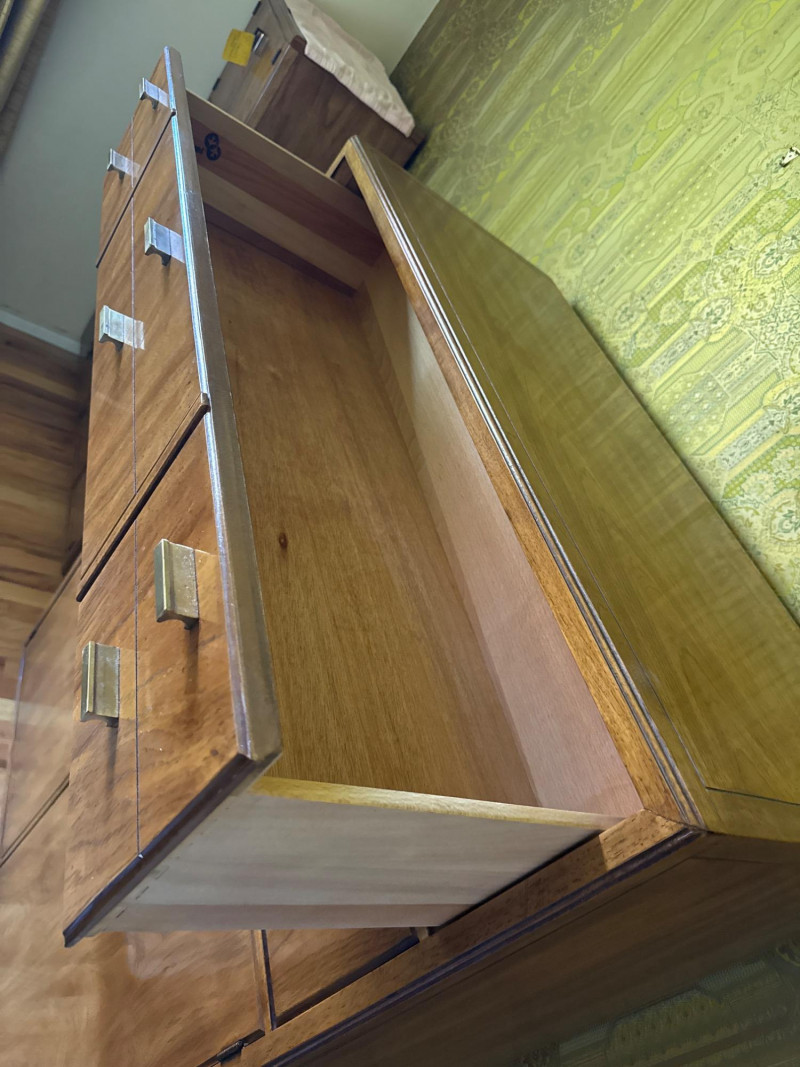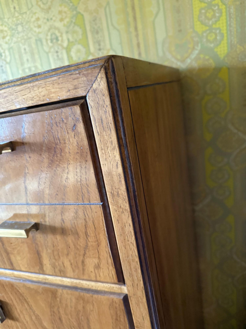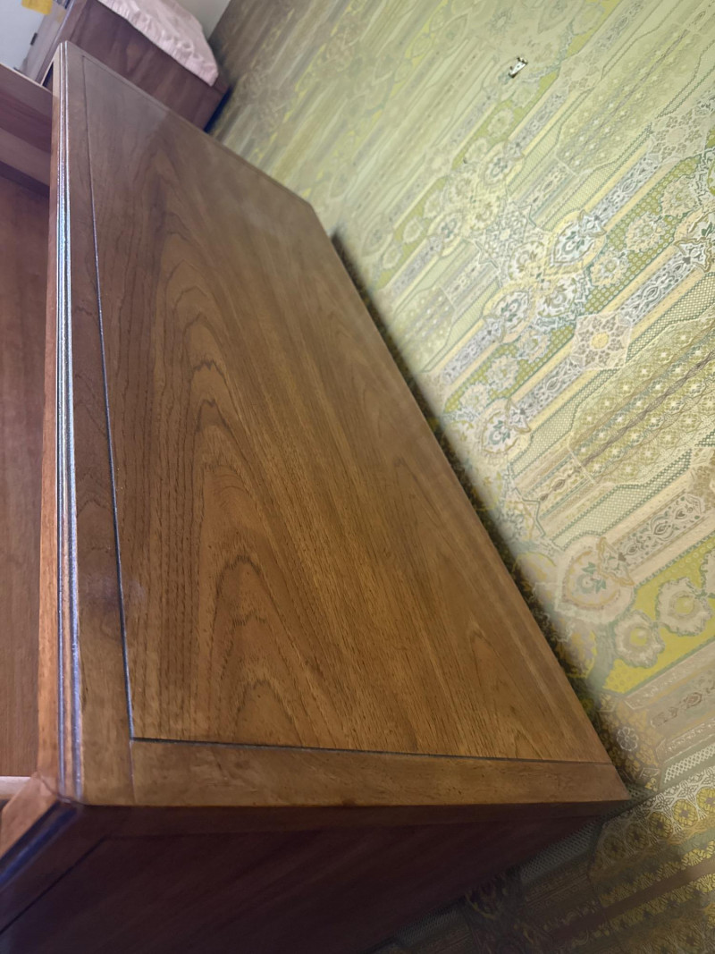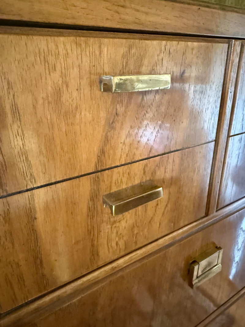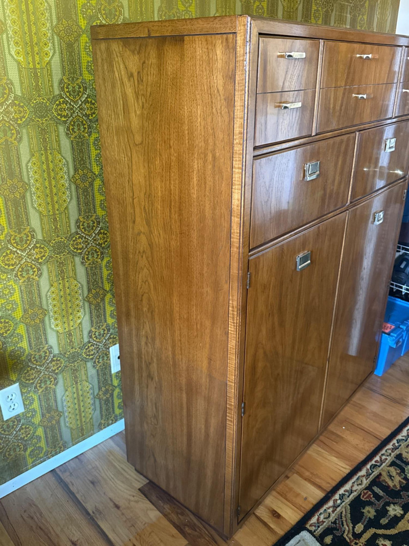 This striking Drexel Consensus Highboy Dresser features a solid wood construction with a rich walnut finish, emblematic of the iconic Drexel Heritage craftsmanship. The minimalist design is enhanced by clean lines, recessed paneling, and original brass hardware, offering both mid-century charm and modern functionality. The dresser includes multiple spacious drawers and cabinet compartments, ideal for organized storage. Marked with Drexel Heritage insignia and production details on the back, confirming its authenticity. A timeless piece that complements both vintage and contemporary interiors. Key Features: Maker: Drexel Heritage Model: Consensus Dimensions: 42” W x 18” D x 56” H Material: Walnut with brass hardware Multiple drawers and cabinet storage Stamped with Drexel Heritage mark