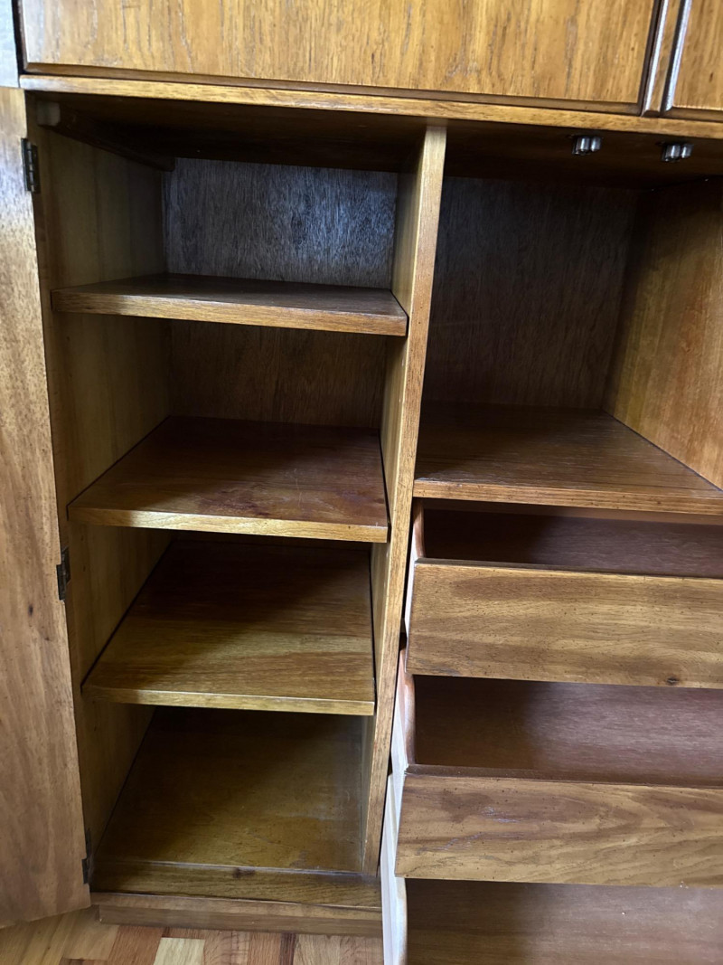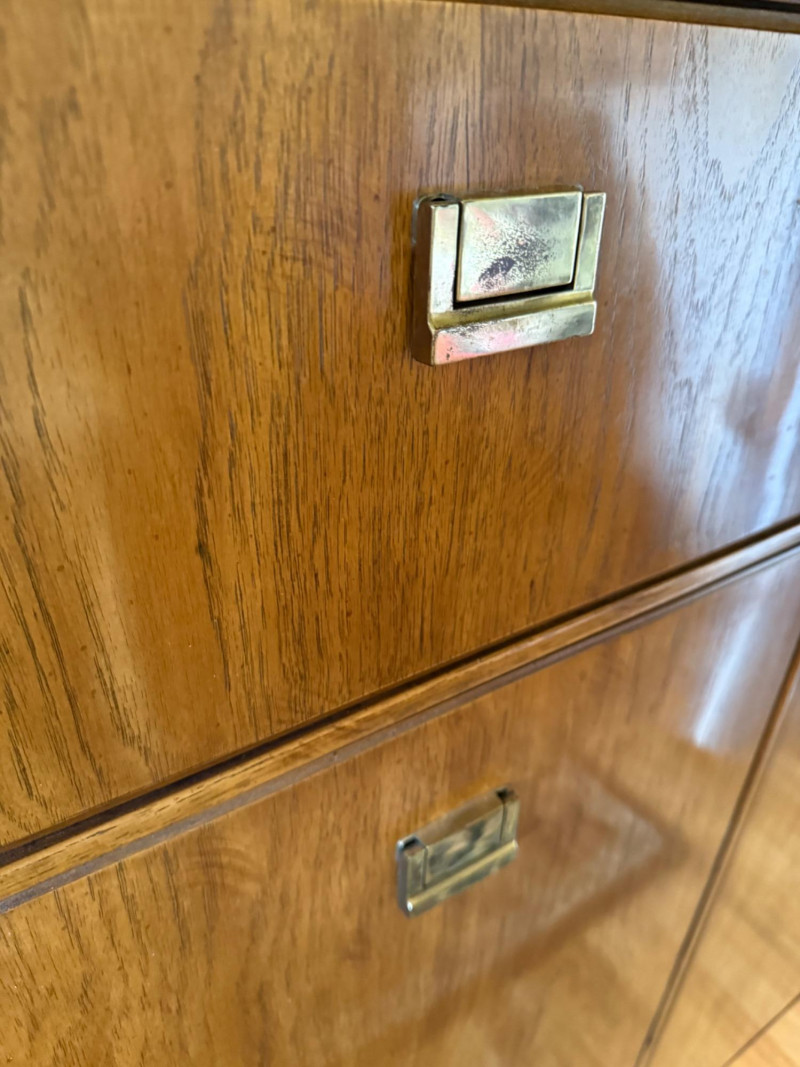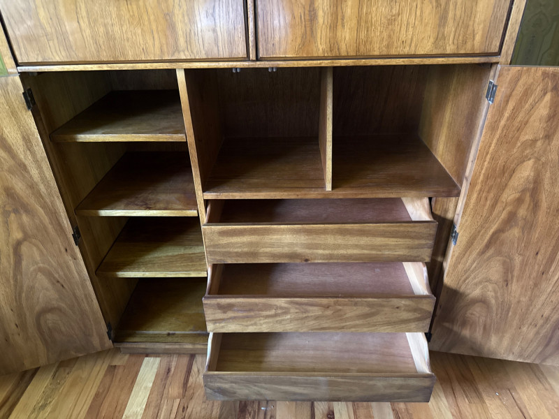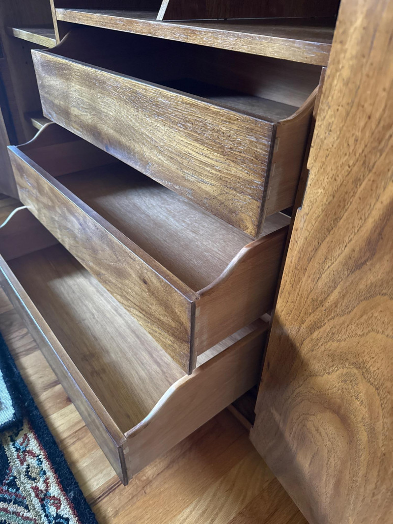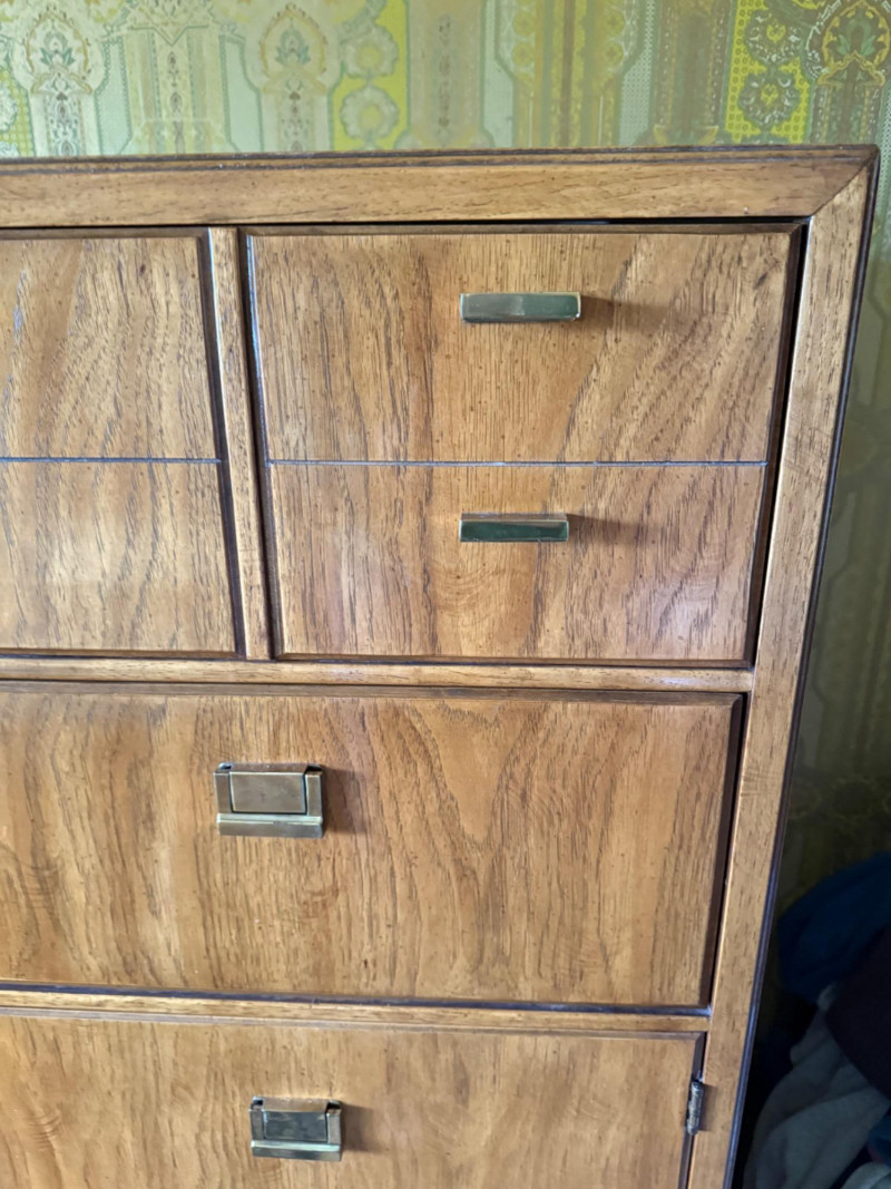 This striking Drexel Consensus Highboy Dresser features a solid wood construction with a rich walnut finish, emblematic of the iconic Drexel Heritage craftsmanship. The minimalist design is enhanced by clean lines, recessed paneling, and original brass hardware, offering both mid-century charm and modern functionality. The dresser includes multiple spacious drawers and cabinet compartments, ideal for organized storage. Marked with Drexel Heritage insignia and production details on the back, confirming its authenticity. A timeless piece that complements both vintage and contemporary interiors. Key Features: Maker: Drexel Heritage Model: Consensus Dimensions: 42” W x 18” D x 56” H Material: Walnut with brass hardware Multiple drawers and cabinet storage Stamped with Drexel Heritage mark