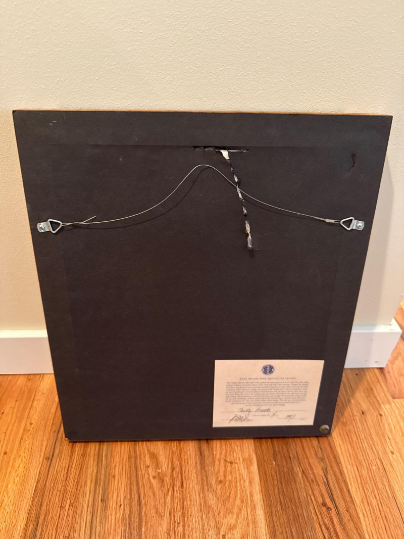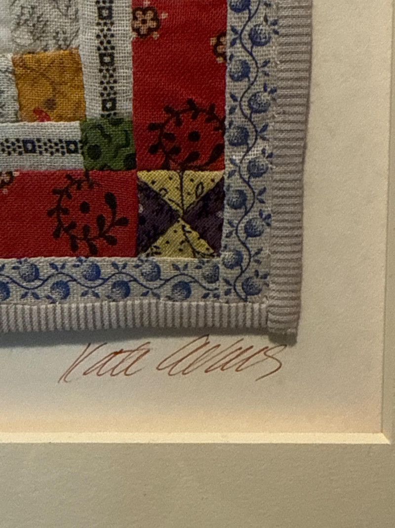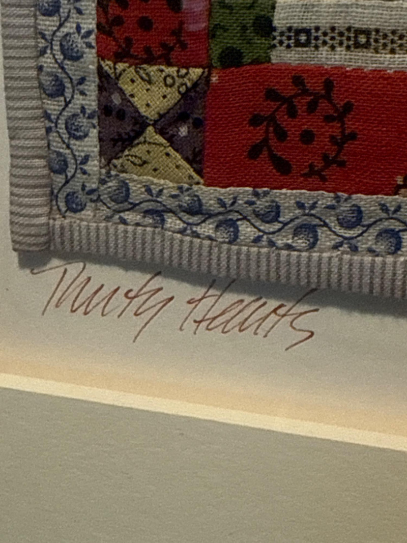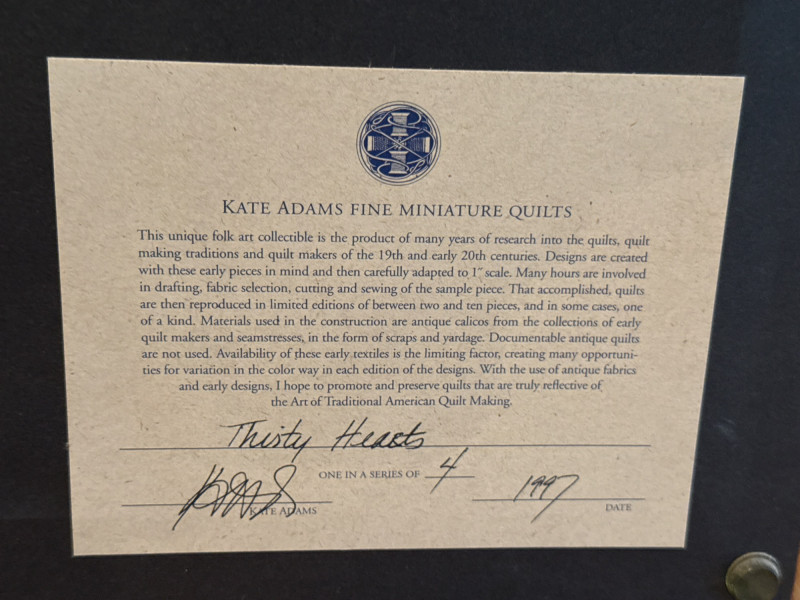 A beautifully crafted miniature quilt art piece titled "Thirty Hearts," created by artist Kate Adams in 1997. This folk art collectible showcases a stunning arrangement of heart patterns in a variety of vintage fabrics, meticulously quilted and bordered with vibrant calico prints. The piece is a part of the Kate Adams Fine Miniature Quilts series, known for its dedication to preserving traditional American quilt-making techniques. This limited-edition artwork is numbered 4 of 4, making it a rare find for collectors. The quilt is elegantly framed in a textured wood frame that enhances its rustic charm, ready for display. Key Features: Title: "Thirty Hearts" Artist: Kate Adams Year: 1997 Edition: 4 of 4 Medium: Miniature Quilt Frame: Textured Wood Authenticity: Includes artist signature and certificate of authenticity