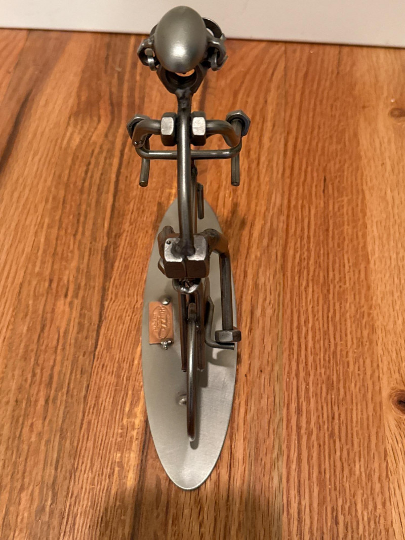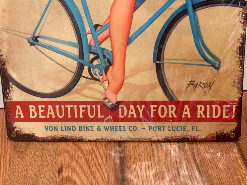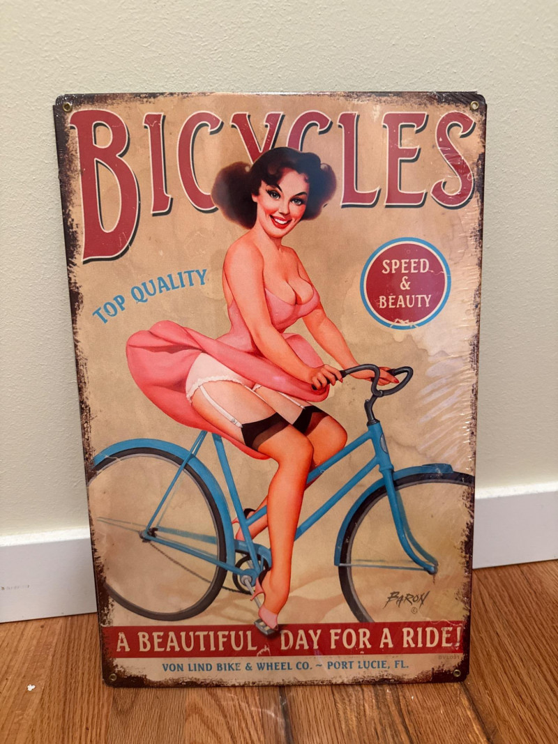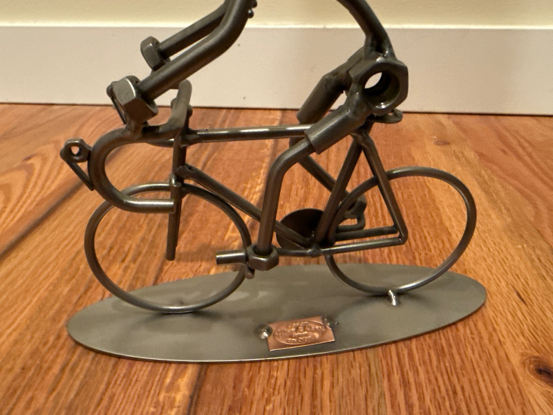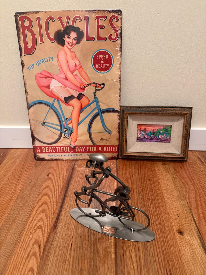 This unique collection celebrates the spirit of cycling with a blend of vintage and contemporary pieces. The set includes: Vintage Bicycles Metal Sign — Evoking the charm of the golden era of cycling, this embossed metal sign features vibrant pin-up artwork and classic typography, perfect for adding retro flair to any space. 17.5in tall, 11.5in wide Framed Acrylic Painting by Lila Brown — Titled "The Cyclist," this original artwork captures a vivid portrayal of cyclists racing through a scenic landscape, framed in rustic wood. 9.5in long, 7.5in tall Hinz & Kunst Metal Sculpture — Handcrafted in Germany, this metal cyclist sculpture from Hinz & Kunst embodies the dynamism of cycling with intricate wirework and fine detailing, mounted on a sturdy base with a brass nameplate. 8in tall, 8in long