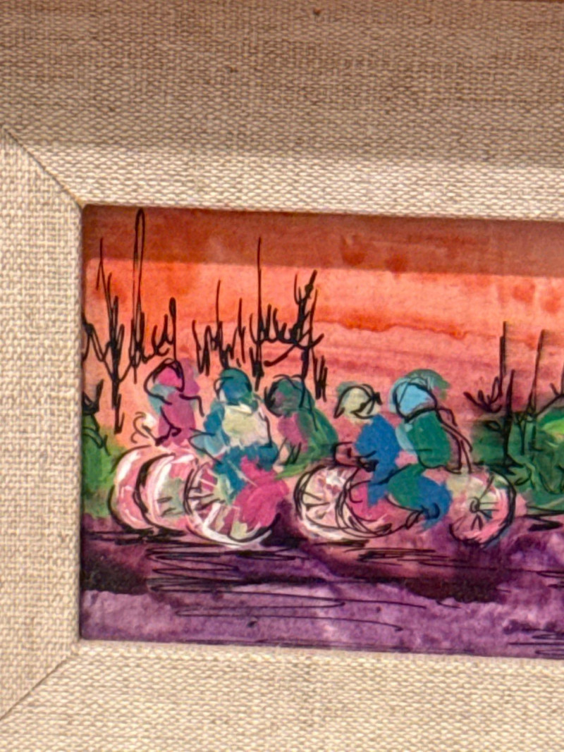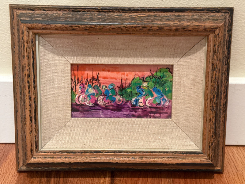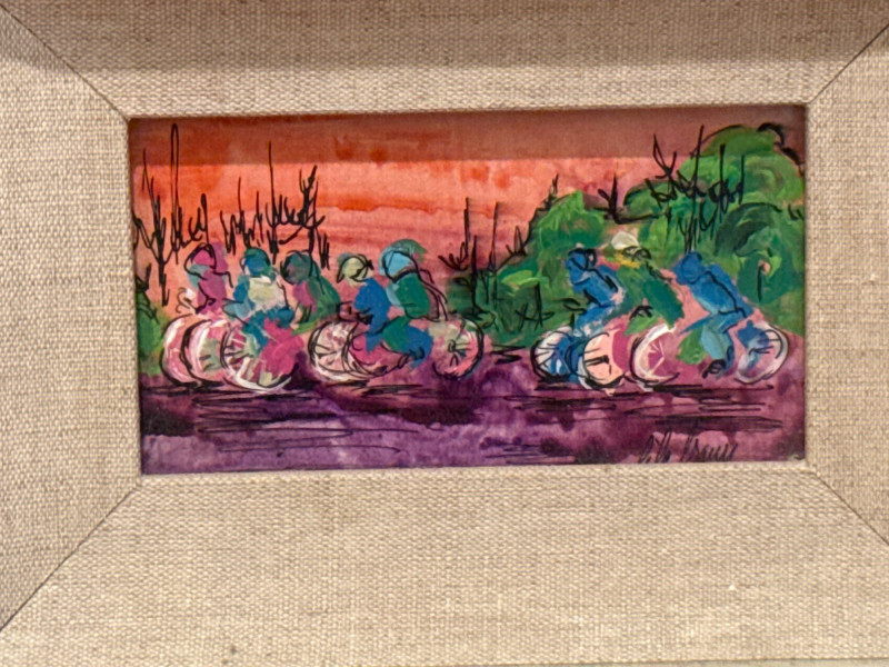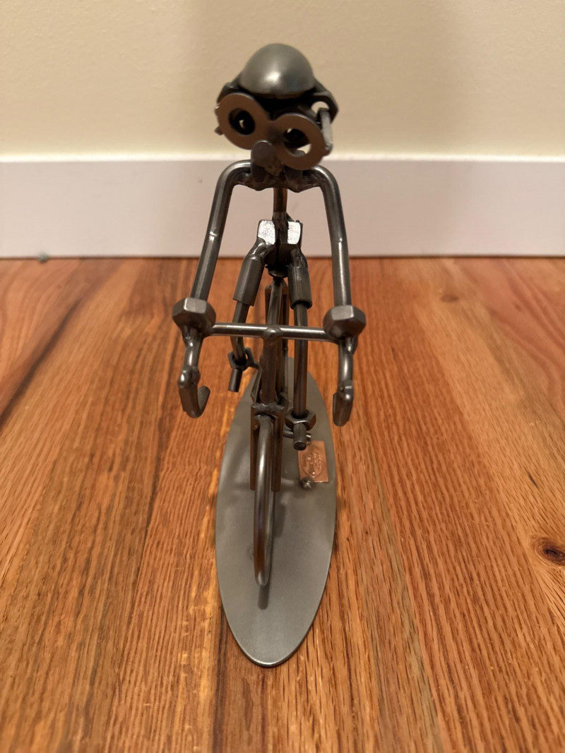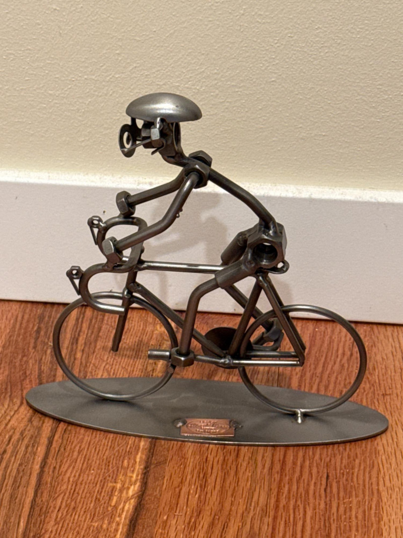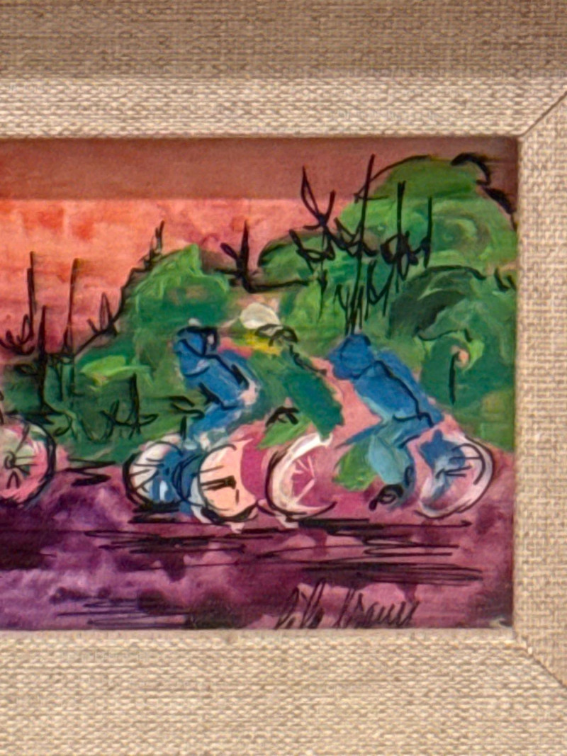 This unique collection celebrates the spirit of cycling with a blend of vintage and contemporary pieces. The set includes: Vintage Bicycles Metal Sign — Evoking the charm of the golden era of cycling, this embossed metal sign features vibrant pin-up artwork and classic typography, perfect for adding retro flair to any space. 17.5in tall, 11.5in wide Framed Acrylic Painting by Lila Brown — Titled "The Cyclist," this original artwork captures a vivid portrayal of cyclists racing through a scenic landscape, framed in rustic wood. 9.5in long, 7.5in tall Hinz & Kunst Metal Sculpture — Handcrafted in Germany, this metal cyclist sculpture from Hinz & Kunst embodies the dynamism of cycling with intricate wirework and fine detailing, mounted on a sturdy base with a brass nameplate. 8in tall, 8in long