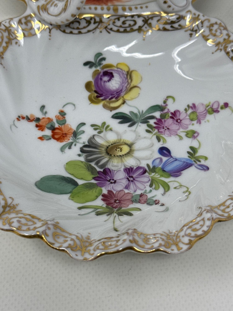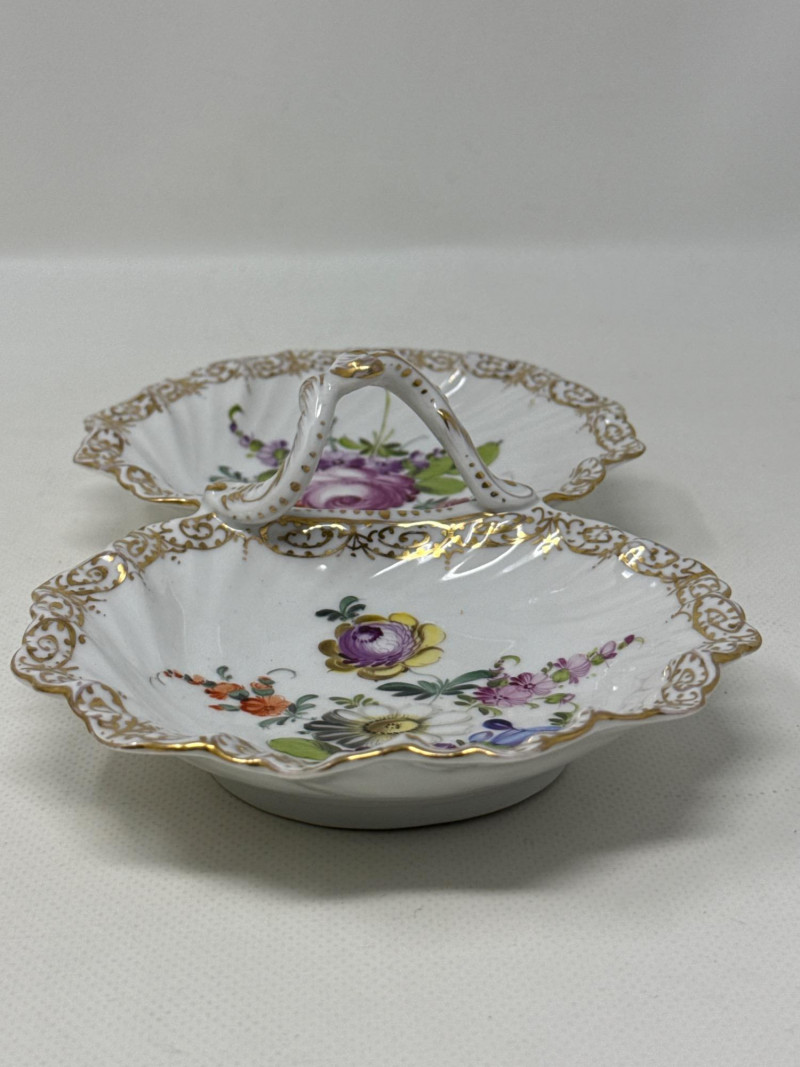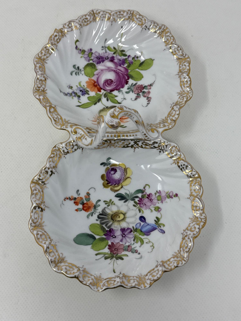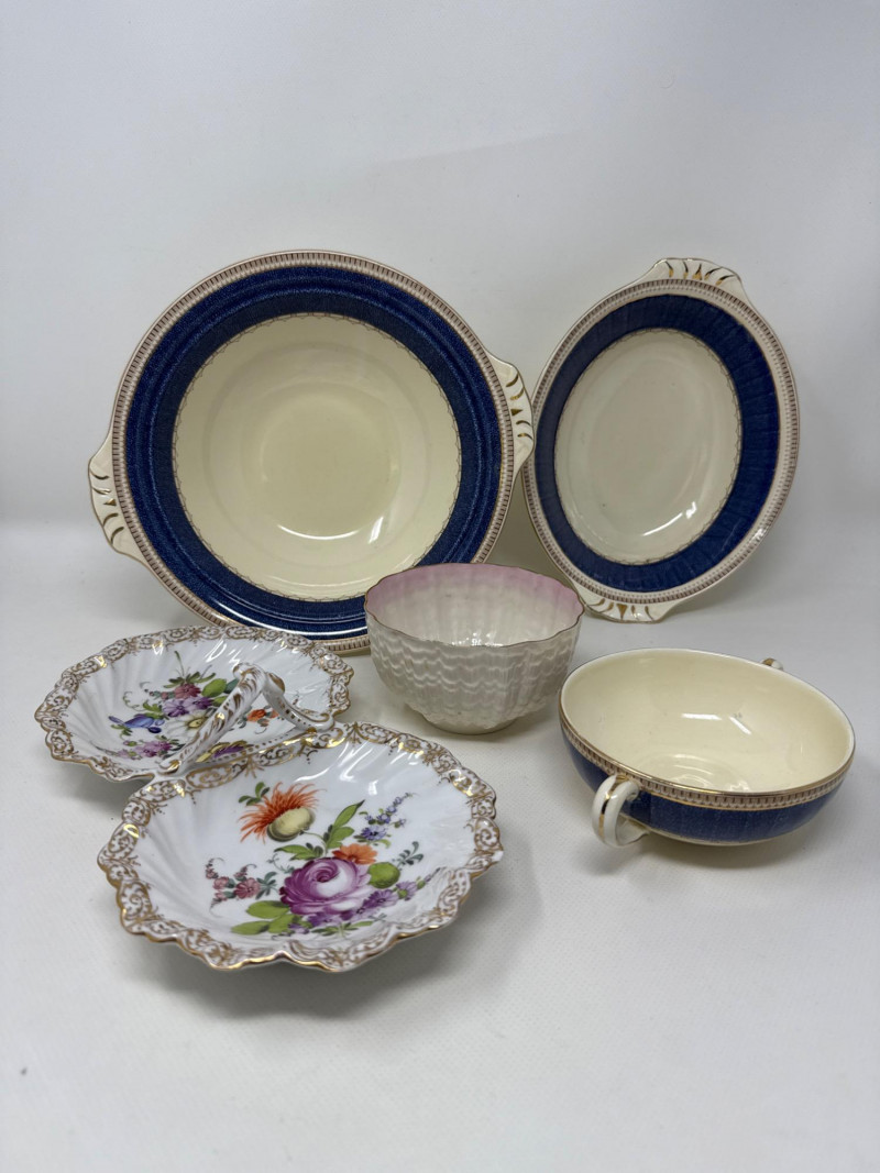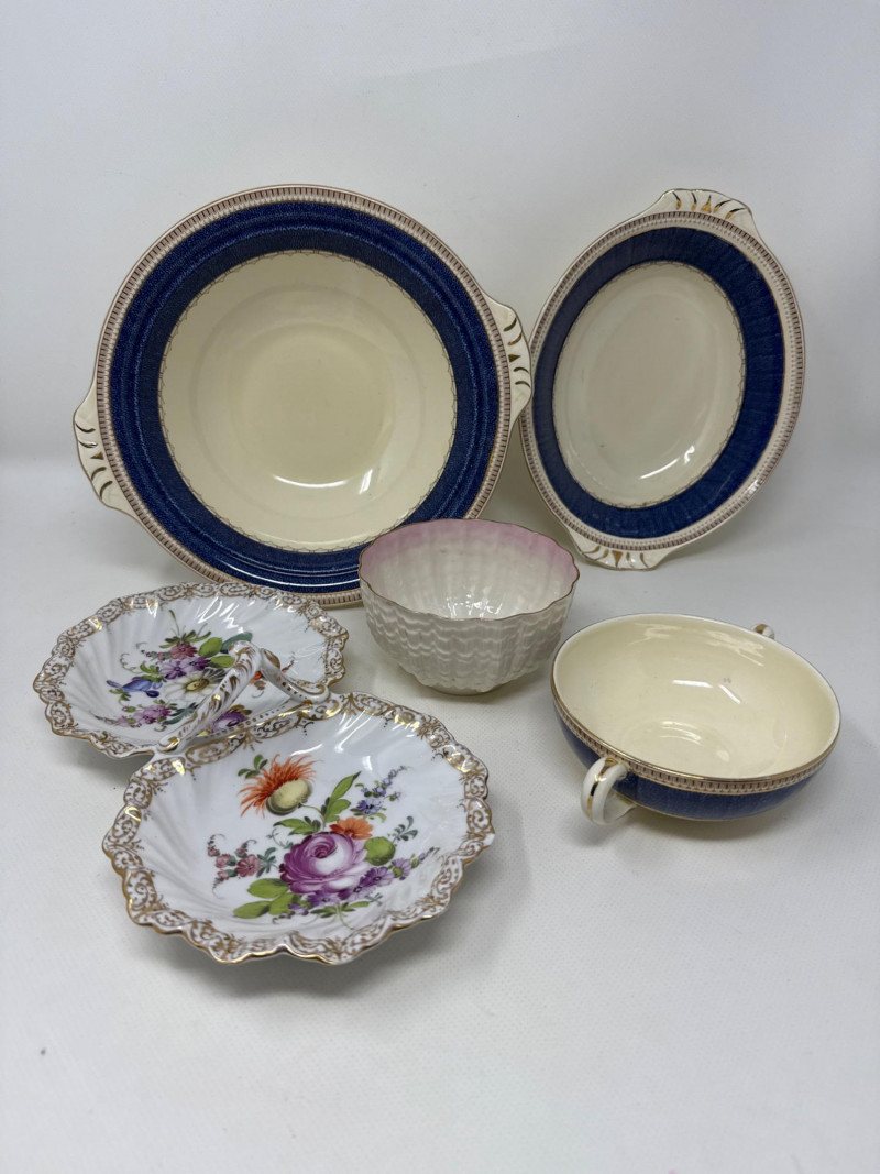 An exquisite assortment of fine porcelain pieces featuring iconic makers such as Balek, Dresden, and Melrose. This collection includes: Dresden Floral Divided Dish (DBL) – A stunning double-compartment porcelain dish adorned with vibrant hand-painted floral motifs and ornate gold gilding. The intricate scalloped edges and elegant handle showcase Dresden's signature craftsmanship. Measures 10.5" x 3" T x 5.5" W. Belleek Textured Bowl – Delicately crafted with a basketweave pattern, this Belleek porcelain bowl features a soft pink rim accentuated with fine gold trim. Very delicate Melrose Grindley Serving Bowls and Handled Dish – Featuring deep cobalt blue accents with ornate gold embellishments, this handled dish is marked "Melrose Grindley England," displaying its rich heritage and timeless design. One round and one oval serving dish.