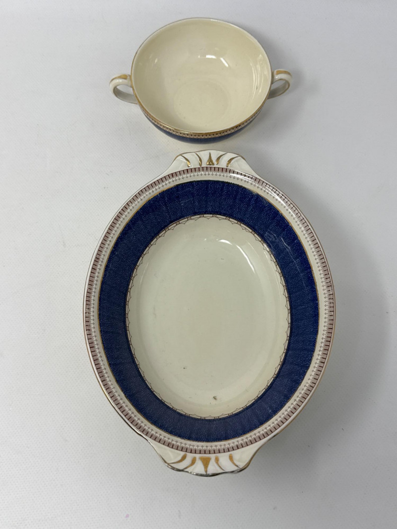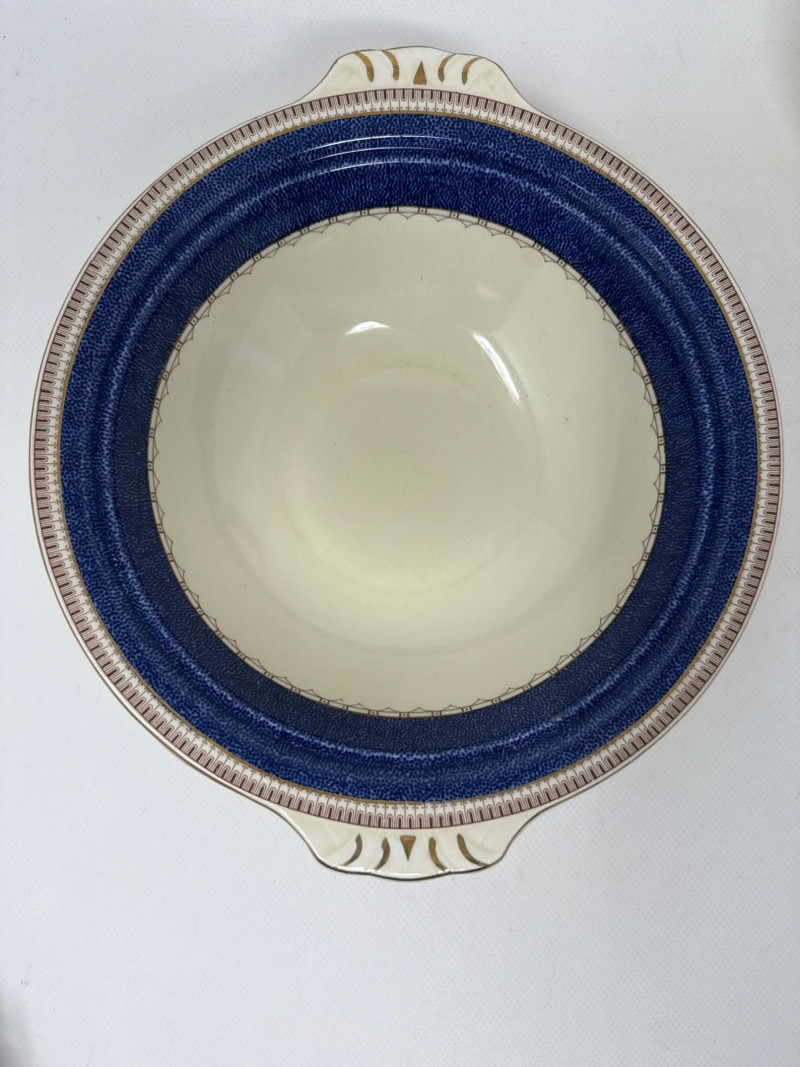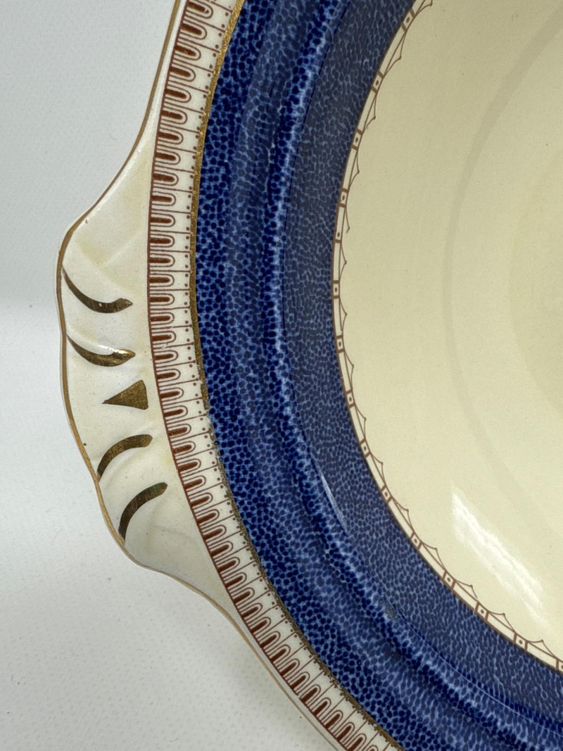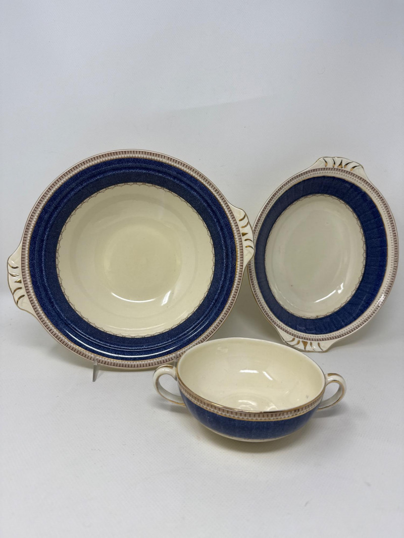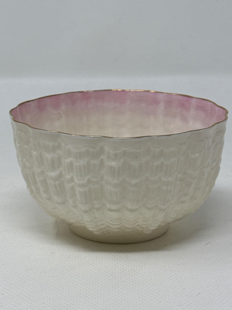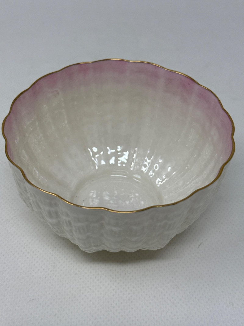 An exquisite assortment of fine porcelain pieces featuring iconic makers such as Balek, Dresden, and Melrose. This collection includes: Dresden Floral Divided Dish (DBL) – A stunning double-compartment porcelain dish adorned with vibrant hand-painted floral motifs and ornate gold gilding. The intricate scalloped edges and elegant handle showcase Dresden's signature craftsmanship. Measures 10.5" x 3" T x 5.5" W. Belleek Textured Bowl – Delicately crafted with a basketweave pattern, this Belleek porcelain bowl features a soft pink rim accentuated with fine gold trim. Very delicate Melrose Grindley Serving Bowls and Handled Dish – Featuring deep cobalt blue accents with ornate gold embellishments, this handled dish is marked "Melrose Grindley England," displaying its rich heritage and timeless design. One round and one oval serving dish.