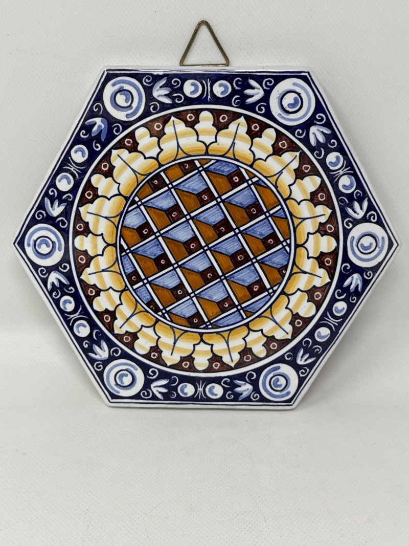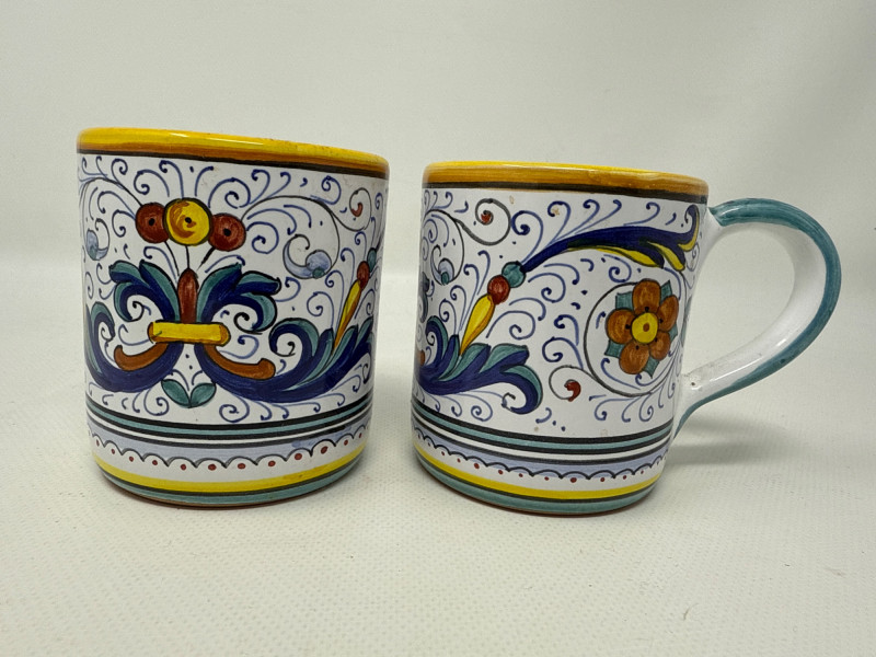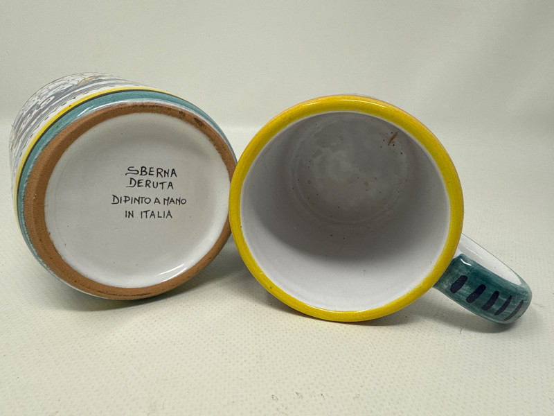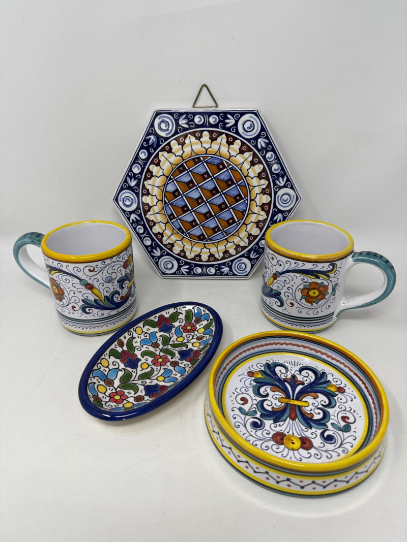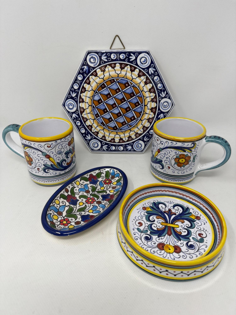 This vibrant Italian ceramic collection includes hand-painted Deruta mugs, a matching bottle coaster, an oval floral tray, and a decorative tile plaque, all showcasing intricate floral and scroll designs in bold blues, reds, yellows, and greens. The hexagonal wall plaque is marked "Ceramiche Boschi Faenza," reflecting traditional Italian craftsmanship with its geometric lattice and floral border. Both mugs and the bottle coaster are signed "Sberna Deruta, Dipinto a Mano in Italia," a testament to their artisan heritage. Set Includes: 2 Hand-Painted Mugs (Deruta) 1 Floral Oval Tray 1 Bottle Coaster 1 Hexagonal Wall Plaque (Ceramiche Boschi Faenza) Key Features: Hand-painted Italian ceramics Artisan signatures from Deruta and Faenza Vibrant floral and geometric patterns