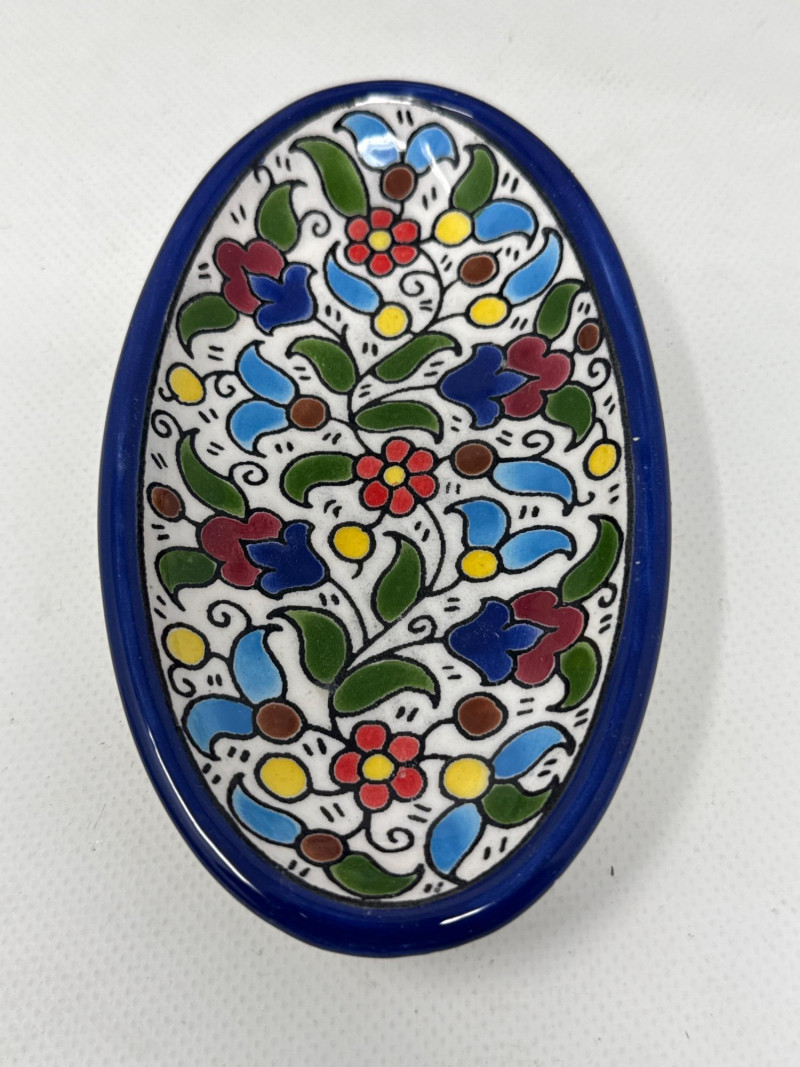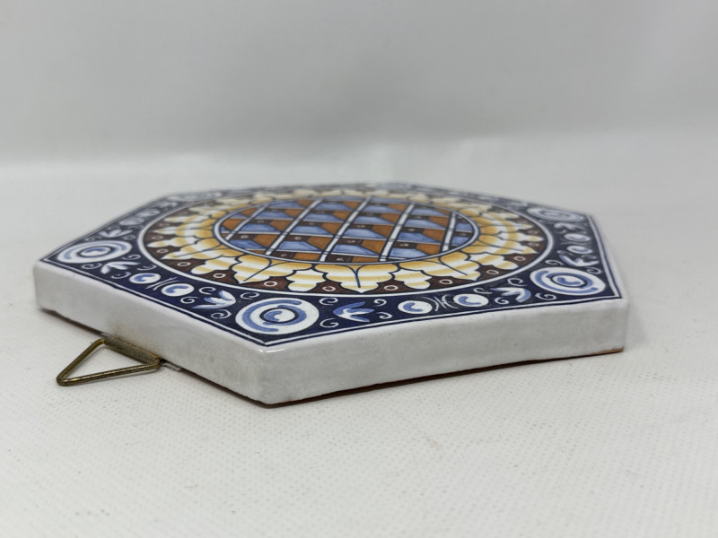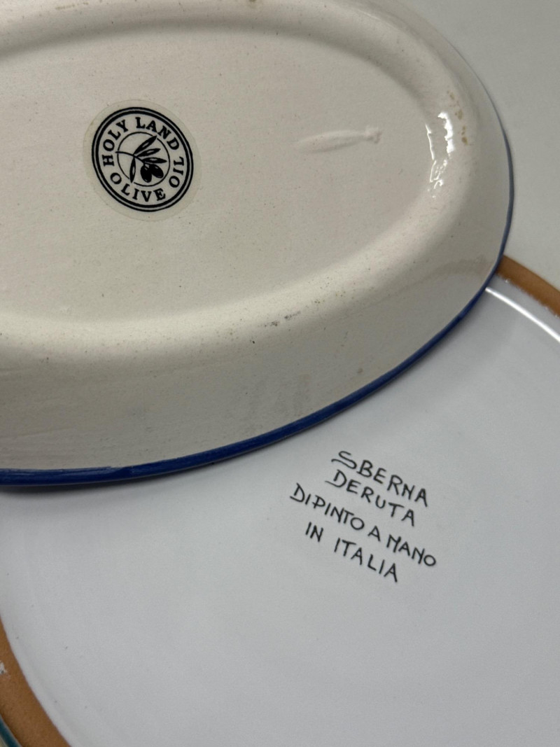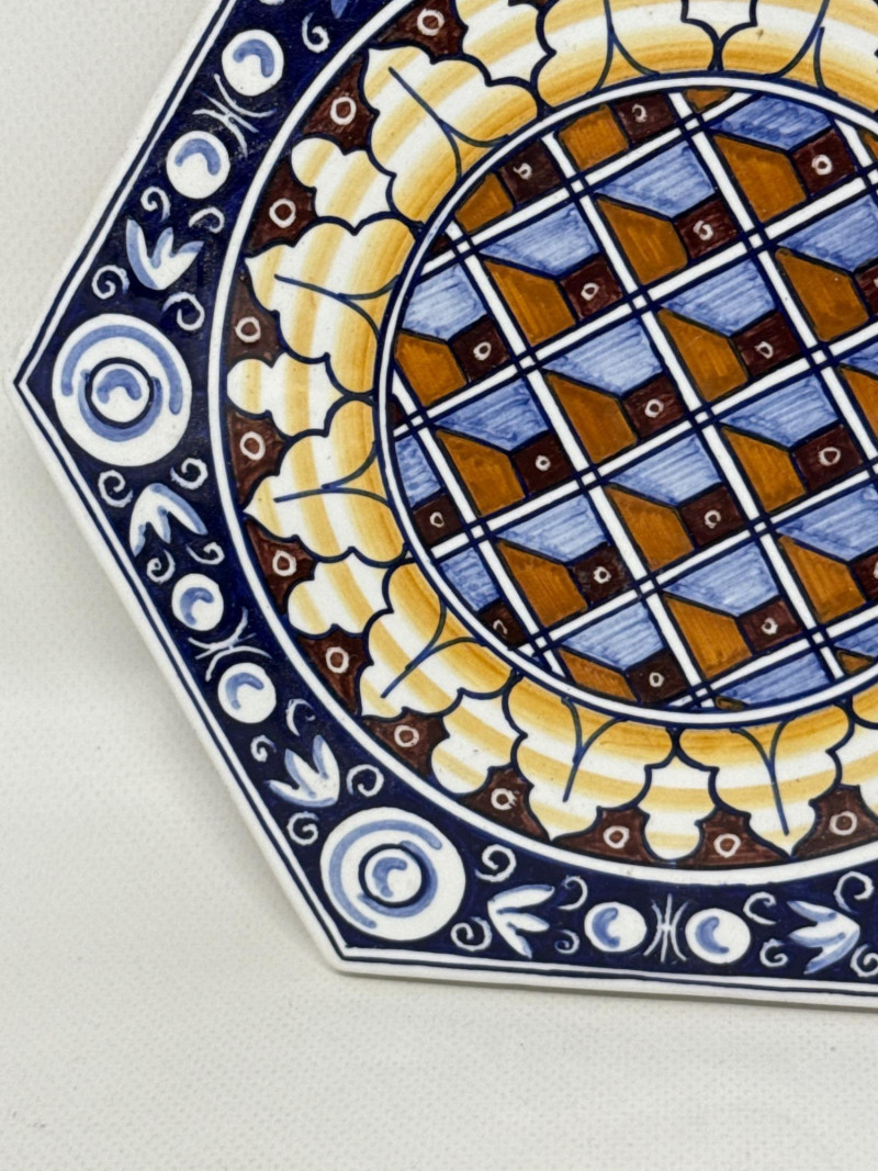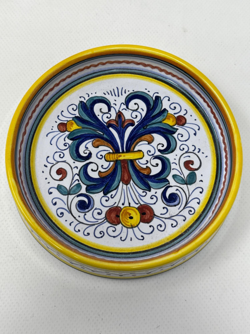 This vibrant Italian ceramic collection includes hand-painted Deruta mugs, a matching bottle coaster, an oval floral tray, and a decorative tile plaque, all showcasing intricate floral and scroll designs in bold blues, reds, yellows, and greens. The hexagonal wall plaque is marked "Ceramiche Boschi Faenza," reflecting traditional Italian craftsmanship with its geometric lattice and floral border. Both mugs and the bottle coaster are signed "Sberna Deruta, Dipinto a Mano in Italia," a testament to their artisan heritage. Set Includes: 2 Hand-Painted Mugs (Deruta) 1 Floral Oval Tray 1 Bottle Coaster 1 Hexagonal Wall Plaque (Ceramiche Boschi Faenza) Key Features: Hand-painted Italian ceramics Artisan signatures from Deruta and Faenza Vibrant floral and geometric patterns