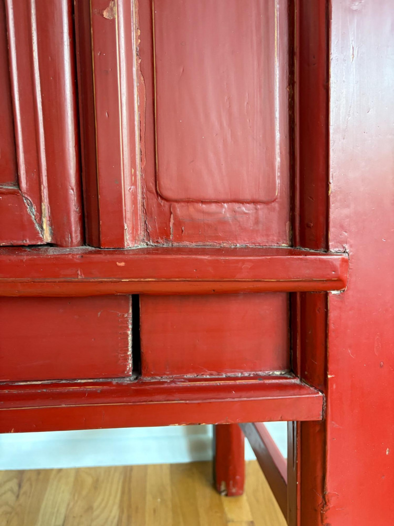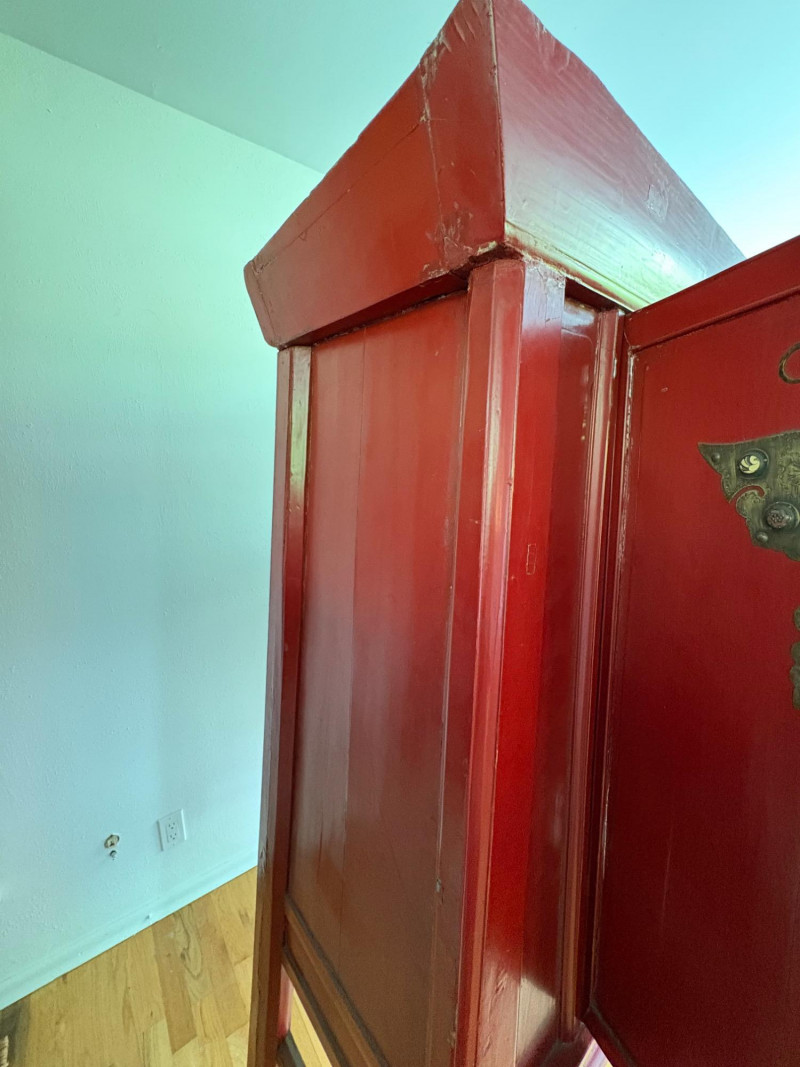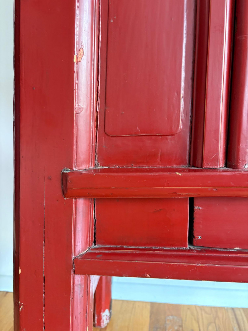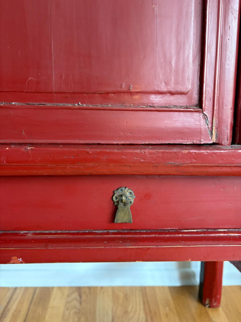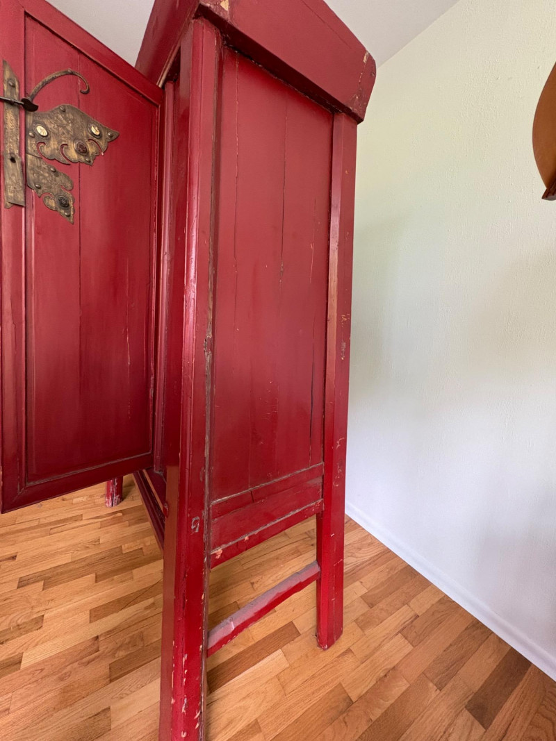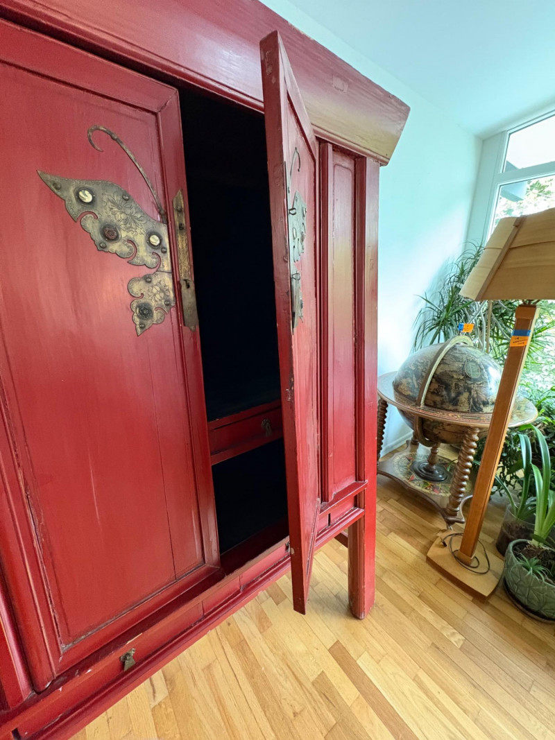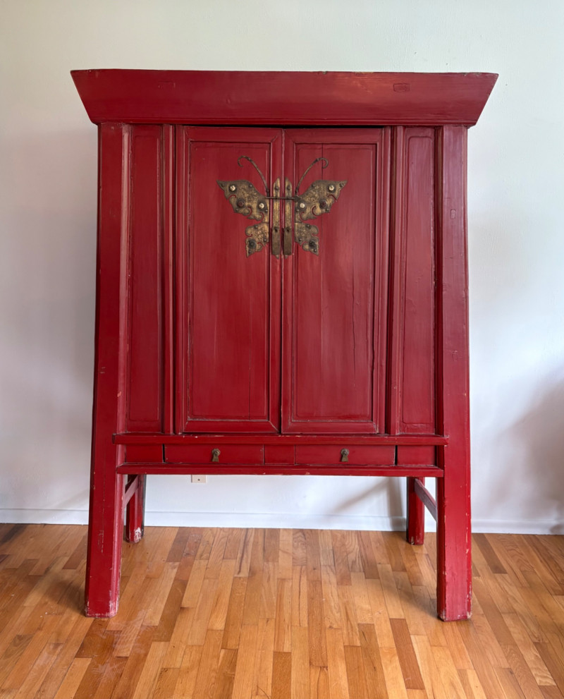 Large-size red antique Chinese butterfly cabinet. When purchased at a Seattle antique store many years ago, the client was told it was a couple hundred years old. We are unable to verify that, but the wood that isn't lacquered is definitely very old and the cabinet appears to have been assembled almost completely with wood joinery except for the metal butterfly motif on the front. Measures just over 69" H and wears its age proudly - lots of cracks and gaps, but still very sturdy and we believe the lack of perfection gives it great character. The client used to display sculptures between the legs and on top of the cabinet. Sides gently slope outward as they go down - both on the width measurement and the depth measurement. From the front, the cabinet measures approx. 42" wide at the top below the cornice piece and flares out to 52" where the legs meet the floor. (Cornice piece measures approx. 48" side to side.) From the side, the cabinet measures approx. 18.5" at the top below the cornice piece and flares out to 23" where the legs meet the floor. This tapered effect makes the cabinet seem to float. There are 2 central swing-out doors that conceal 2 shelves in the black interior along with 2 drawers under the top shelf. There are 2 additional drawers below the apron; all drawers have metal pulls. Swing-out doors have latch pin at the butterfly's head. The butterfly is incised and also has inset decorations that are lovely. Great piece that really shows off its age with class. Local Pickup Only. Bidding on this lot is an agreement that: (1.) You will have 2 capable, able-bodied persons to lift and load at a minimum. (2.) You will bring a hand truck and/or any other tools needed to remove this item. If these steps are not followed your item will be forfeited and no refund given.