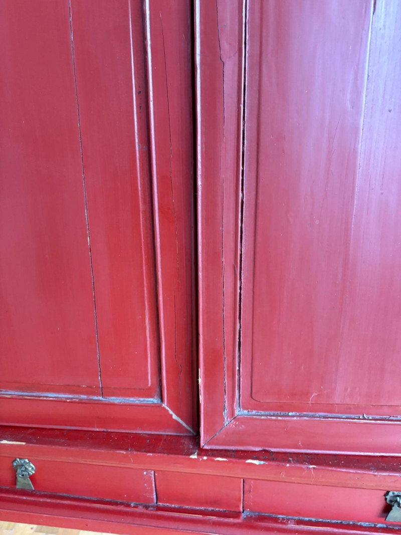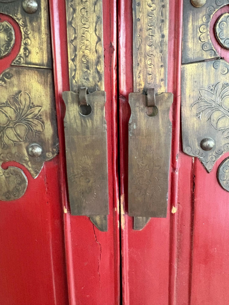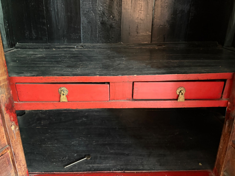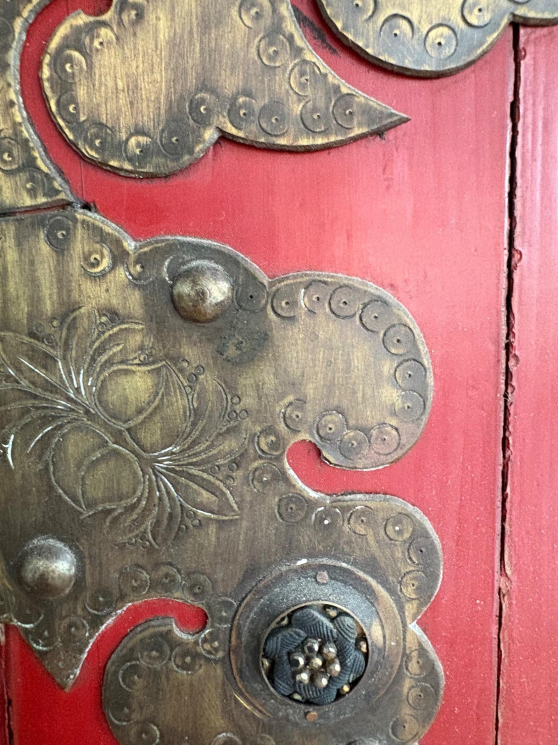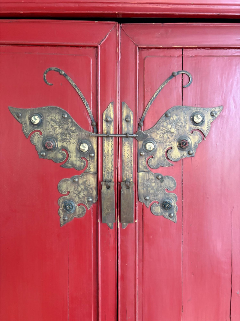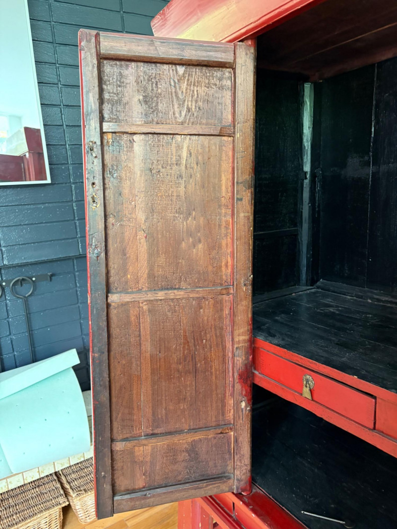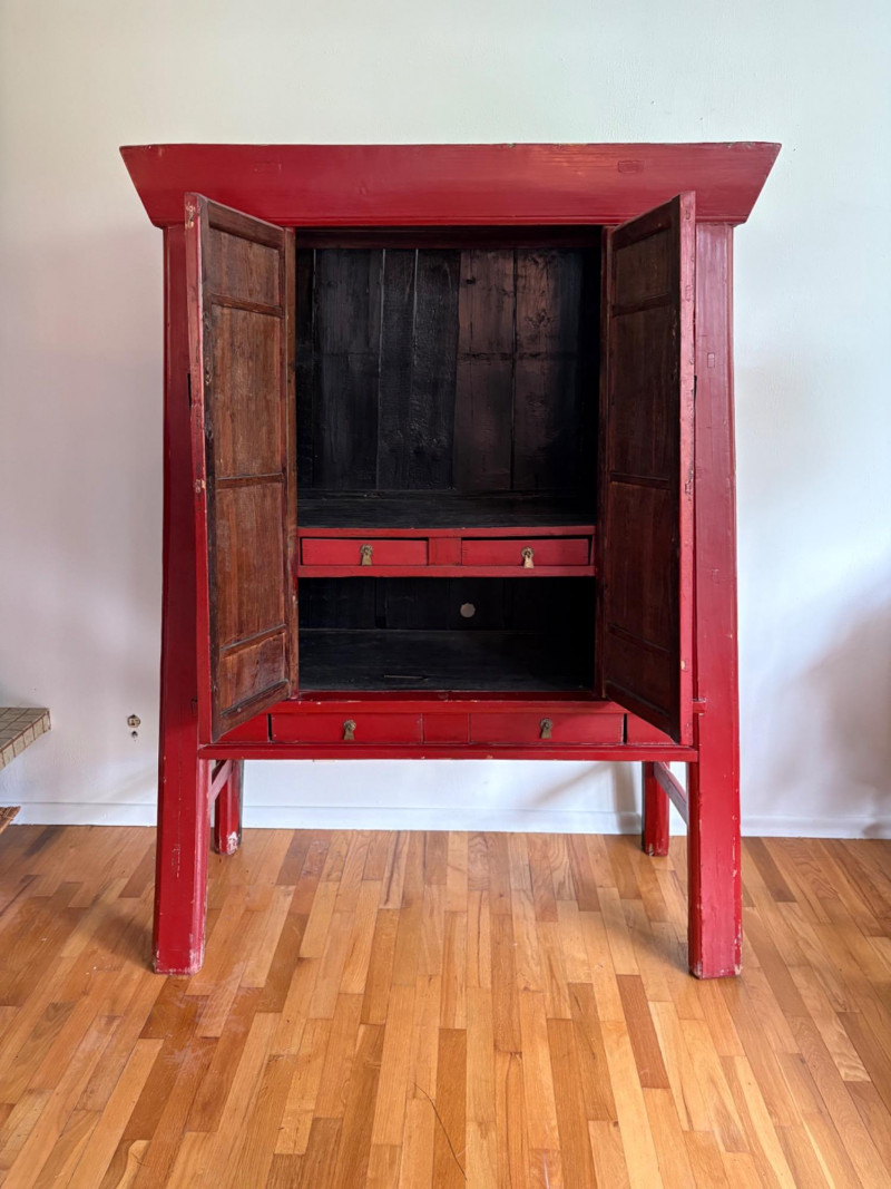 Large-size red antique Chinese butterfly cabinet. When purchased at a Seattle antique store many years ago, the client was told it was a couple hundred years old. We are unable to verify that, but the wood that isn't lacquered is definitely very old and the cabinet appears to have been assembled almost completely with wood joinery except for the metal butterfly motif on the front. Measures just over 69" H and wears its age proudly - lots of cracks and gaps, but still very sturdy and we believe the lack of perfection gives it great character. The client used to display sculptures between the legs and on top of the cabinet. Sides gently slope outward as they go down - both on the width measurement and the depth measurement. From the front, the cabinet measures approx. 42" wide at the top below the cornice piece and flares out to 52" where the legs meet the floor. (Cornice piece measures approx. 48" side to side.) From the side, the cabinet measures approx. 18.5" at the top below the cornice piece and flares out to 23" where the legs meet the floor. This tapered effect makes the cabinet seem to float. There are 2 central swing-out doors that conceal 2 shelves in the black interior along with 2 drawers under the top shelf. There are 2 additional drawers below the apron; all drawers have metal pulls. Swing-out doors have latch pin at the butterfly's head. The butterfly is incised and also has inset decorations that are lovely. Great piece that really shows off its age with class. Local Pickup Only. Bidding on this lot is an agreement that: (1.) You will have 2 capable, able-bodied persons to lift and load at a minimum. (2.) You will bring a hand truck and/or any other tools needed to remove this item. If these steps are not followed your item will be forfeited and no refund given.