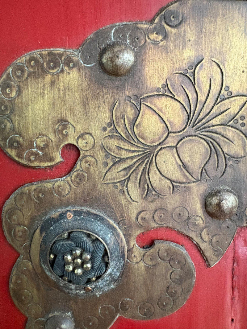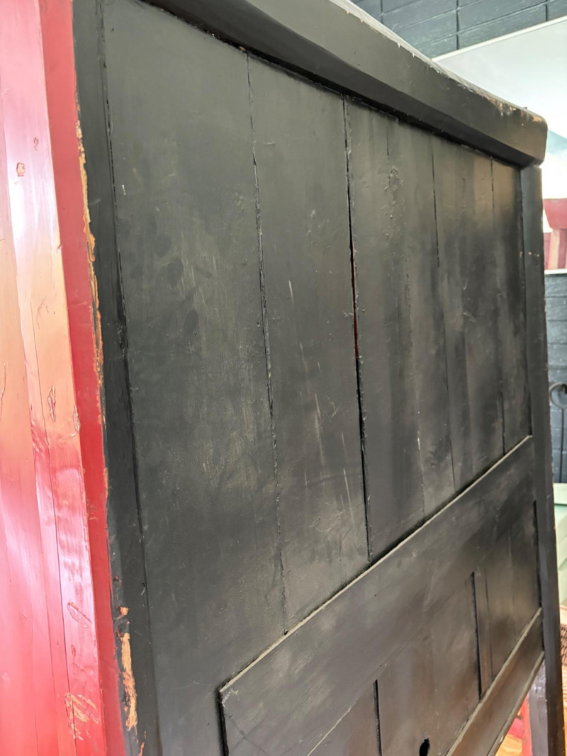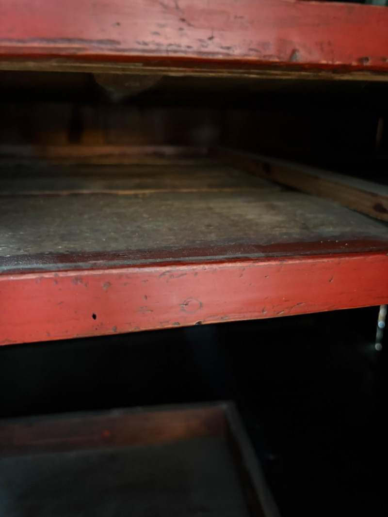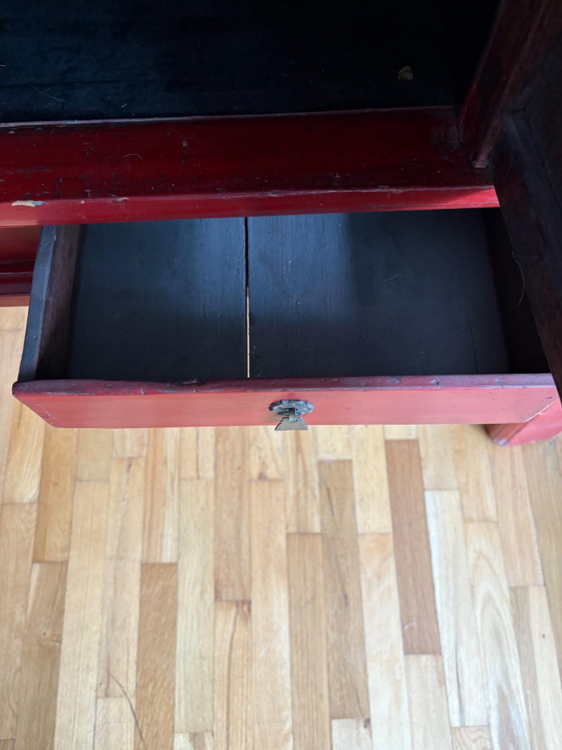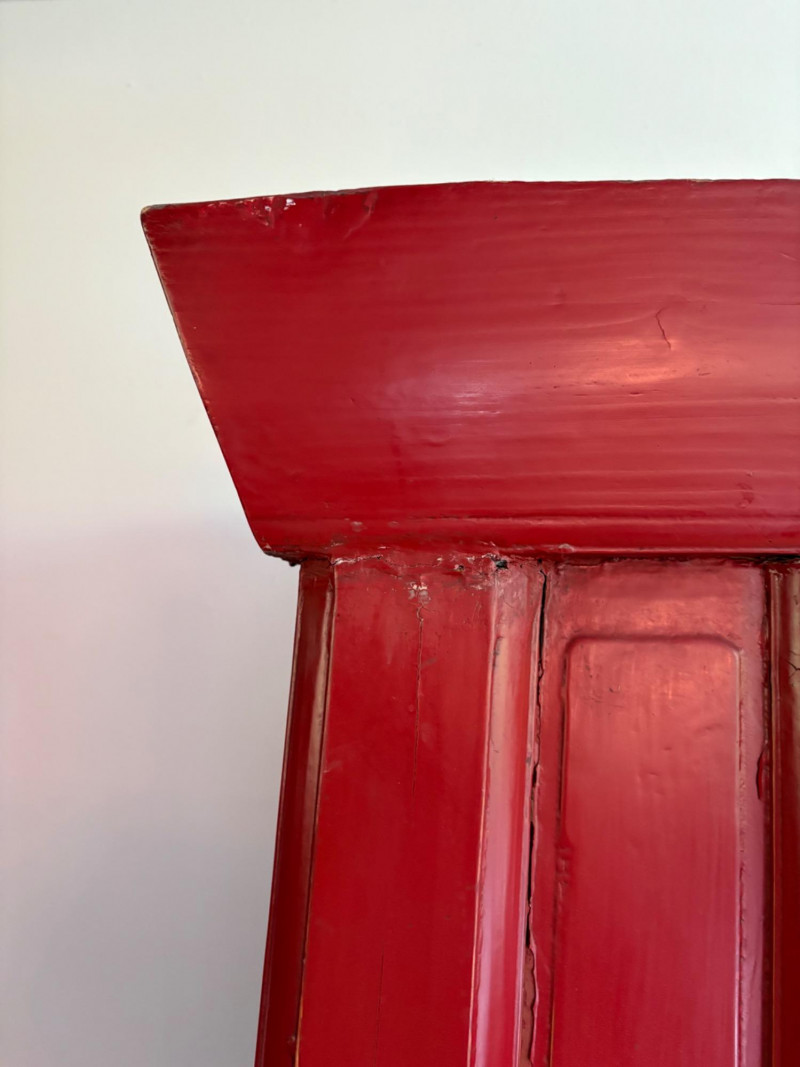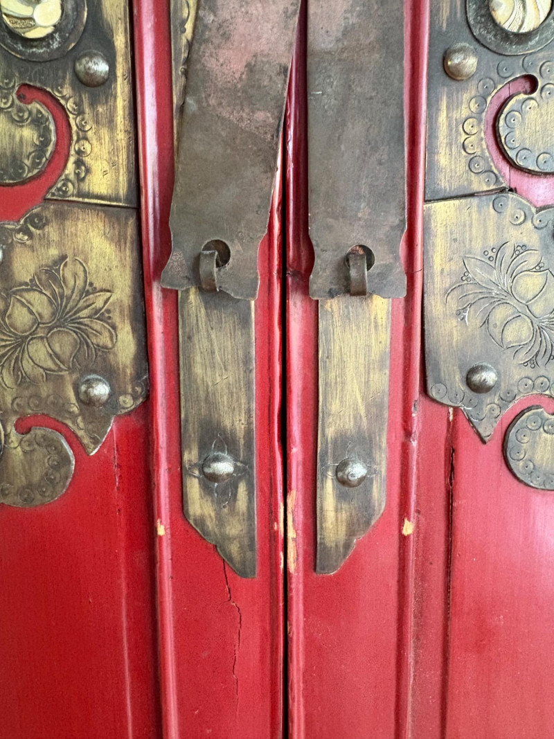 Large-size red antique Chinese butterfly cabinet. When purchased at a Seattle antique store many years ago, the client was told it was a couple hundred years old. We are unable to verify that, but the wood that isn't lacquered is definitely very old and the cabinet appears to have been assembled almost completely with wood joinery except for the metal butterfly motif on the front. Measures just over 69" H and wears its age proudly - lots of cracks and gaps, but still very sturdy and we believe the lack of perfection gives it great character. The client used to display sculptures between the legs and on top of the cabinet. Sides gently slope outward as they go down - both on the width measurement and the depth measurement. From the front, the cabinet measures approx. 42" wide at the top below the cornice piece and flares out to 52" where the legs meet the floor. (Cornice piece measures approx. 48" side to side.) From the side, the cabinet measures approx. 18.5" at the top below the cornice piece and flares out to 23" where the legs meet the floor. This tapered effect makes the cabinet seem to float. There are 2 central swing-out doors that conceal 2 shelves in the black interior along with 2 drawers under the top shelf. There are 2 additional drawers below the apron; all drawers have metal pulls. Swing-out doors have latch pin at the butterfly's head. The butterfly is incised and also has inset decorations that are lovely. Great piece that really shows off its age with class. Local Pickup Only. Bidding on this lot is an agreement that: (1.) You will have 2 capable, able-bodied persons to lift and load at a minimum. (2.) You will bring a hand truck and/or any other tools needed to remove this item. If these steps are not followed your item will be forfeited and no refund given.