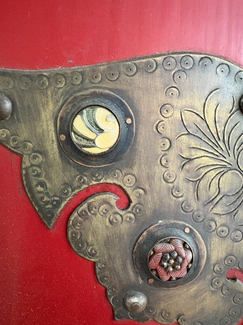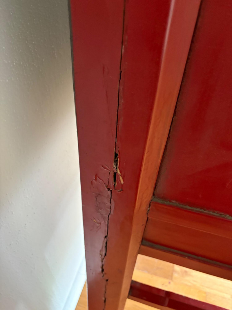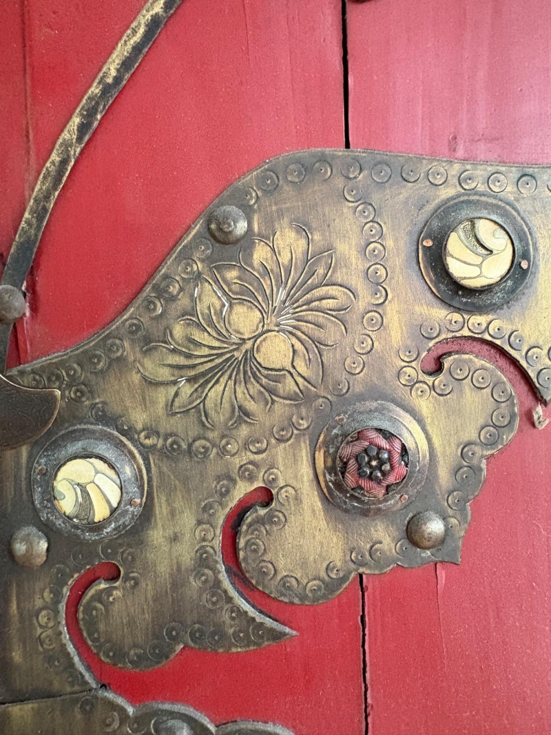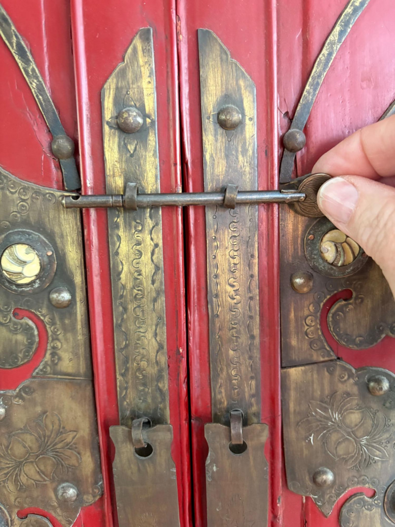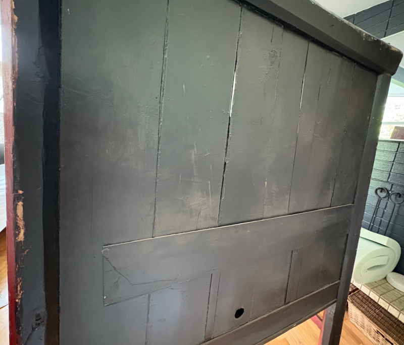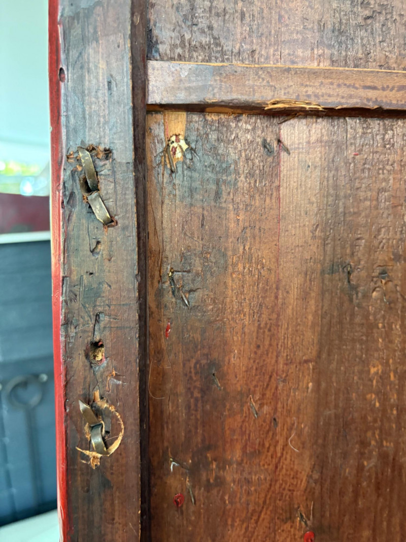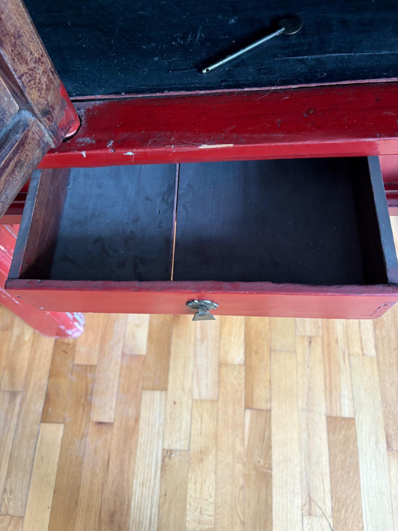 Large-size red antique Chinese butterfly cabinet. When purchased at a Seattle antique store many years ago, the client was told it was a couple hundred years old. We are unable to verify that, but the wood that isn't lacquered is definitely very old and the cabinet appears to have been assembled almost completely with wood joinery except for the metal butterfly motif on the front. Measures just over 69" H and wears its age proudly - lots of cracks and gaps, but still very sturdy and we believe the lack of perfection gives it great character. The client used to display sculptures between the legs and on top of the cabinet. Sides gently slope outward as they go down - both on the width measurement and the depth measurement. From the front, the cabinet measures approx. 42" wide at the top below the cornice piece and flares out to 52" where the legs meet the floor. (Cornice piece measures approx. 48" side to side.) From the side, the cabinet measures approx. 18.5" at the top below the cornice piece and flares out to 23" where the legs meet the floor. This tapered effect makes the cabinet seem to float. There are 2 central swing-out doors that conceal 2 shelves in the black interior along with 2 drawers under the top shelf. There are 2 additional drawers below the apron; all drawers have metal pulls. Swing-out doors have latch pin at the butterfly's head. The butterfly is incised and also has inset decorations that are lovely. Great piece that really shows off its age with class. Local Pickup Only. Bidding on this lot is an agreement that: (1.) You will have 2 capable, able-bodied persons to lift and load at a minimum. (2.) You will bring a hand truck and/or any other tools needed to remove this item. If these steps are not followed your item will be forfeited and no refund given.