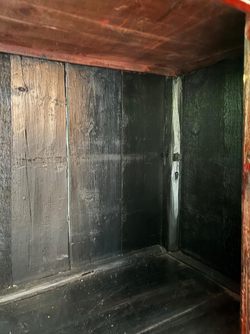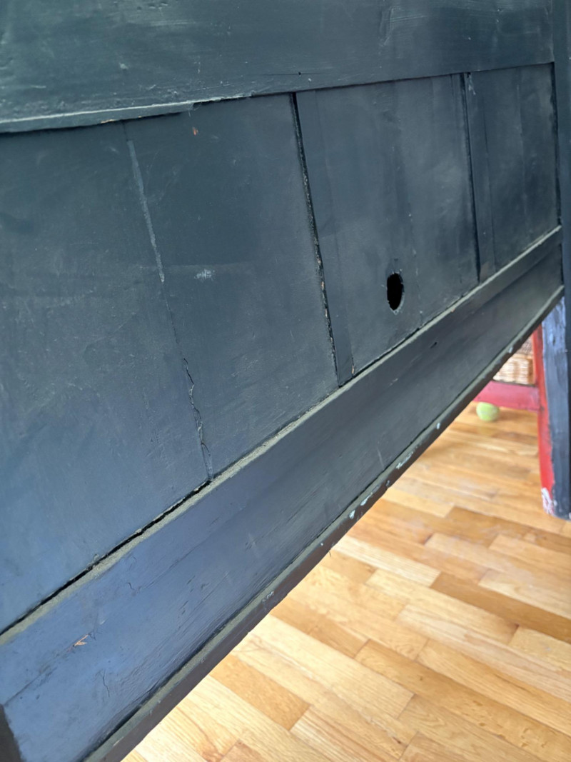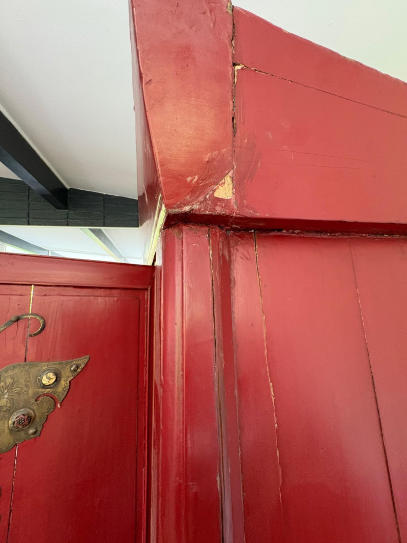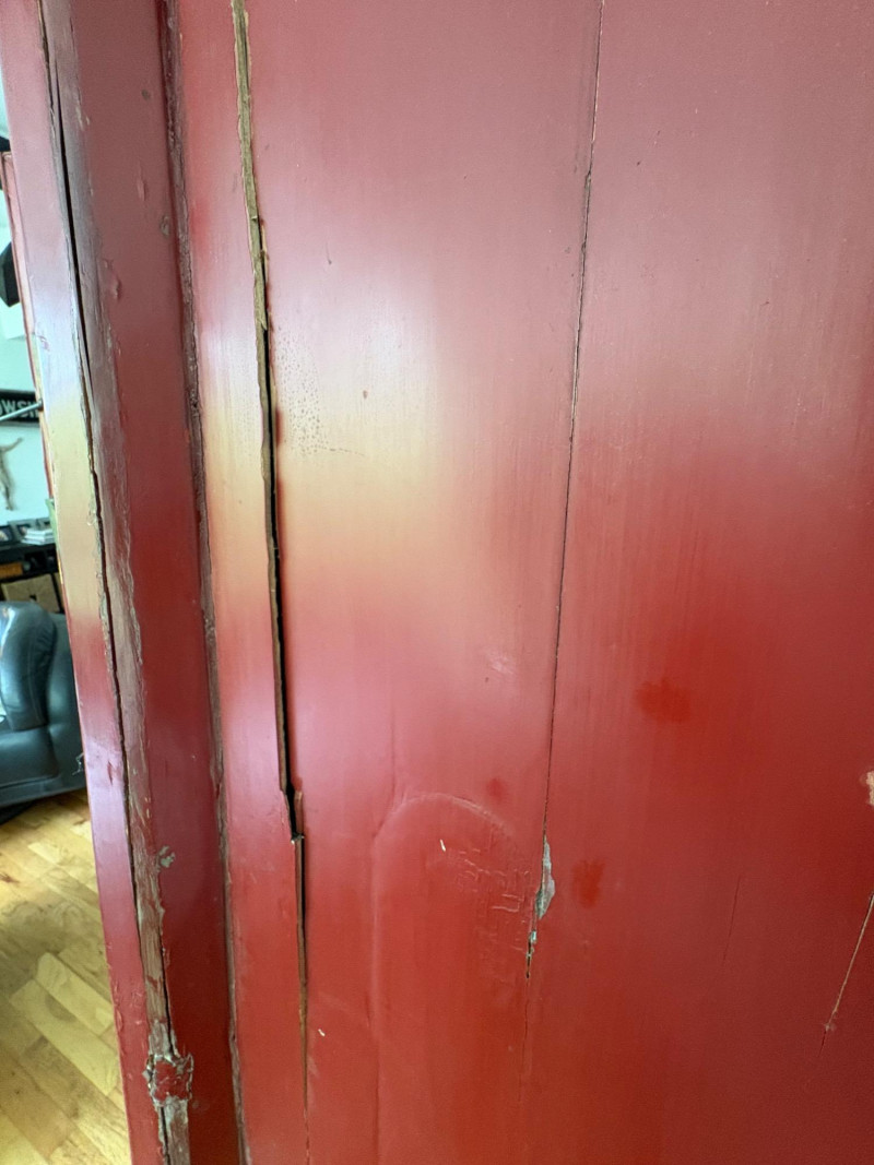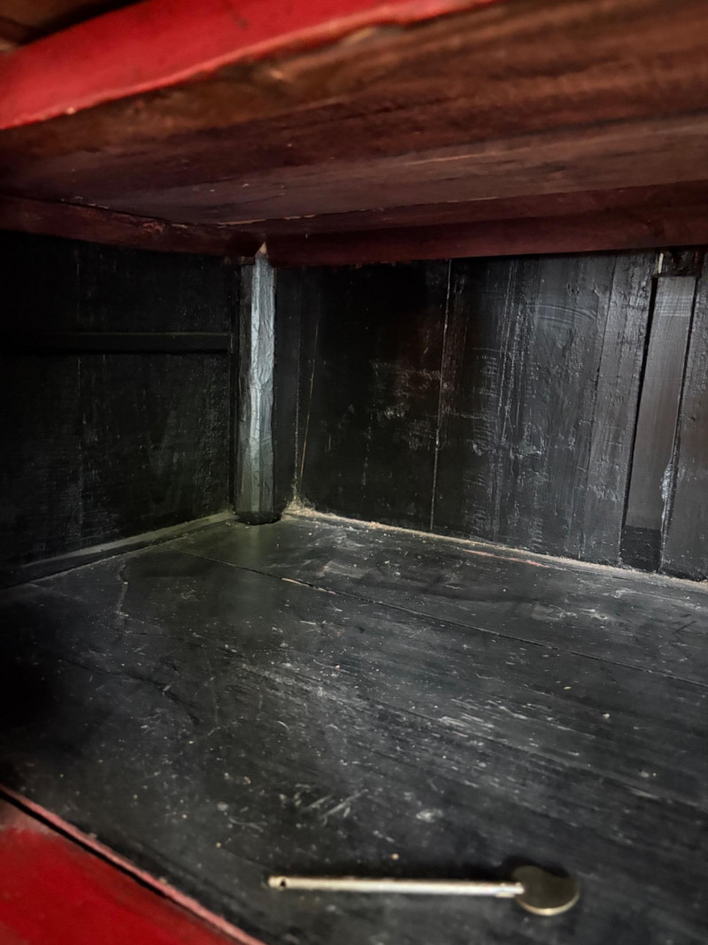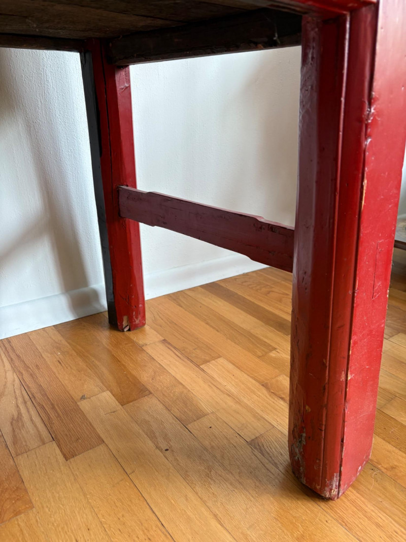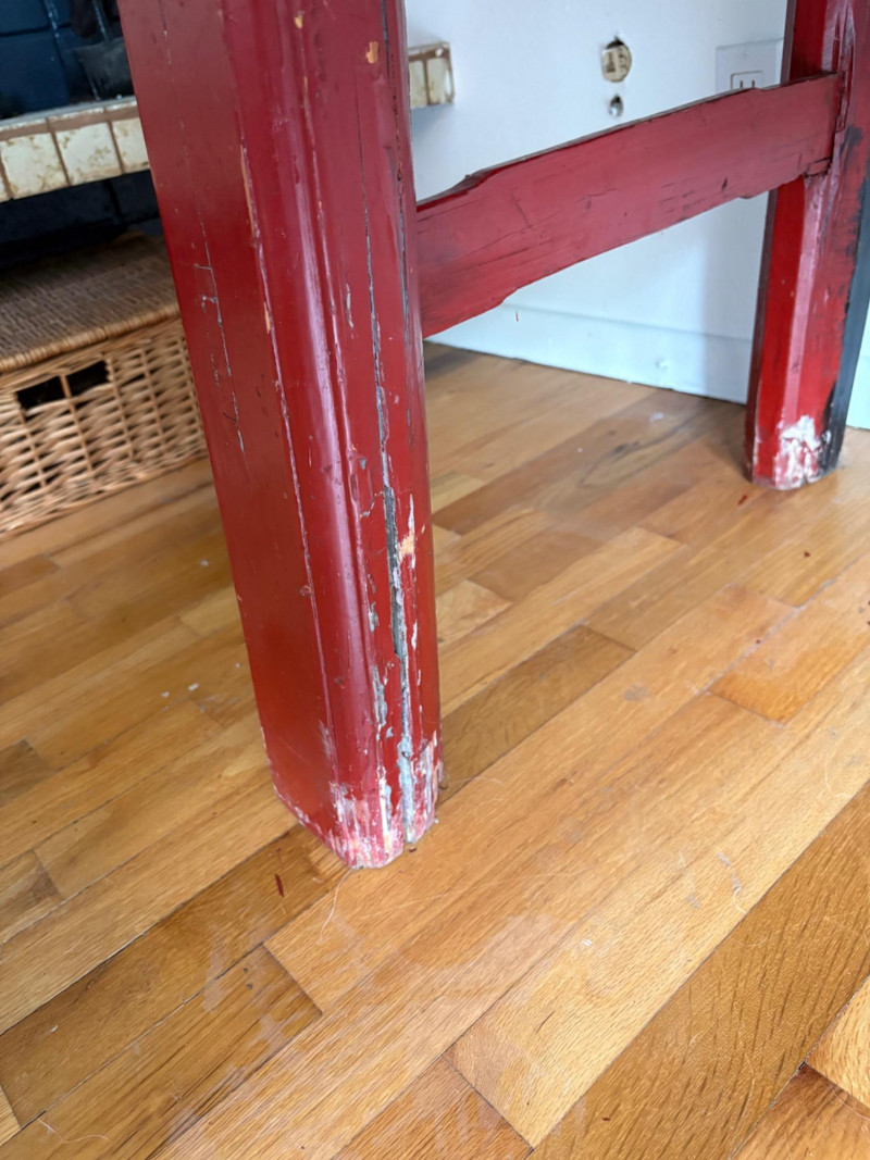 Large-size red antique Chinese butterfly cabinet. When purchased at a Seattle antique store many years ago, the client was told it was a couple hundred years old. We are unable to verify that, but the wood that isn't lacquered is definitely very old and the cabinet appears to have been assembled almost completely with wood joinery except for the metal butterfly motif on the front. Measures just over 69" H and wears its age proudly - lots of cracks and gaps, but still very sturdy and we believe the lack of perfection gives it great character. The client used to display sculptures between the legs and on top of the cabinet. Sides gently slope outward as they go down - both on the width measurement and the depth measurement. From the front, the cabinet measures approx. 42" wide at the top below the cornice piece and flares out to 52" where the legs meet the floor. (Cornice piece measures approx. 48" side to side.) From the side, the cabinet measures approx. 18.5" at the top below the cornice piece and flares out to 23" where the legs meet the floor. This tapered effect makes the cabinet seem to float. There are 2 central swing-out doors that conceal 2 shelves in the black interior along with 2 drawers under the top shelf. There are 2 additional drawers below the apron; all drawers have metal pulls. Swing-out doors have latch pin at the butterfly's head. The butterfly is incised and also has inset decorations that are lovely. Great piece that really shows off its age with class. Local Pickup Only. Bidding on this lot is an agreement that: (1.) You will have 2 capable, able-bodied persons to lift and load at a minimum. (2.) You will bring a hand truck and/or any other tools needed to remove this item. If these steps are not followed your item will be forfeited and no refund given.