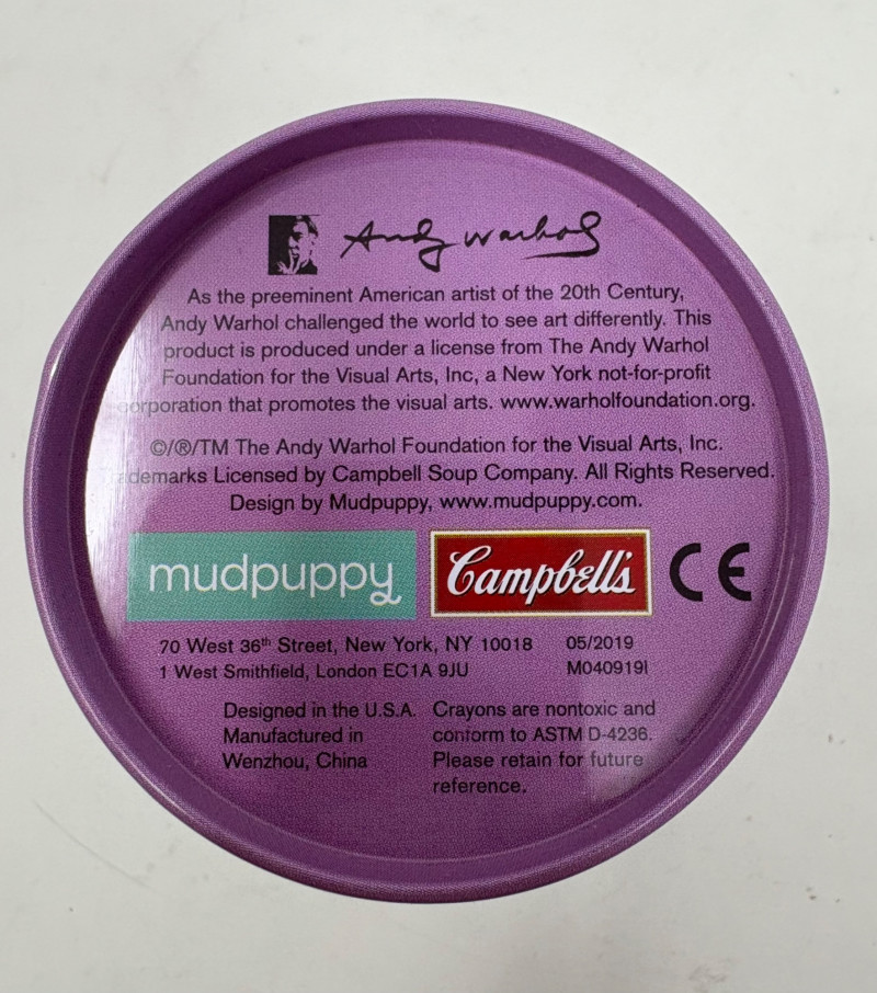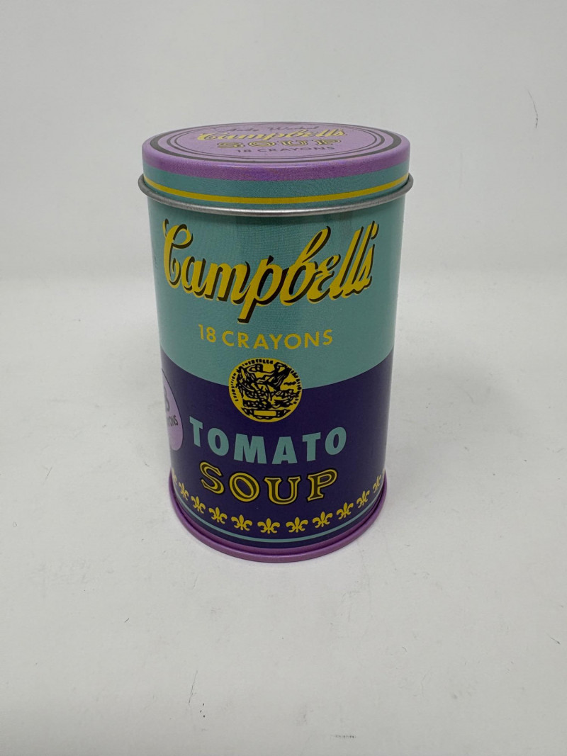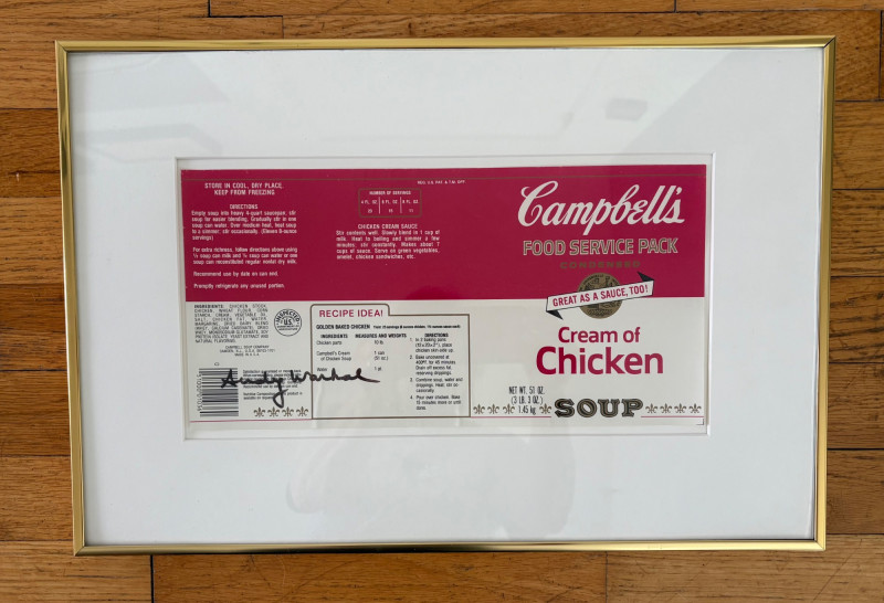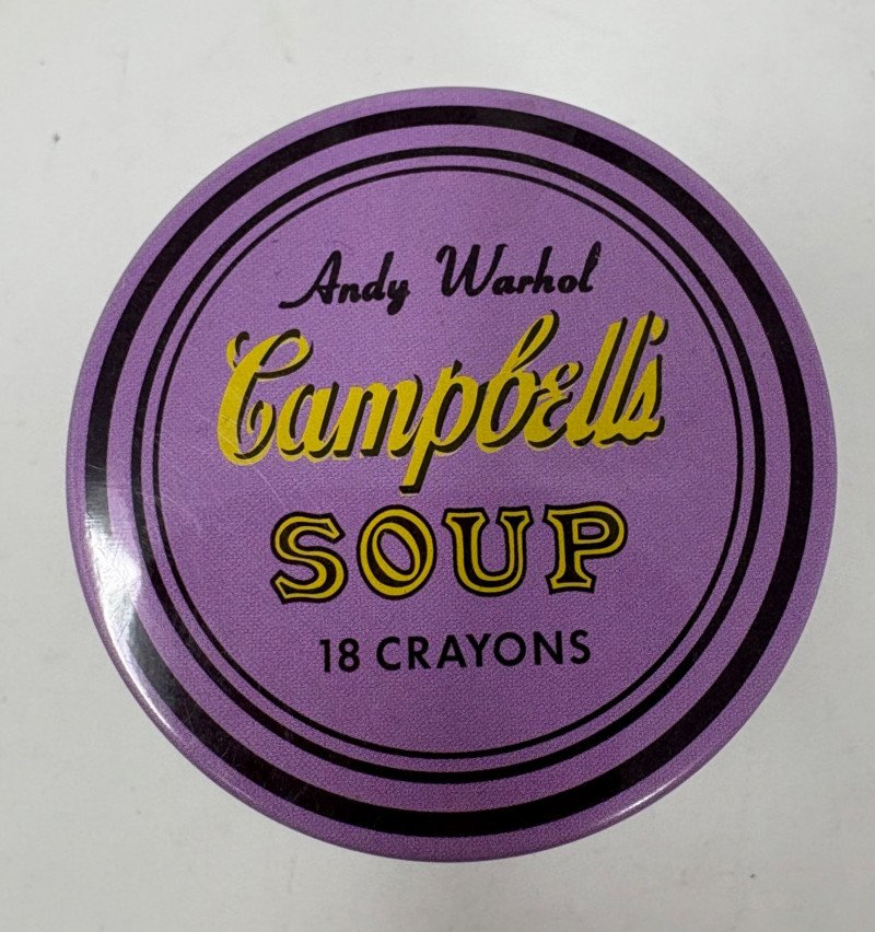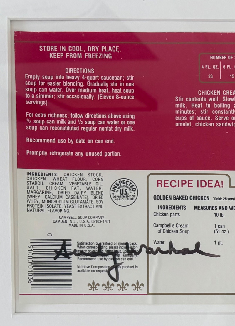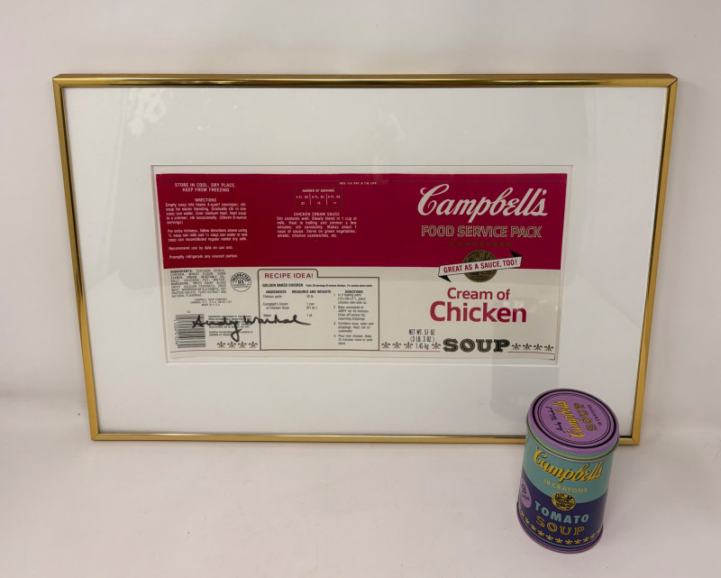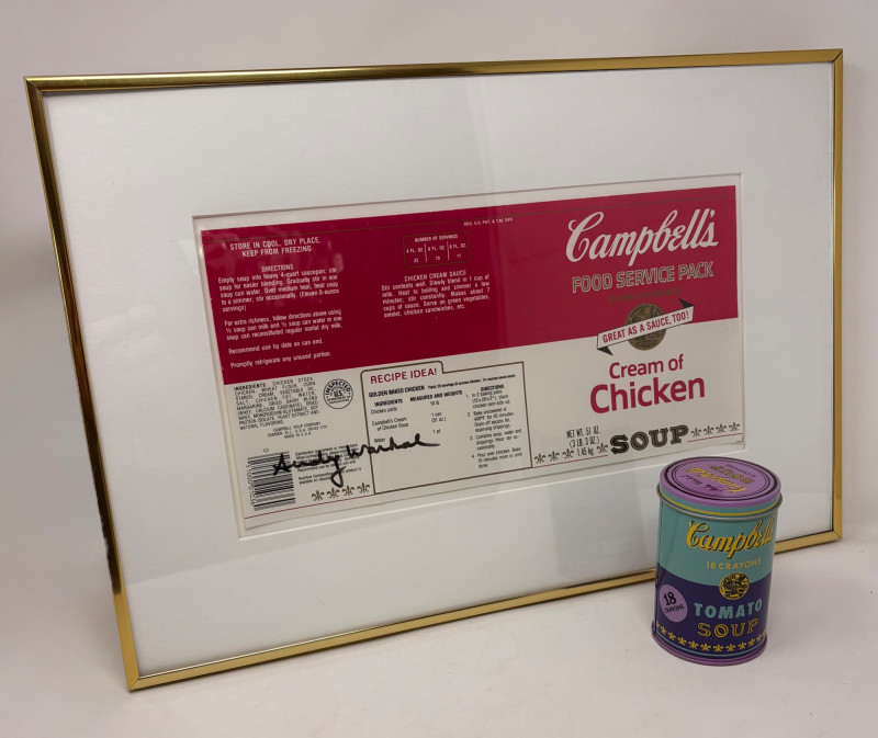 Andy Warhol signed Campbell's Soup label. Client purchased from a private dealer in Los Angeles approximately 30 years ago for $1800, but does not have authentication papers. She believes it is authentic per her experience managing a Pioneer Square Art Gallery for many years. Measures 13" H x 19.5" W framed. Gold metal frame. Warhol crayon set in Campbell Soup can from 2019; authorized by the Andy Warhol Foundation. New in packaging with one crayon tip broken - please see last photo. Can measures approx. 4" H. Sound Estate Company does not appraise art or guarantee authenticity.