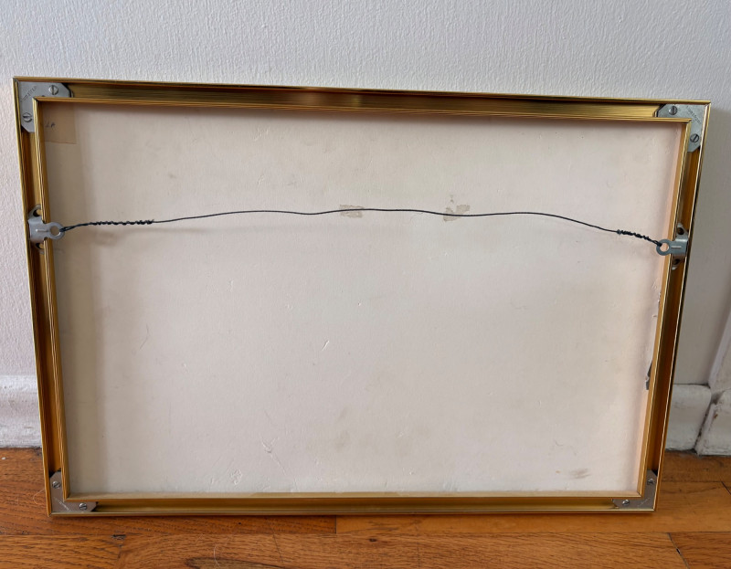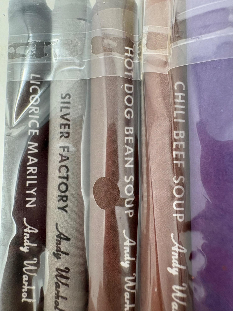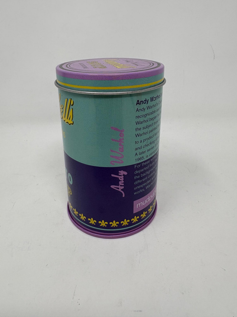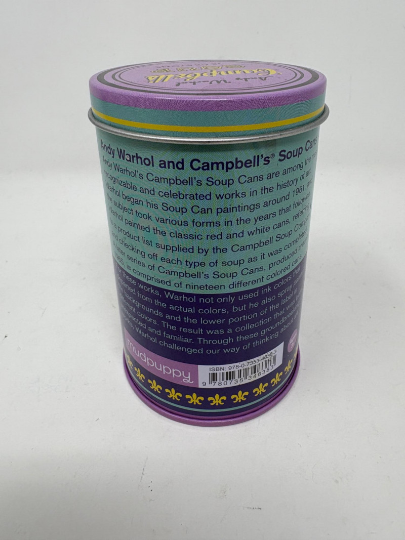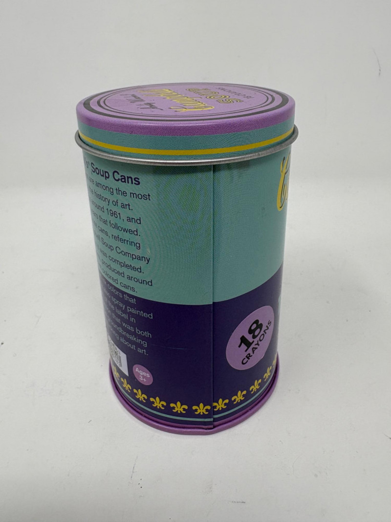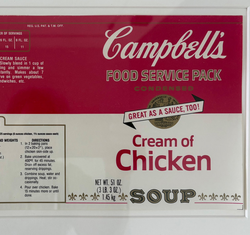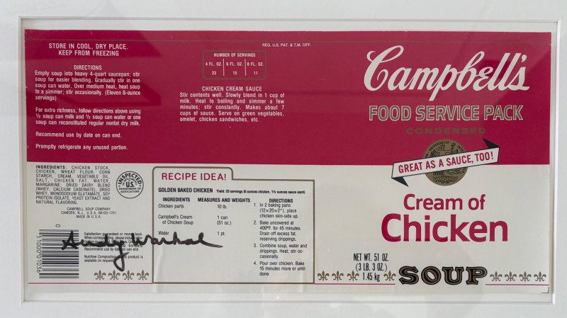 Andy Warhol signed Campbell's Soup label. Client purchased from a private dealer in Los Angeles approximately 30 years ago for $1800, but does not have authentication papers. She believes it is authentic per her experience managing a Pioneer Square Art Gallery for many years. Measures 13" H x 19.5" W framed. Gold metal frame. Warhol crayon set in Campbell Soup can from 2019; authorized by the Andy Warhol Foundation. New in packaging with one crayon tip broken - please see last photo. Can measures approx. 4" H. Sound Estate Company does not appraise art or guarantee authenticity.