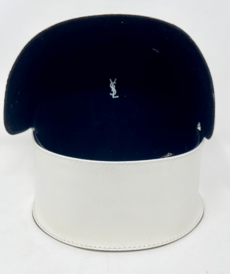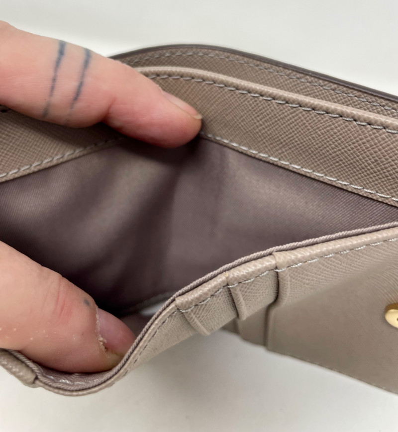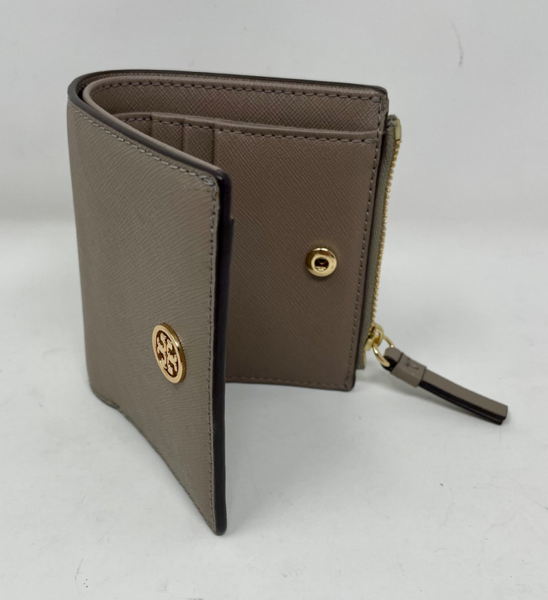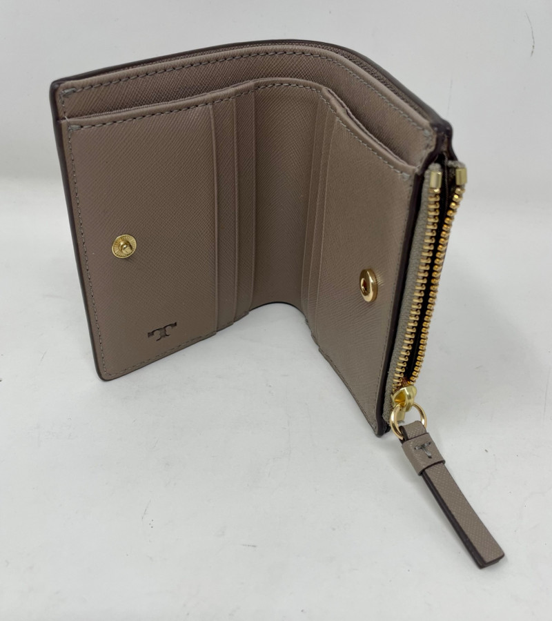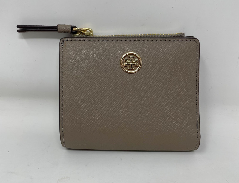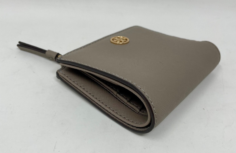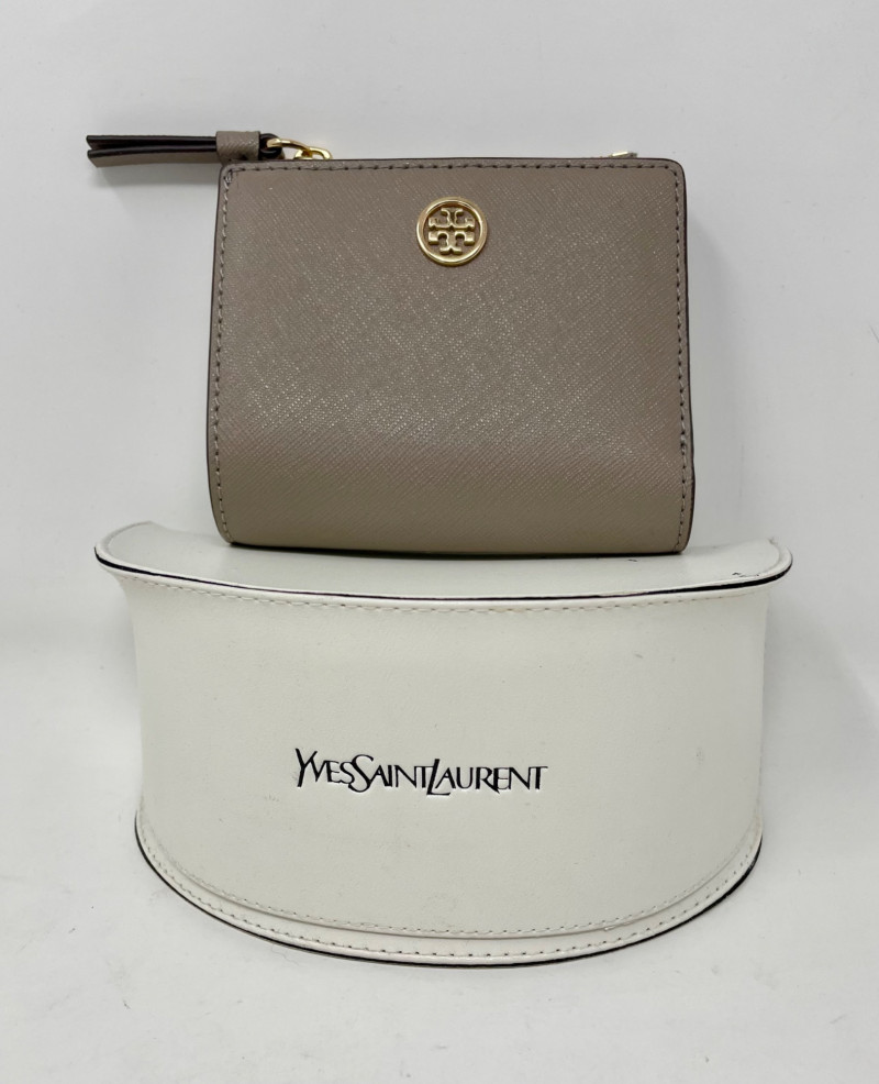 Yves Saint Laurent 6186 Sunglasses in color 0807 - black with silver hardware on outside and silver hinges & gold screws on inner arms. Smoke color lenses, no scratches - excellent condition with white YSL case. Retails for $265. Tory Burch "Robinson" mini bi-fold wallet in a bisque/taupe color made of textured leather featuring a gold-tone metal logo at front, zipped pocket, six card slots, and two bill compartments. New without tags. When you can find this style, it's retailing for around $150.