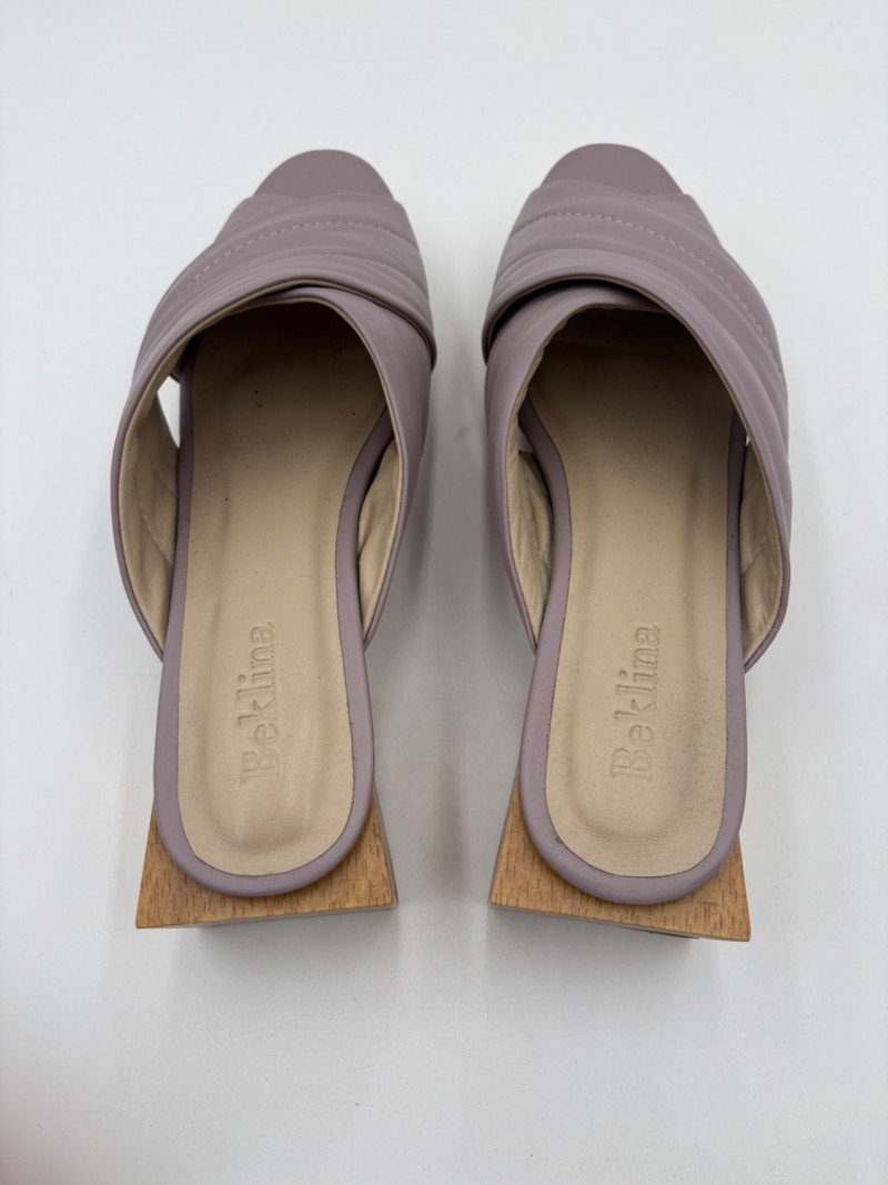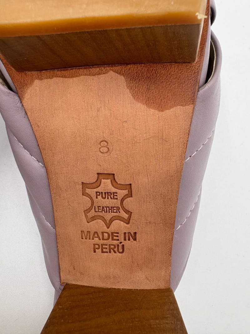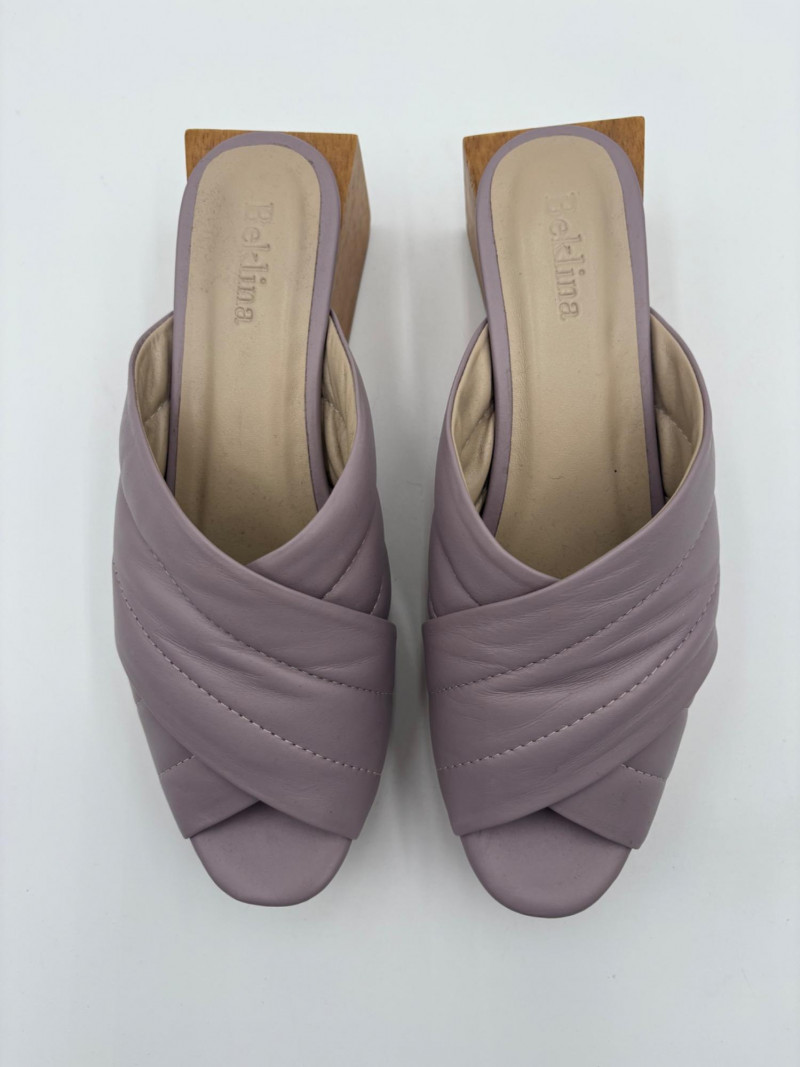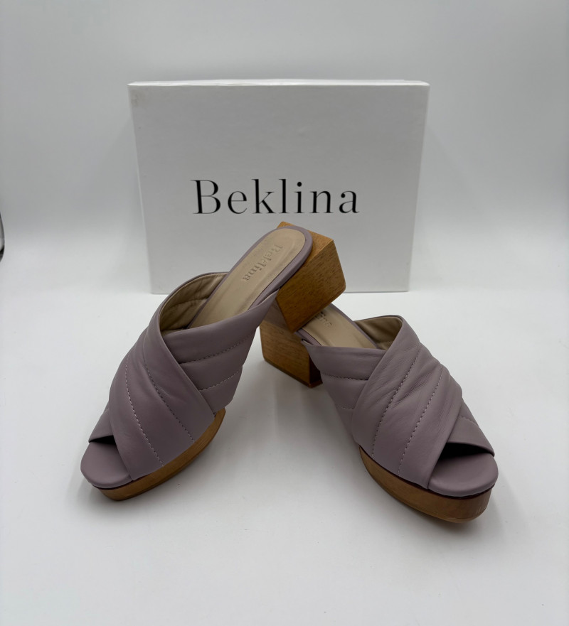Avant-garde slides from Beklina - "Matisse Criss Cross Platform" in pale lilac-colored leather. Square wooden 2.25" block heel, 1" platform, and rubber non-slip sole. Padded heel & instep with line-quilted upper. New with box. Made in Peru. Size 8. These currently retail for $310 on the Beklina site.