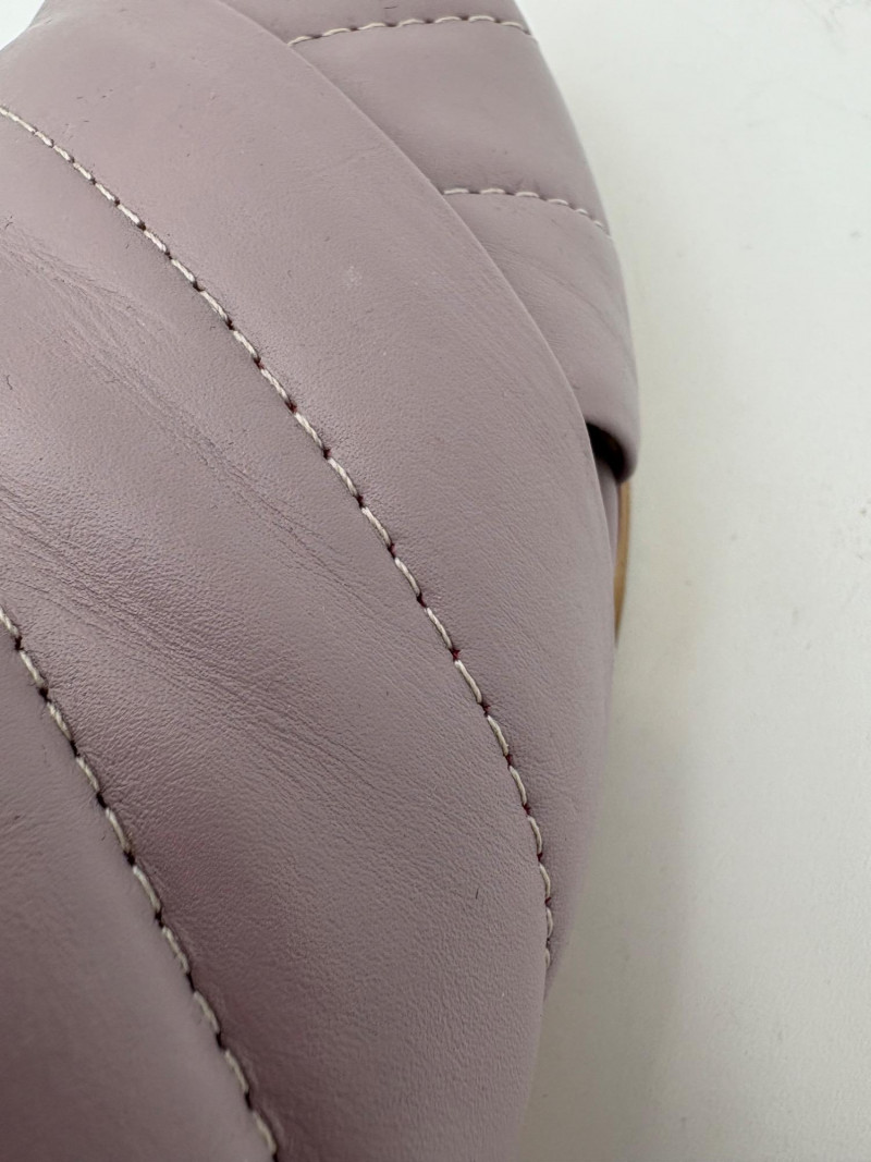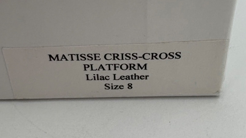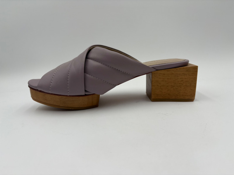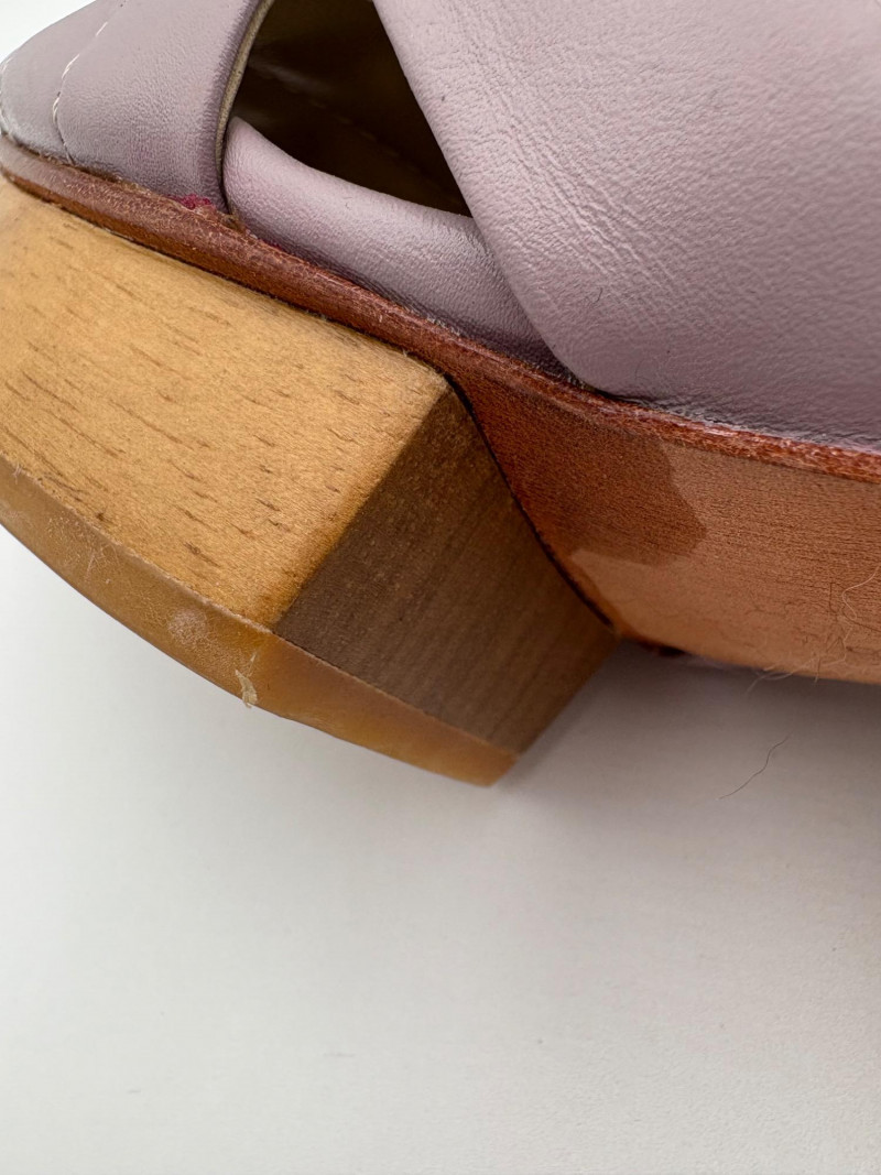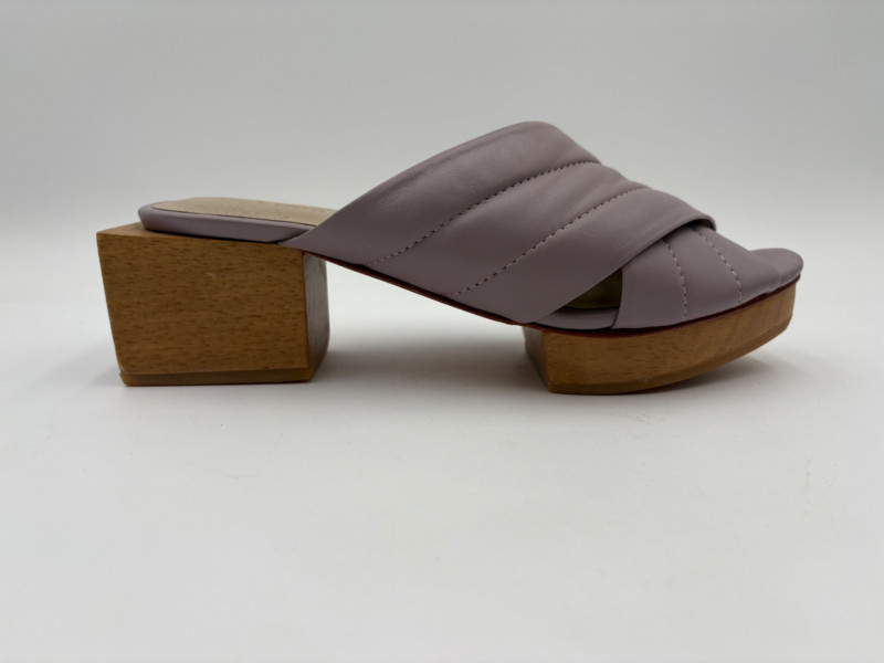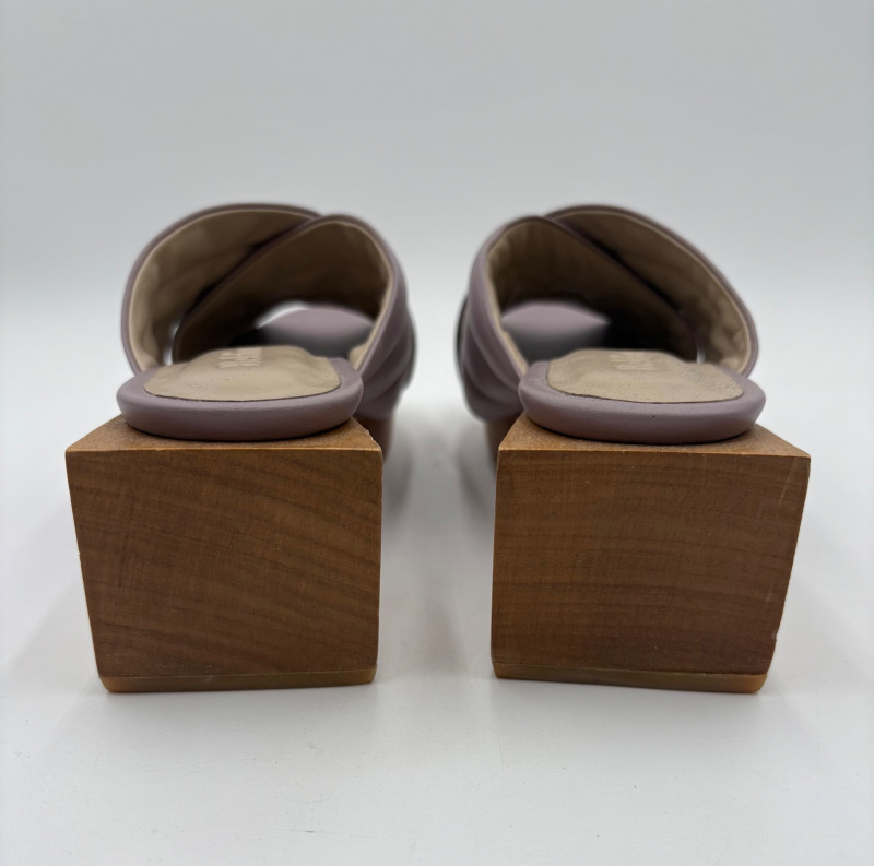 Avant-garde slides from Beklina - "Matisse Criss Cross Platform" in pale lilac-colored leather. Square wooden 2.25" block heel, 1" platform, and rubber non-slip sole. Padded heel & instep with line-quilted upper. New with box. Made in Peru. Size 8. These currently retail for $310 on the Beklina site.