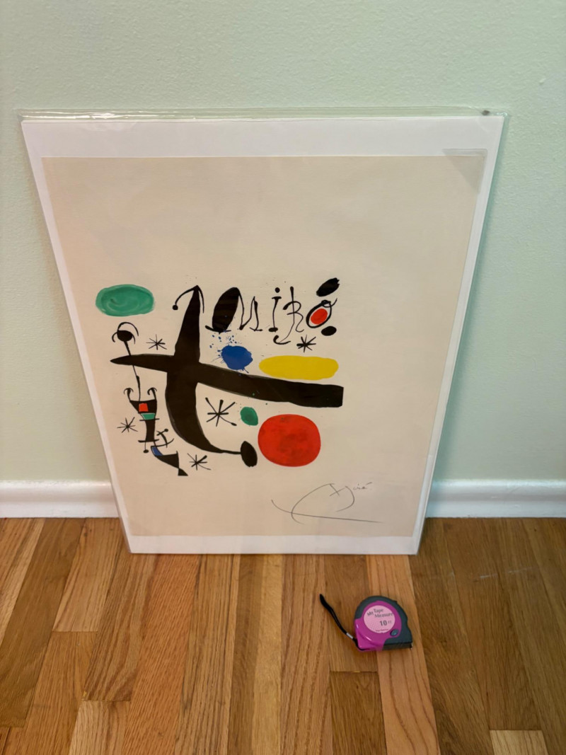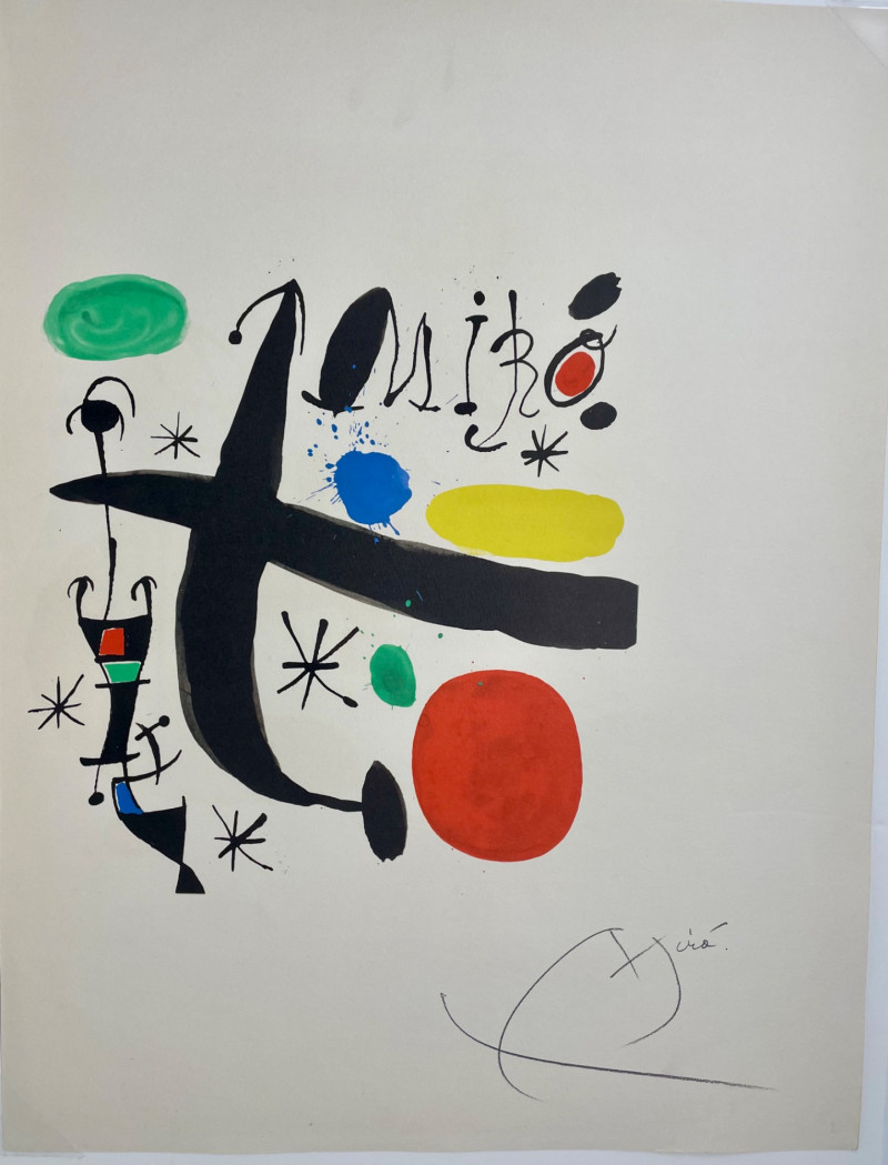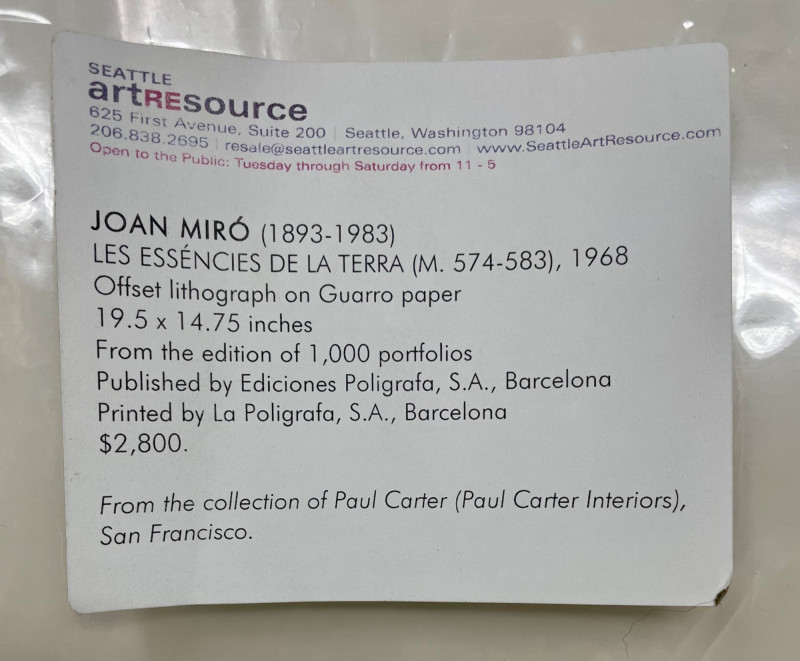 Color offset lithograph by artist Joan Miró entitled "Les Essencies De La Terra" (The Essences of the Land). 1968. Printed on Guarro paper, this piece is from an edition of 1,000 published by Ediciones Poligrafa, S.A., Barcelona. This particular print is from the collection of Paul Carter (of Paul Carter Interiors), San Francisco. Has original gallery label on back with price of $2,800. Measures 19.5" x 14.75" framed. Sound Estate Company does not appraise art or guarantee authenticity.