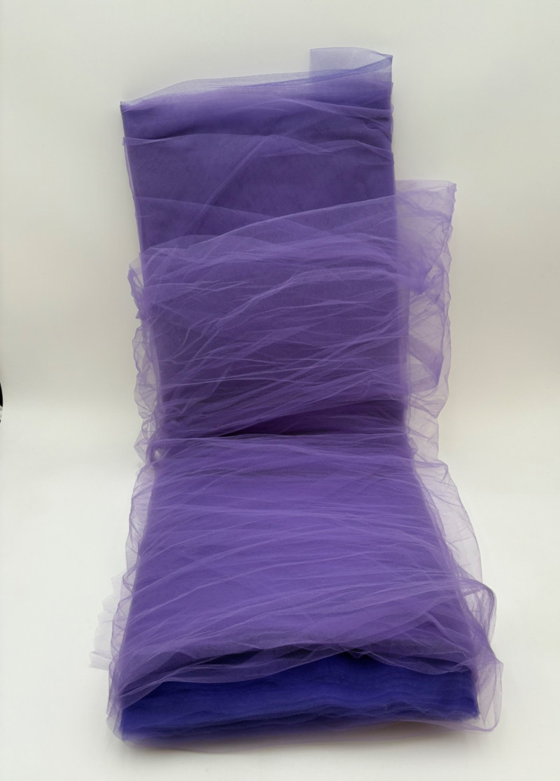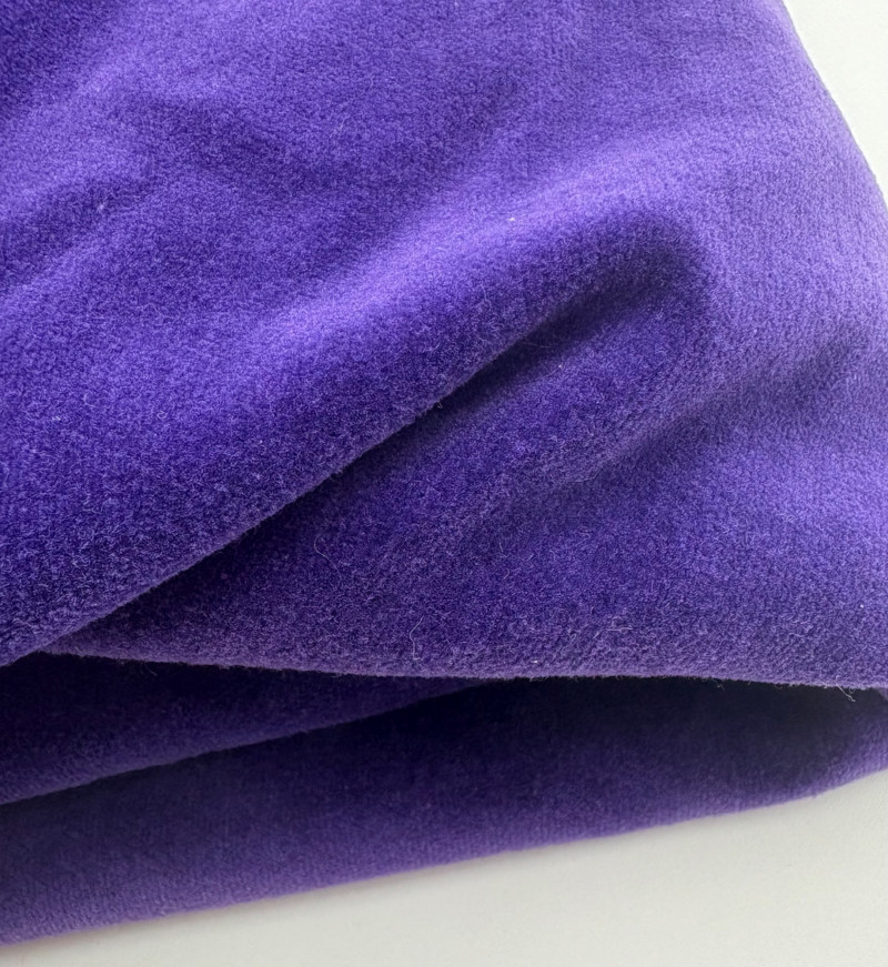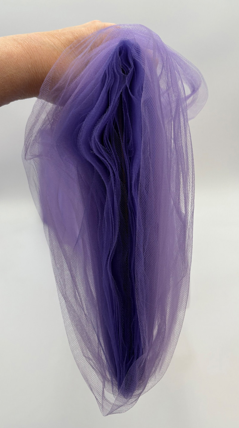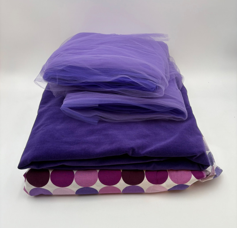 Costumes? Home dec accessories? Quilting? Whatever your fancy, these three fabrics will let your purple passion reign. There's enough yardage to actually make draperies, pillows, duvet covers, quilt backing, or an amazing costume (client used the velvet to make pirate jackets embellished with gold buttons and cording). Lot includes: - Purple velvet. Heavy garment weight (not backed with the stiffener like home dec velvets). 4+ yards at 44" wide with selvage. - Purple 100% cotton "Disco Dot" from Michael Miller. 10.5+ yards at 42" wide. (7.75" repeat). - Purple tulle in 2 shades of purple. Unsure of yardage, but there is a lot!