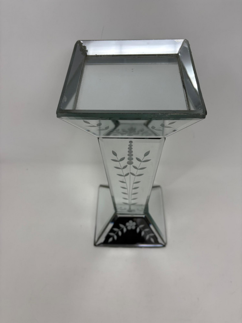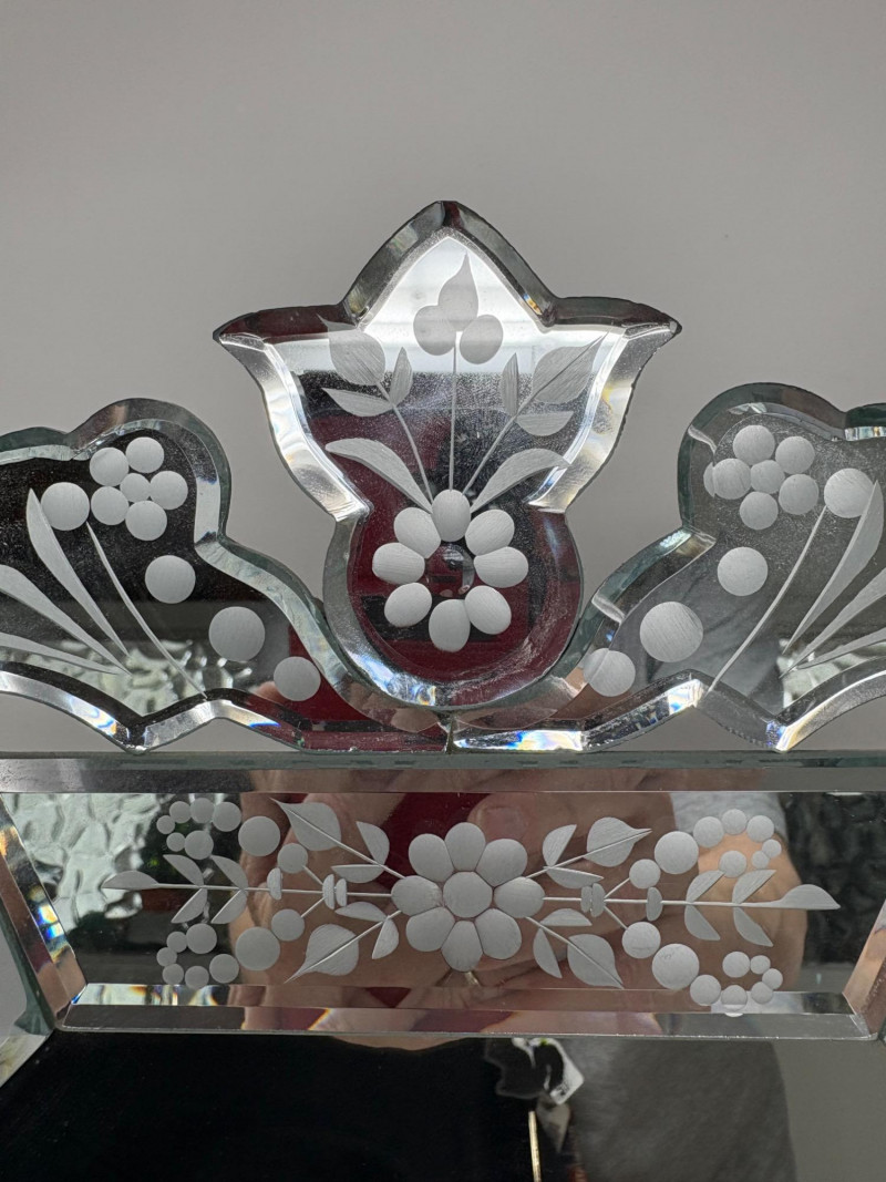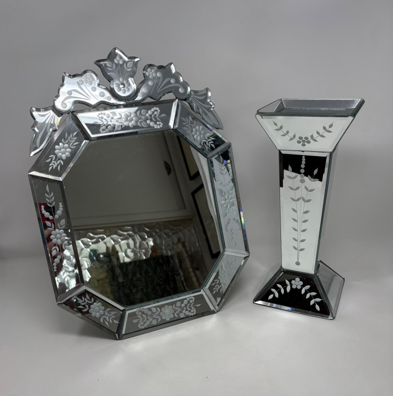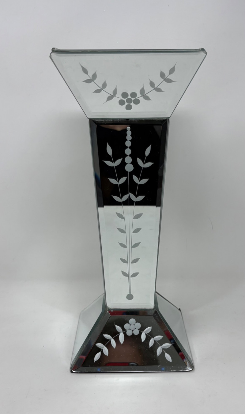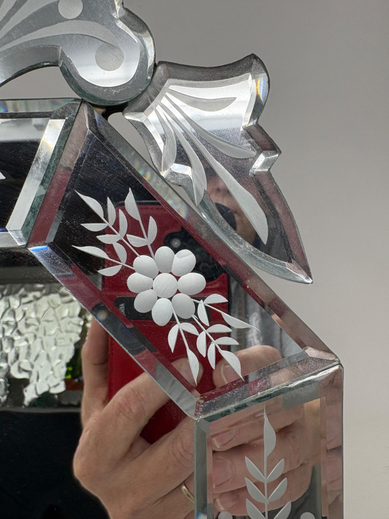 Modern interpretation of classic Venetian cut glass mirror & candle plinth. Mirror has lots of floral splashes with foliage and beveled edges. Measures 16.5" H x just over 12" W with a back support for desk use. In very good vintage condition with one small noticeable flaw on the left bottom of the mirror - see last picture. Candle plinth measures 12" H x 5" W x 5" D. In great condition.