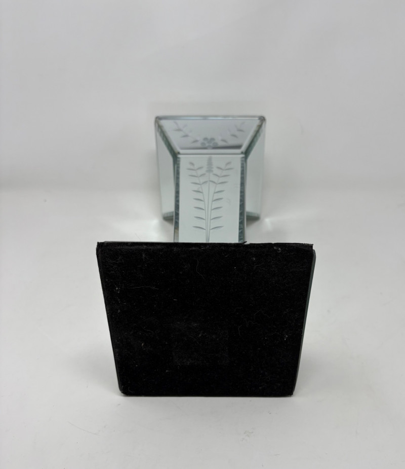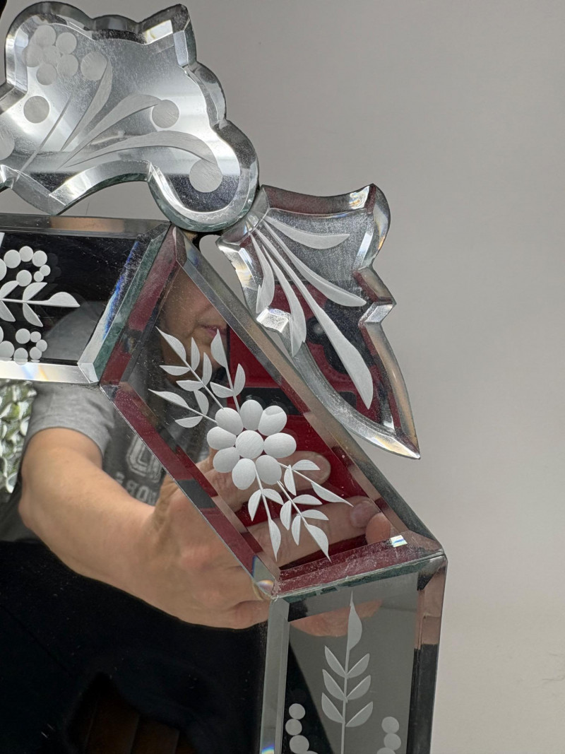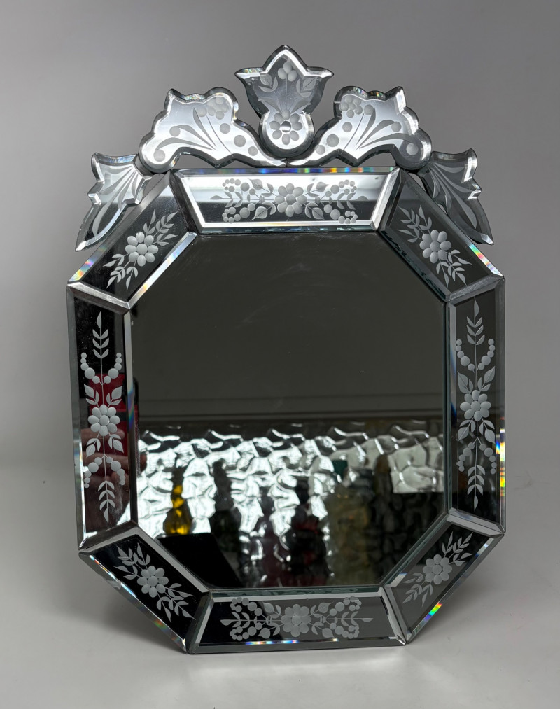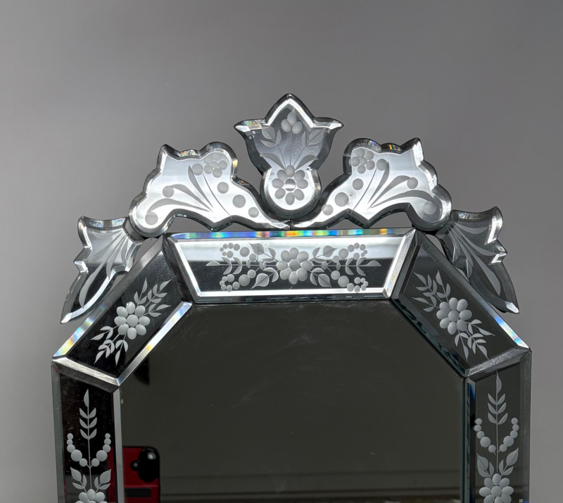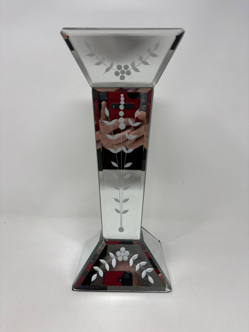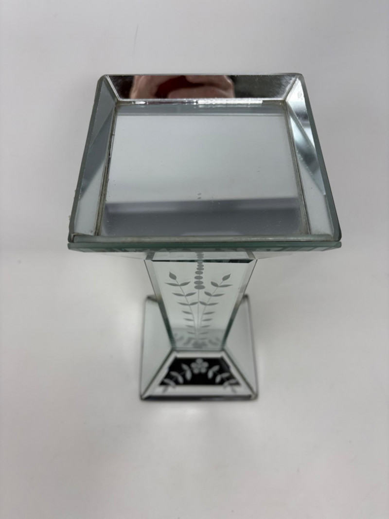 Modern interpretation of classic Venetian cut glass mirror & candle plinth. Mirror has lots of floral splashes with foliage and beveled edges. Measures 16.5" H x just over 12" W with a back support for desk use. In very good vintage condition with one small noticeable flaw on the left bottom of the mirror - see last picture. Candle plinth measures 12" H x 5" W x 5" D. In great condition.