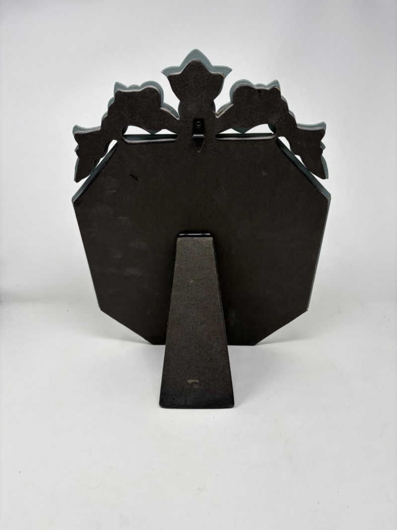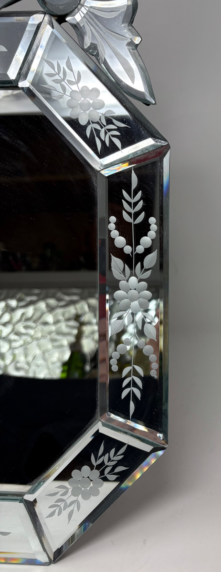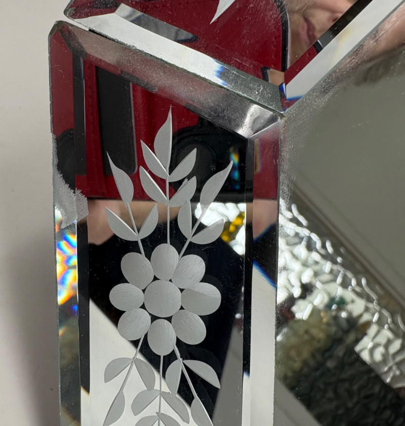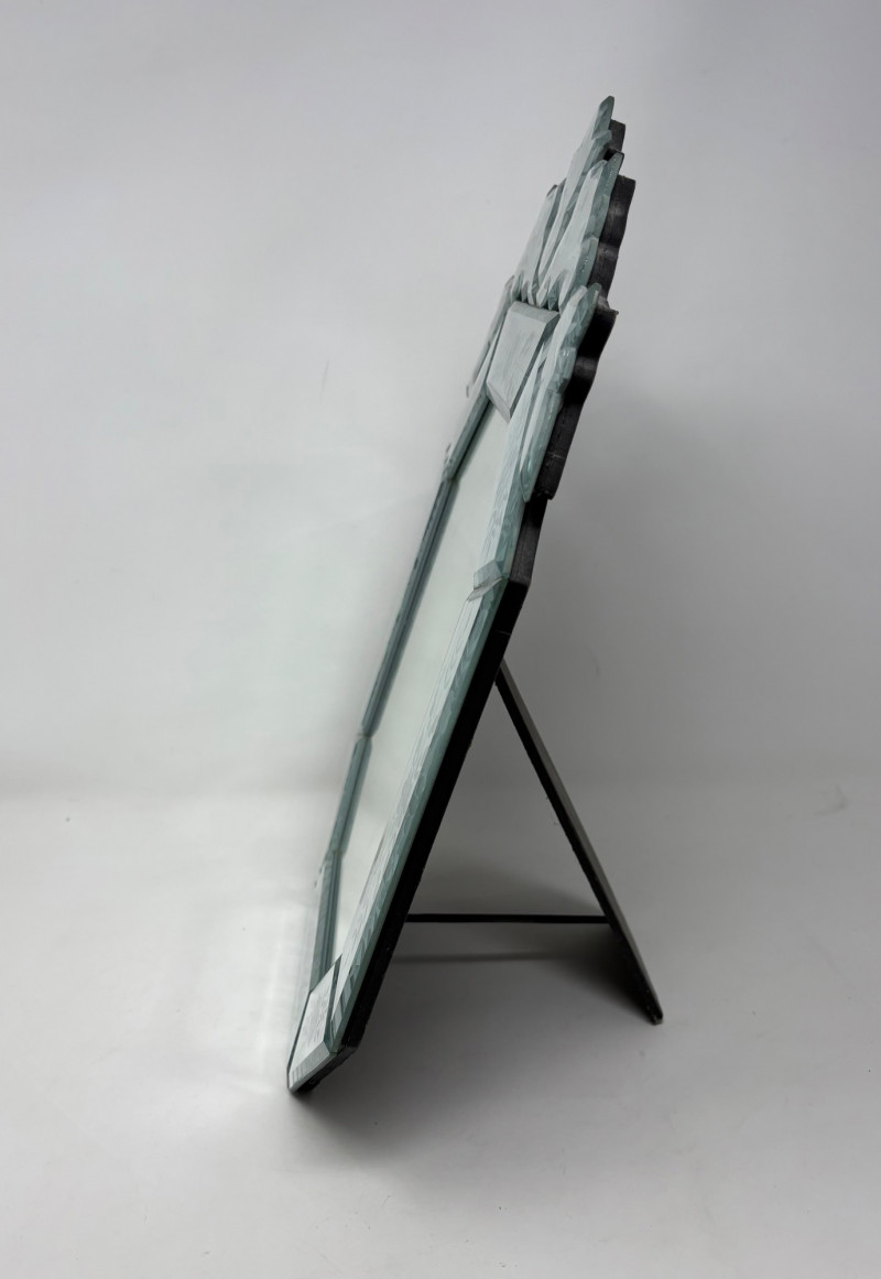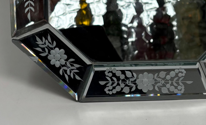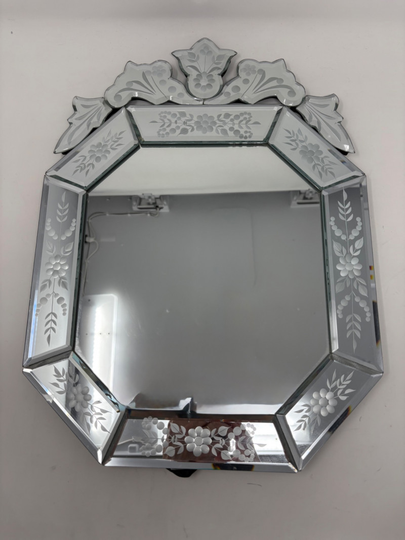 Modern interpretation of classic Venetian cut glass mirror & candle plinth. Mirror has lots of floral splashes with foliage and beveled edges. Measures 16.5" H x just over 12" W with a back support for desk use. In very good vintage condition with one small noticeable flaw on the left bottom of the mirror - see last picture. Candle plinth measures 12" H x 5" W x 5" D. In great condition.