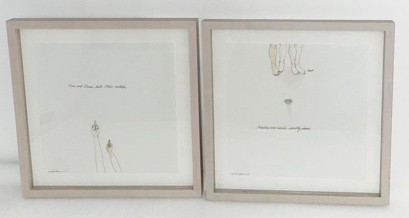 Two 1999 watercolor works on paper by Peregrine Honig entitled "Kim and Laura" and "Madeline and Natalie" from the Ovubet: An Alphabet for Good and Bad Girls series. They each measure 10" x 10" (10.75" x 10.75" framed). Hailing from Kansas City, Peregrine Honig is a multi-disciplinary artist whose themes include pop culture, sexuality and consumerism. These two watercolors were purchased from Greg Kucera Gallery in 2000 during her solo exhibition there. Read more about this talented artist here. Sound Estate Company does not appraise art or guarantee authenticity.