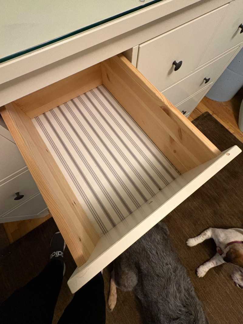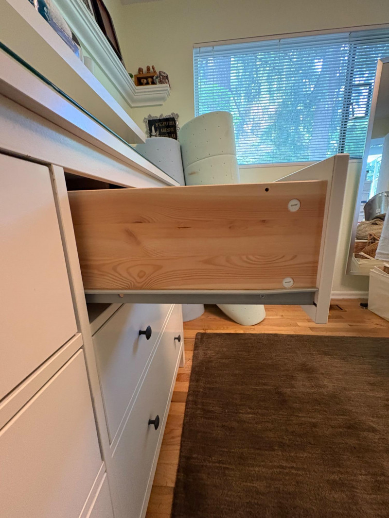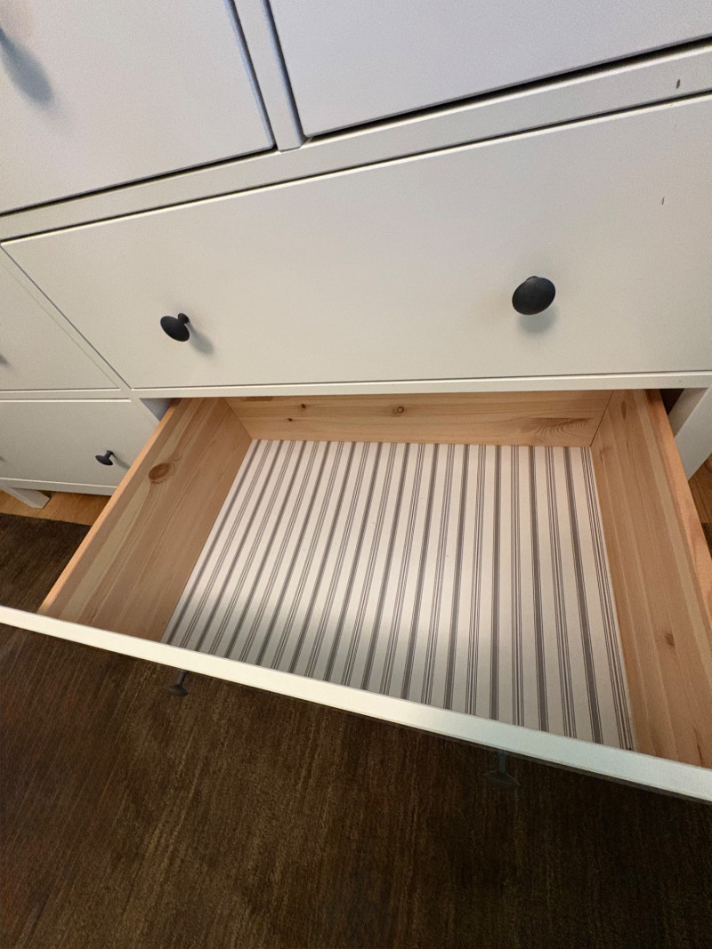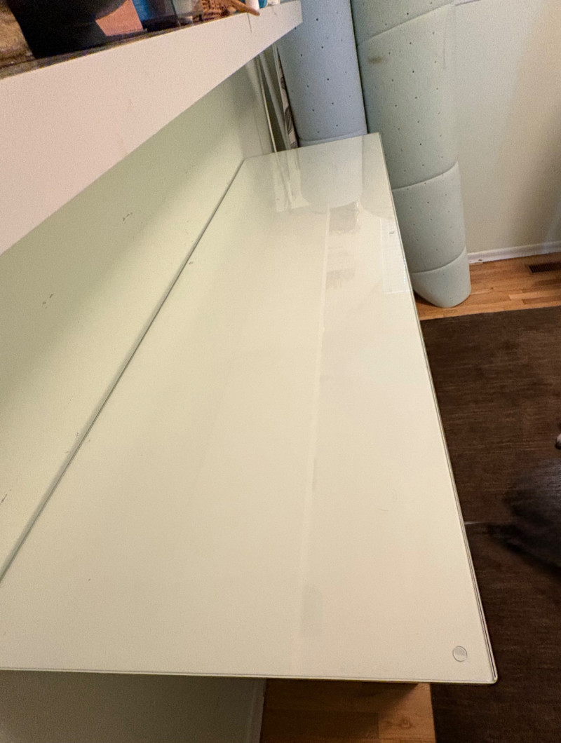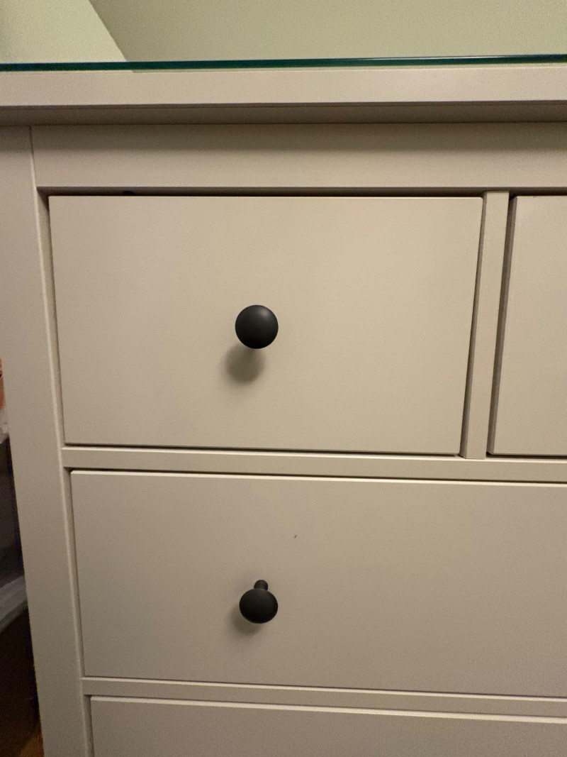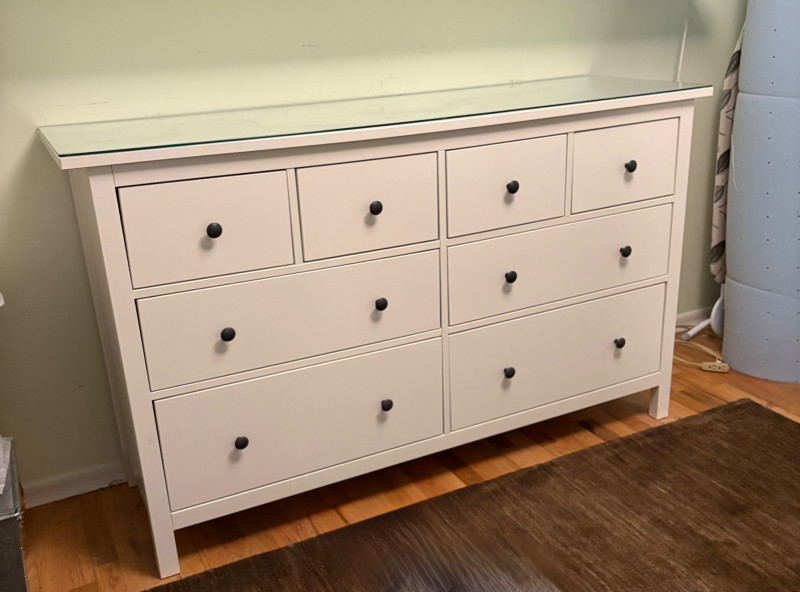 White wooden chest of drawers. Client cannot remember where purchased, but believes it was not IKEA (we didn't find any manufacturer with a cursory examination). 3 rows of drawers- 4 smaller ones on top, 2 longer ones in the middle, and 2 deeper ones on the bottom. All have black circular pulls & shelf liner. There is a sheet of tempered glass on the chest top. Easy roll drawer slides; overall in terrific shape with no egregious flaws noted. Measures 37.75" H x shy 63" W x 19.5" D. Local Pickup Only. Bidding on this lot is an agreement that: (1.) You will have 2 capable, able-bodied persons to lift and load at a minimum. (2.) You will bring a hand truck and/or any other tools needed to remove this item. If these steps are not followed your item will be forfeited and no refund given.
