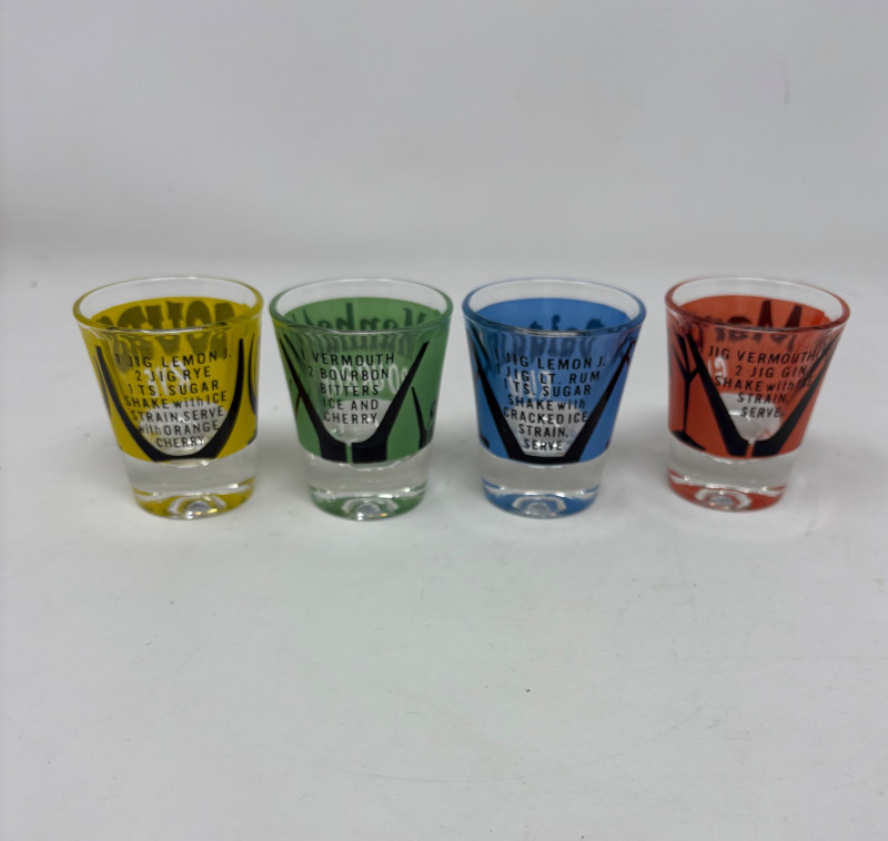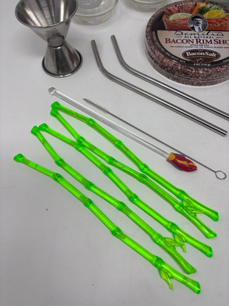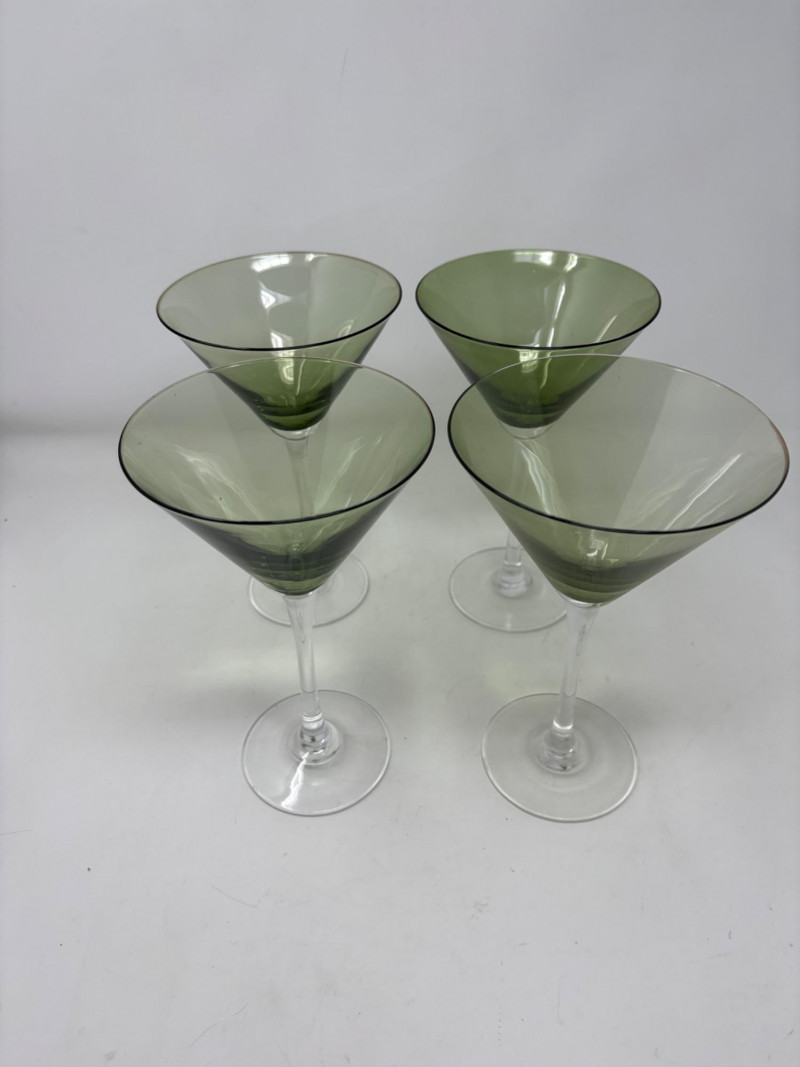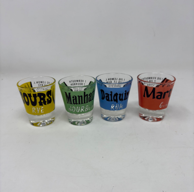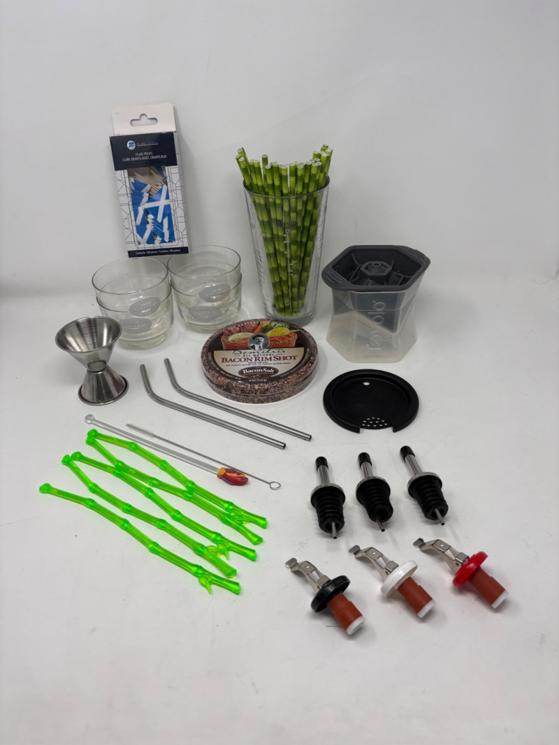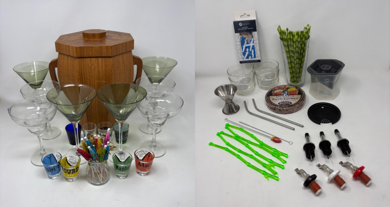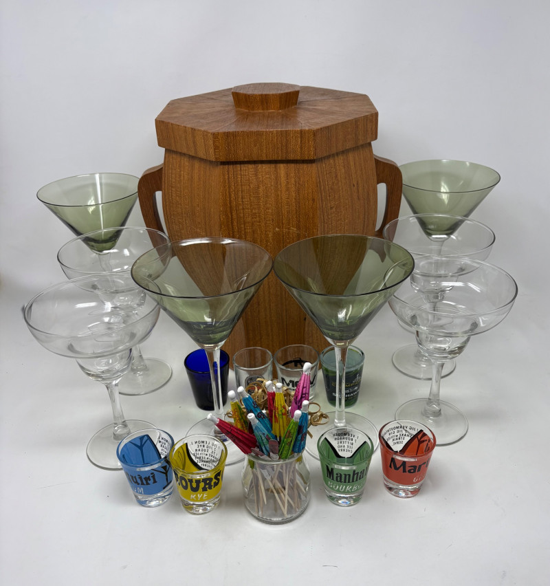 Large variety of barware for your every need. Lot includes: 4 clear margarita glasses 4 green and clear martini glasses 8 shot glasses MCM wooden ice bucket - measures approximately 12" H. Assorted bar accoutrements such as pour attachments, straws, etc. as pictured. BONUS - something for "highballs" not pictured.