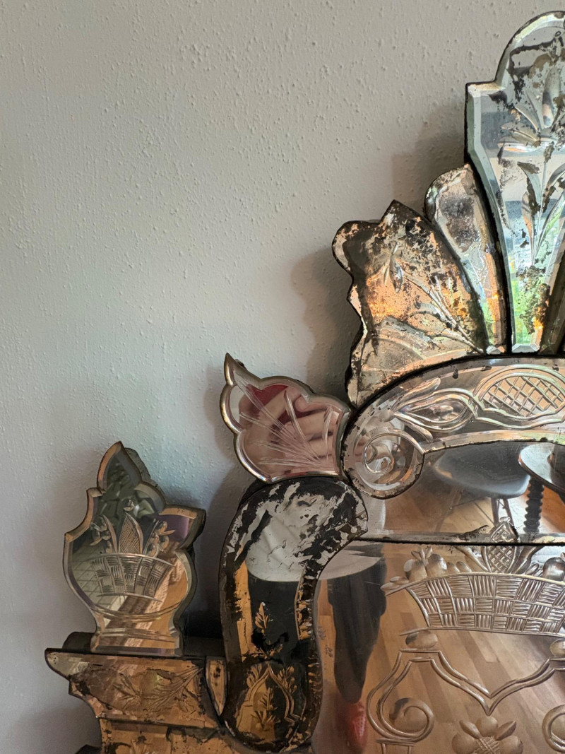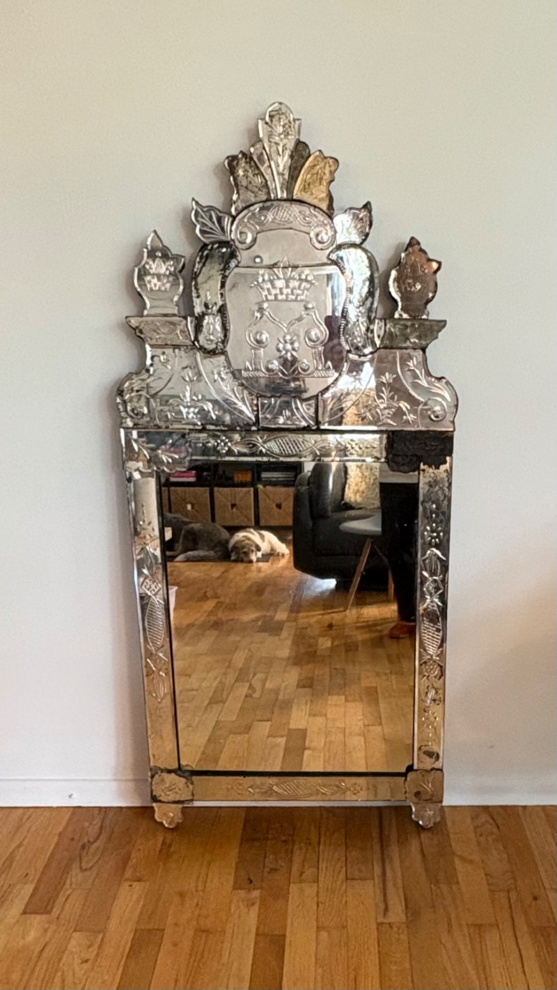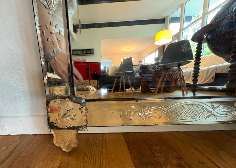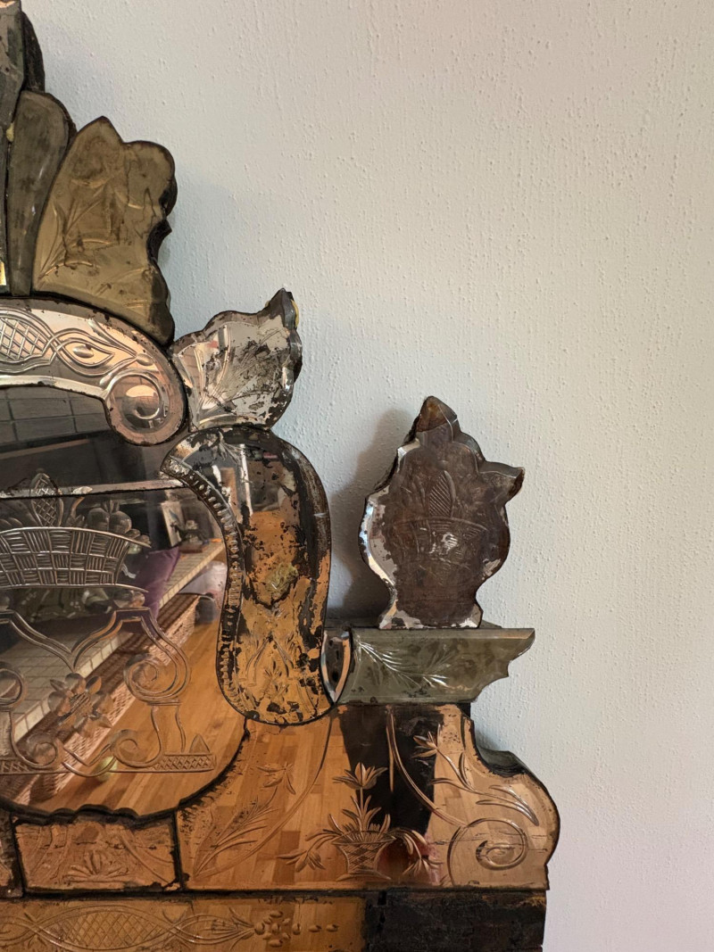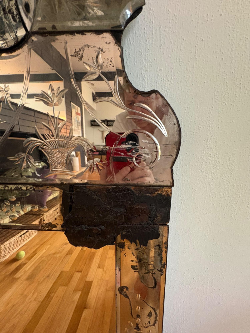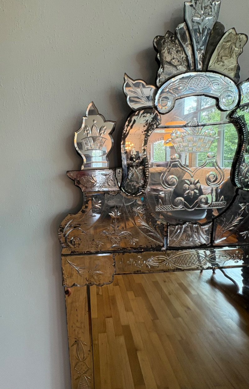 Very large antique Venetian glass mirror. Client is unsure of origin - purchased in an antique shop in Paris, and while she was told it was French there, it appears to us to be more in the Venetian style. Either way, this mirror is OLD. Measures shy 58" H x 25.5" W x 2" D with wood backing and stabilizers. As might be expected given its age, there are numerous flaws including a missing panel on the upper right, a couple of small cracks/divots (see last photo) and wear on the surfaces. However, the client purchased it exactly because its age is so evident yet inherently elegant in its character. Read more about Venetian glass mirrors here.