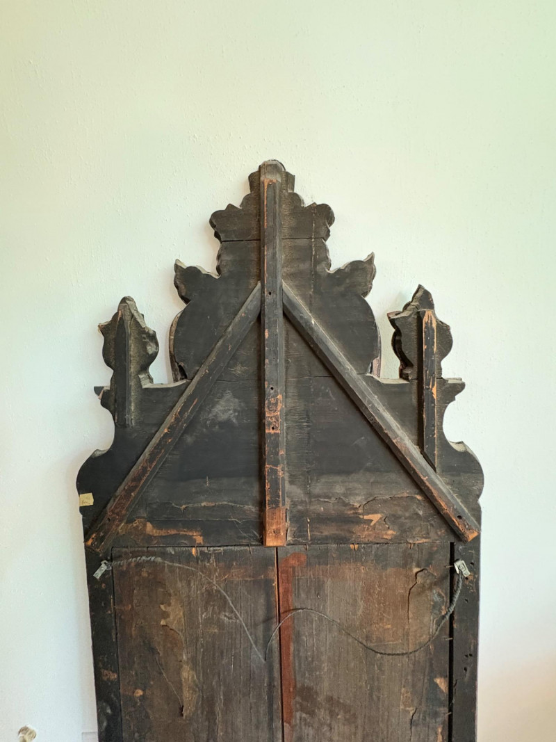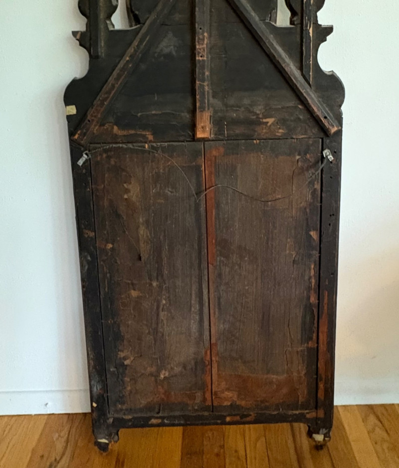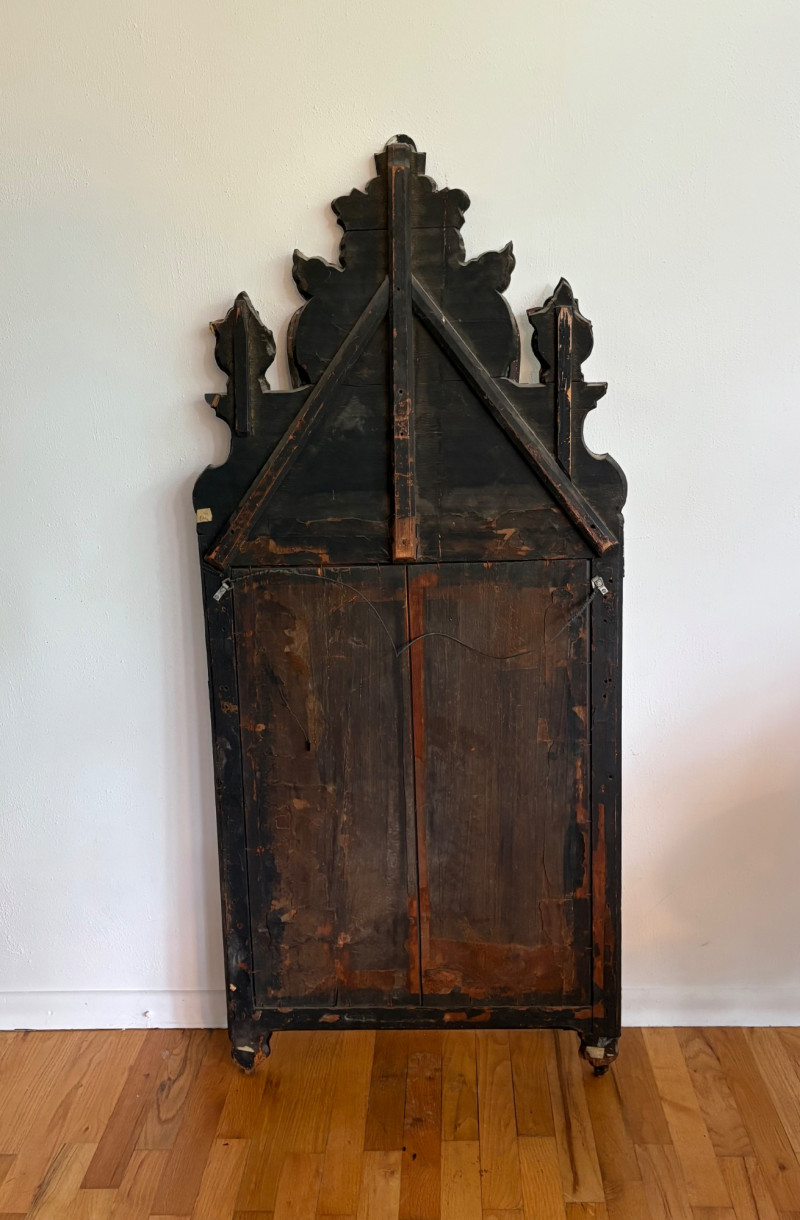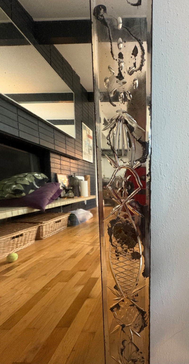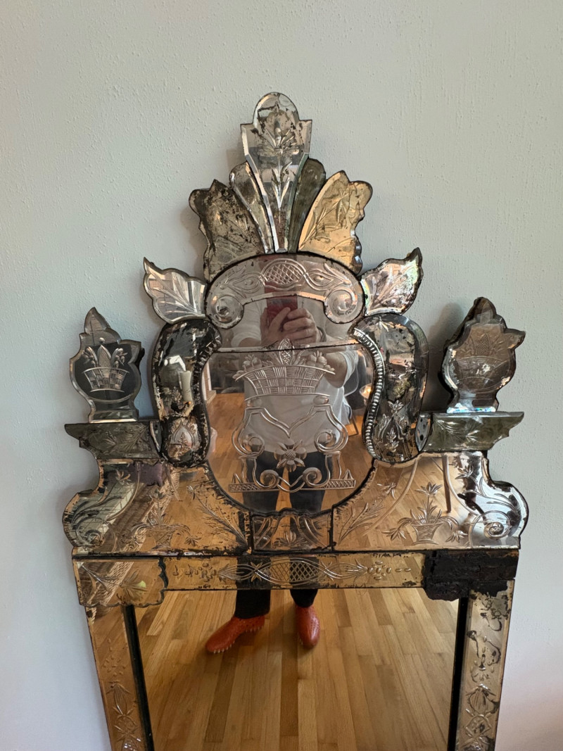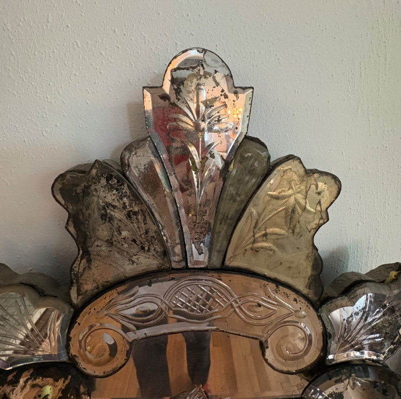 Very large antique Venetian glass mirror. Client is unsure of origin - purchased in an antique shop in Paris, and while she was told it was French there, it appears to us to be more in the Venetian style. Either way, this mirror is OLD. Measures shy 58" H x 25.5" W x 2" D with wood backing and stabilizers. As might be expected given its age, there are numerous flaws including a missing panel on the upper right, a couple of small cracks/divots (see last photo) and wear on the surfaces. However, the client purchased it exactly because its age is so evident yet inherently elegant in its character. Read more about Venetian glass mirrors here.