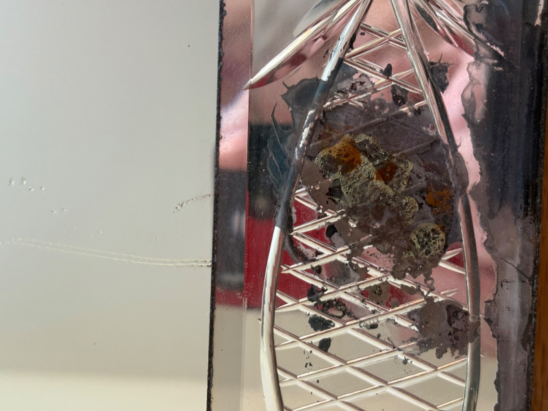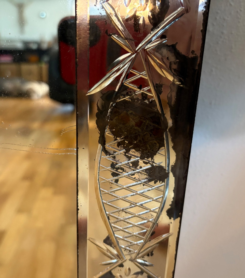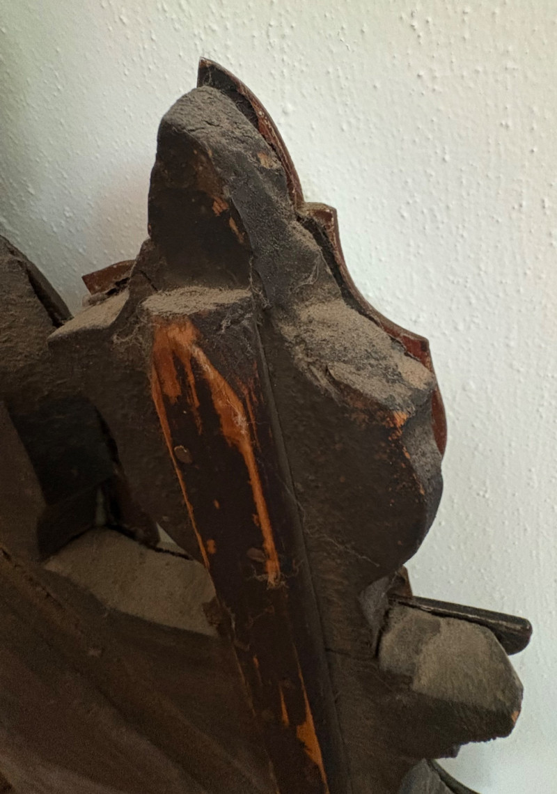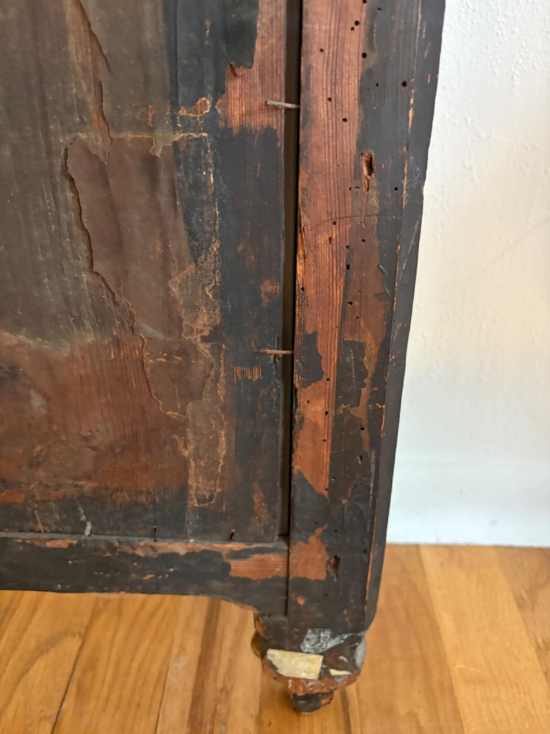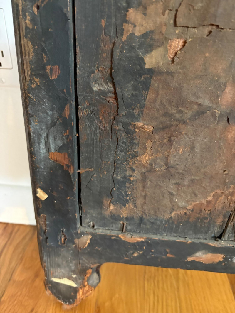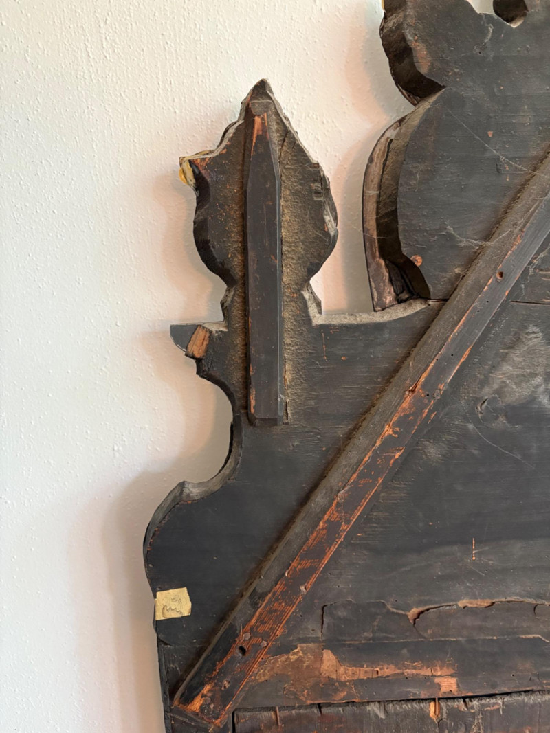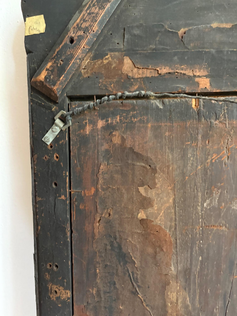 Very large antique Venetian glass mirror. Client is unsure of origin - purchased in an antique shop in Paris, and while she was told it was French there, it appears to us to be more in the Venetian style. Either way, this mirror is OLD. Measures shy 58" H x 25.5" W x 2" D with wood backing and stabilizers. As might be expected given its age, there are numerous flaws including a missing panel on the upper right, a couple of small cracks/divots (see last photo) and wear on the surfaces. However, the client purchased it exactly because its age is so evident yet inherently elegant in its character. Read more about Venetian glass mirrors here.
