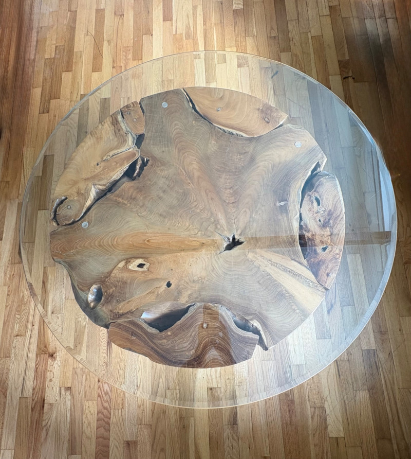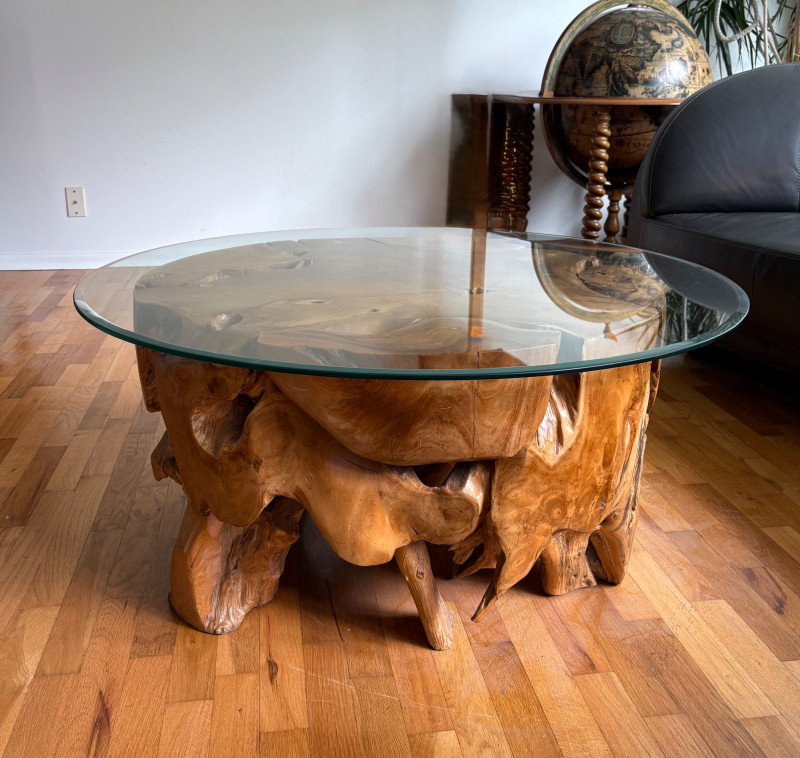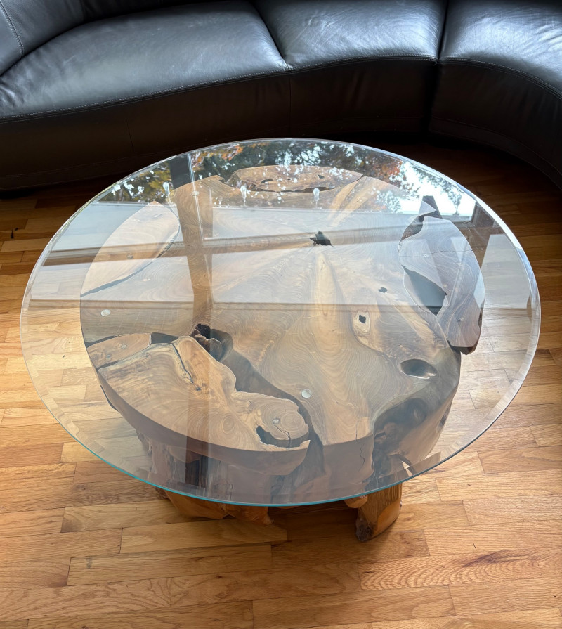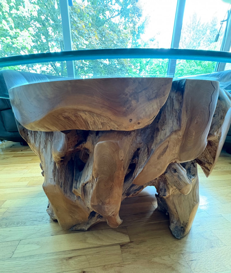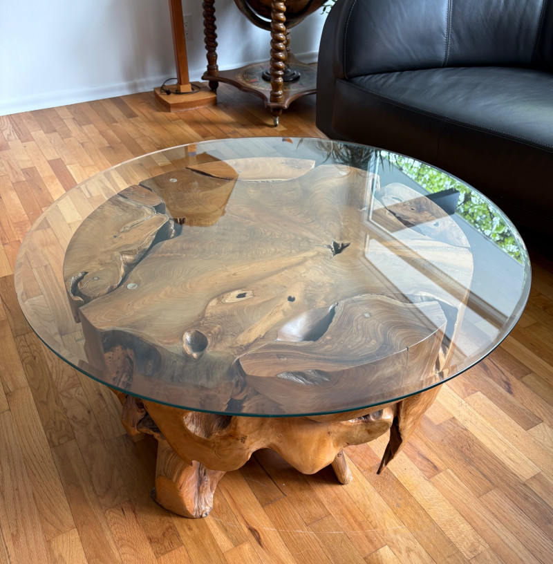 Elegant burl wood table! Table has an amazing piece of heavy burl wood for the base and a beveled-edge round glass top. Wonderfully polished wood contrasts with the tortured turns of the wood. There are a few very minor scratches on glass that do not show as they are over the base. Very unique table! Hard to find and was very expensive when purchased. Glass diameter is 39" in diameter while the burl diameter is 31". Table height is 18". Local Pickup Only. Bidding on this lot is an agreement that: (1.) You will have 2 capable, able-bodied persons to lift and load at a minimum. (2.) You will bring a hand truck and/or any other tools needed to remove this item. If these steps are not followed your item will be forfeited and no refund given.