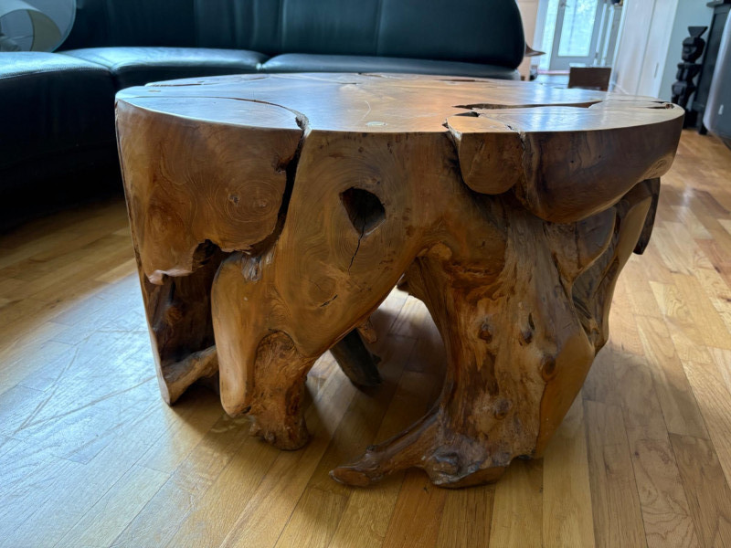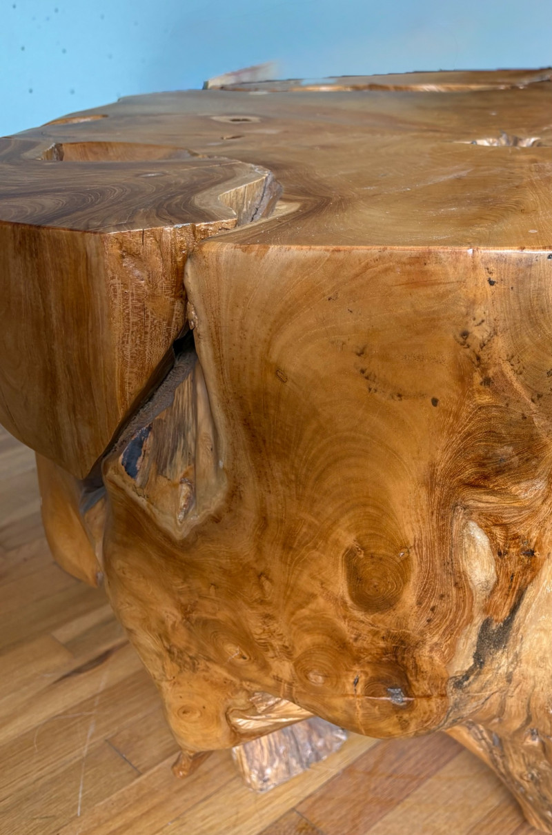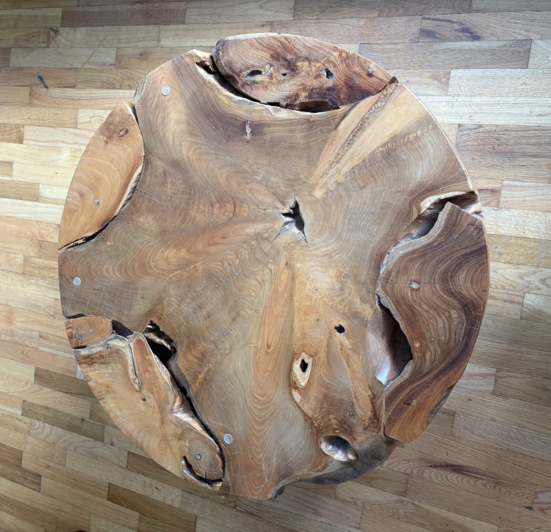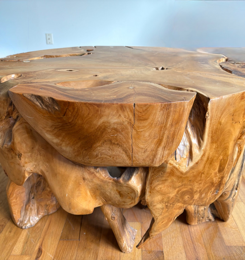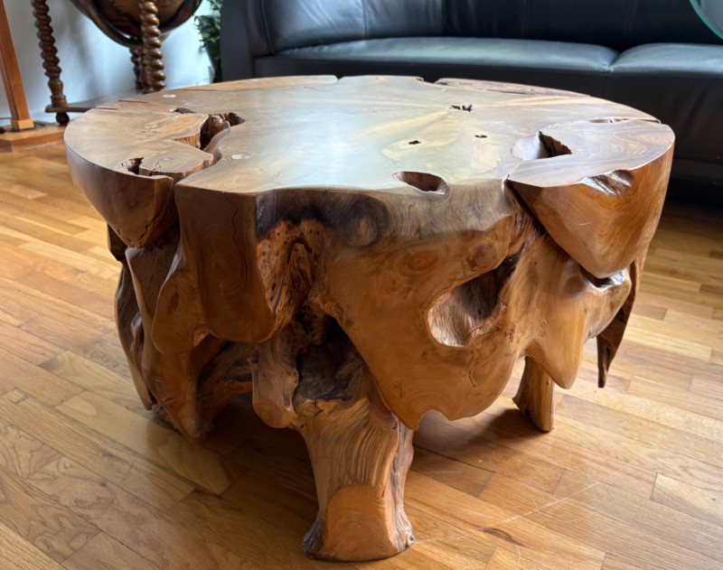 Elegant burl wood table! Table has an amazing piece of heavy burl wood for the base and a beveled-edge round glass top. Wonderfully polished wood contrasts with the tortured turns of the wood. There are a few very minor scratches on glass that do not show as they are over the base. Very unique table! Hard to find and was very expensive when purchased. Glass diameter is 39" in diameter while the burl diameter is 31". Table height is 18". Local Pickup Only. Bidding on this lot is an agreement that: (1.) You will have 2 capable, able-bodied persons to lift and load at a minimum. (2.) You will bring a hand truck and/or any other tools needed to remove this item. If these steps are not followed your item will be forfeited and no refund given.