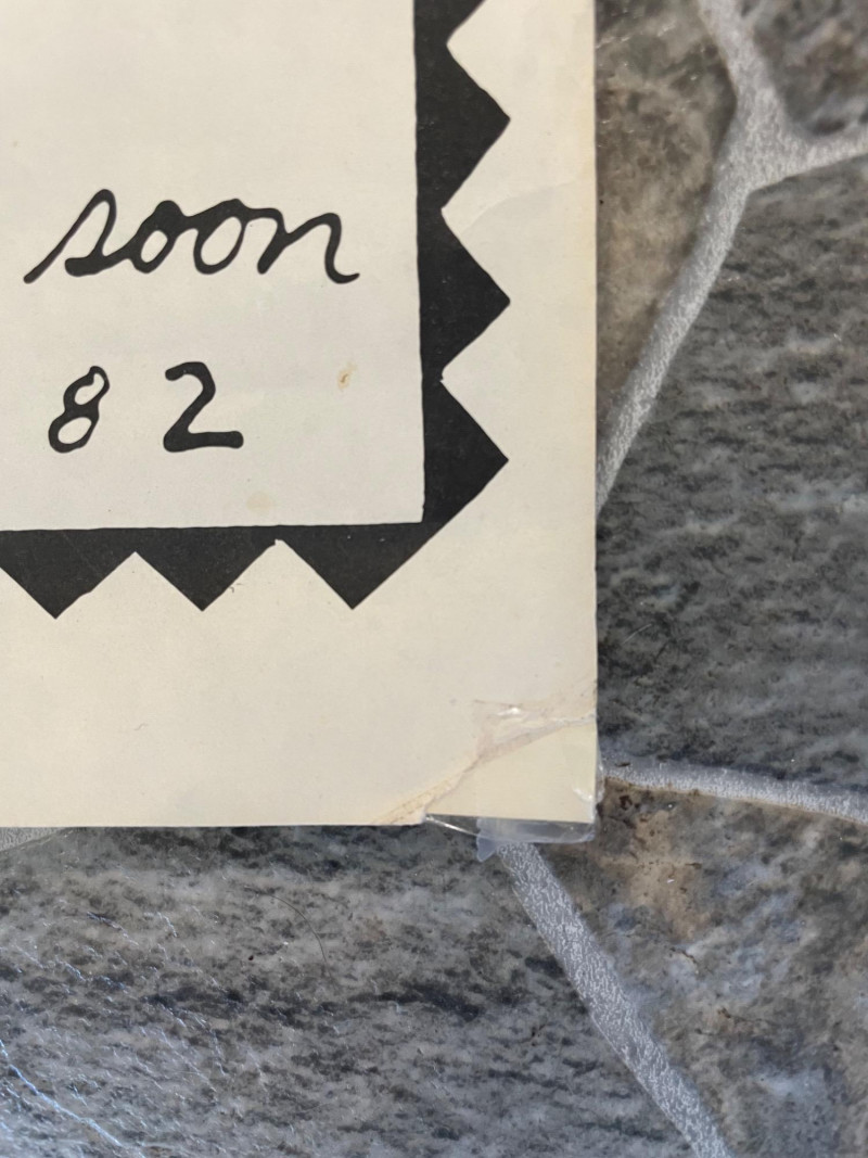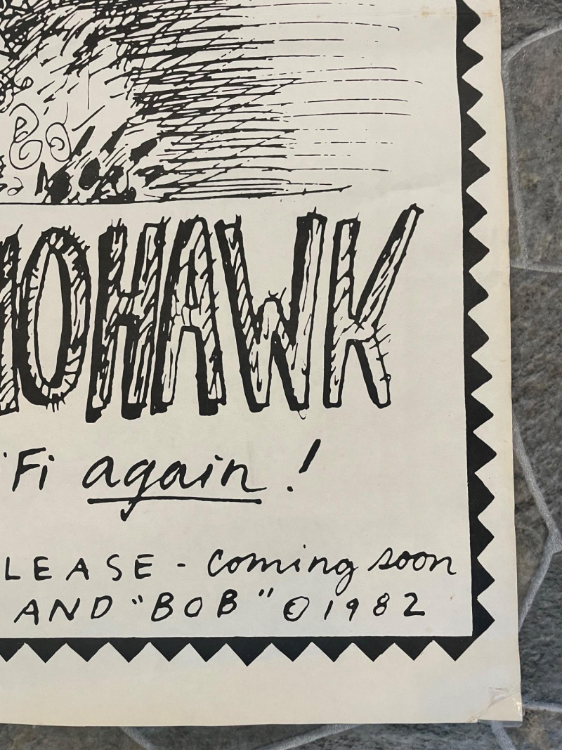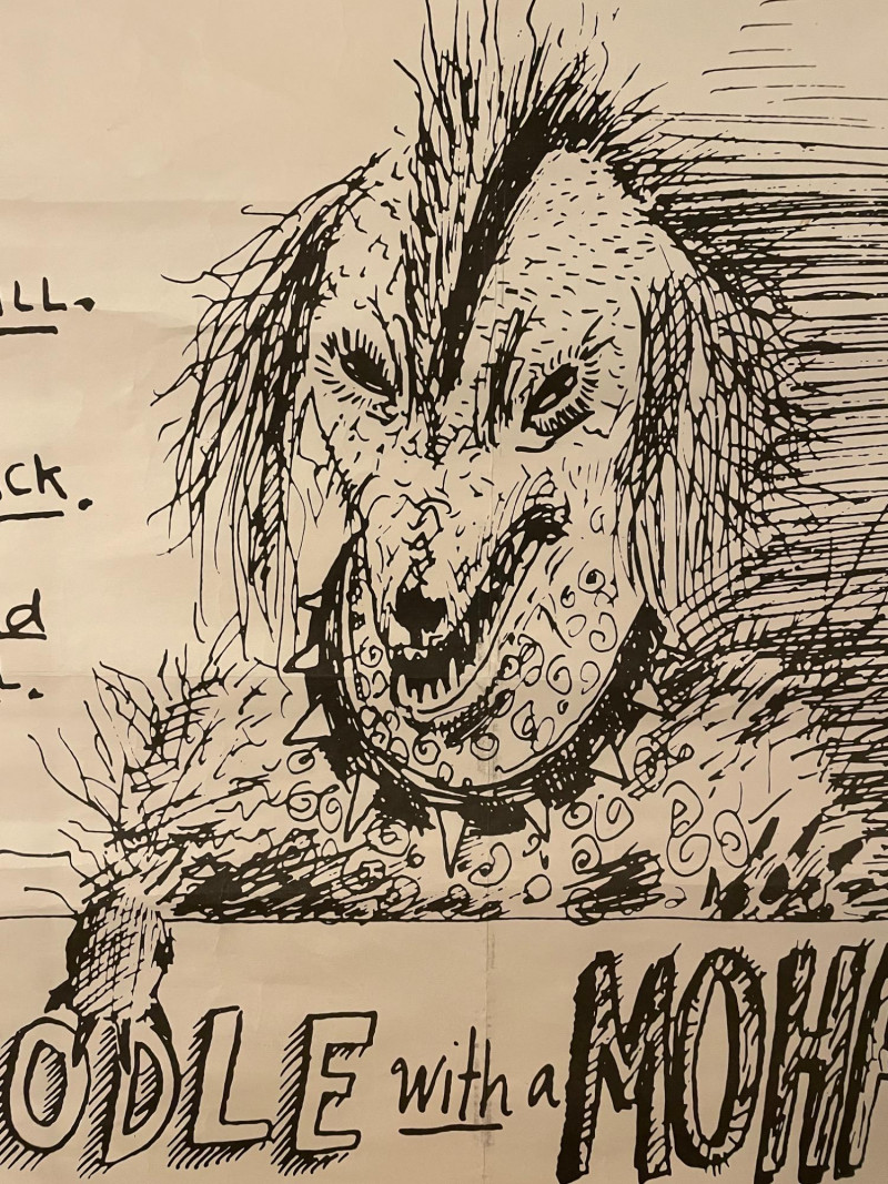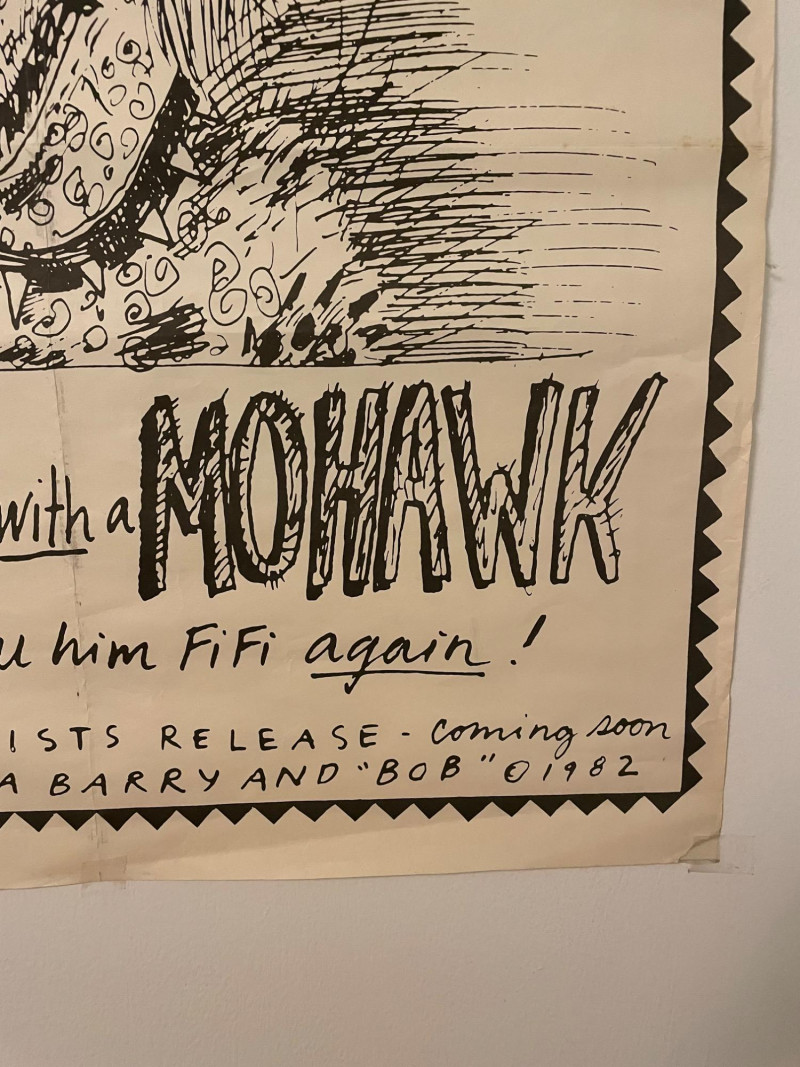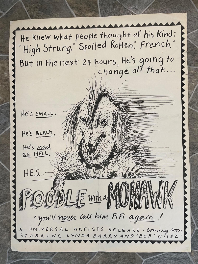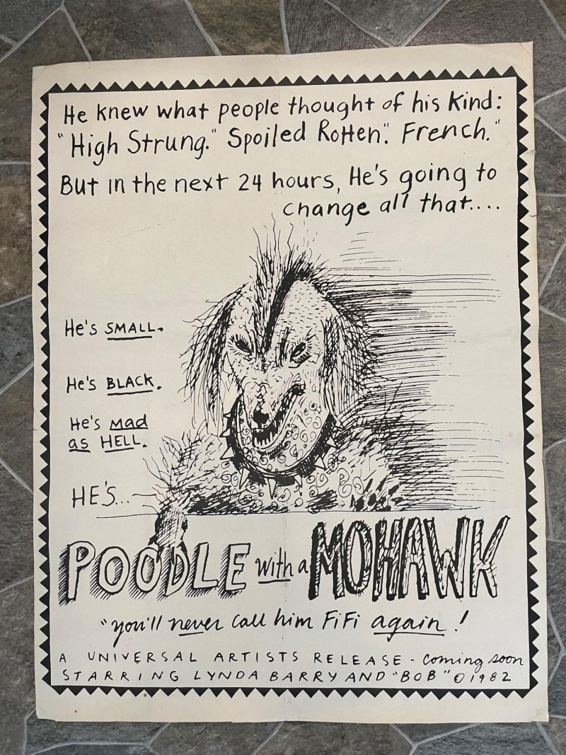 Vintage 1982 original "Poodle with a Mohawk" "movie" poster by infamous Seattle comic book artist Lynda Barry. Has old, clear tape on edges and a few edge tears, but overall in good condition for its age. This is the first one printed (it doesn't have the publisher's red square on the bottom of the poster). He knew what people thought of his kind: "High Strung" "Spoiled Rotten" "French" But in the next 24 hours he's going to change all that... He's small...he's black...he's mad as hell...he's Poodle with a Mohawk! You’ll never call him Fifi again!” Sound Estate Company does not appraise art or guarantee authenticity.