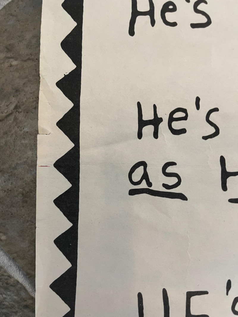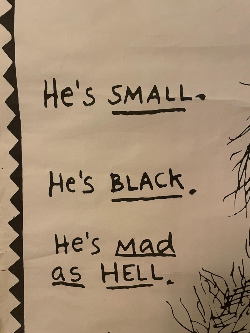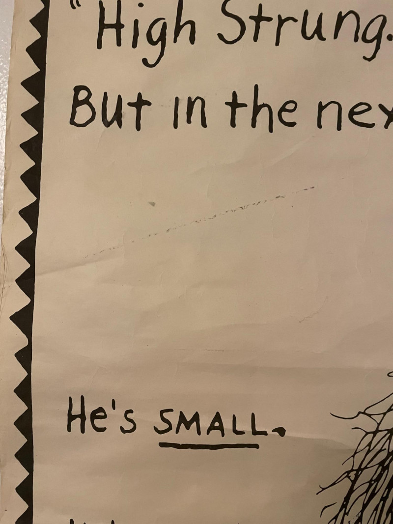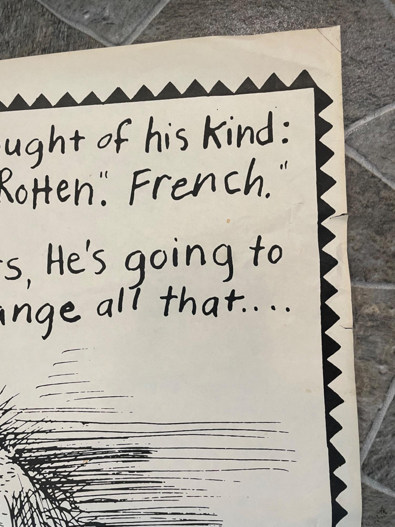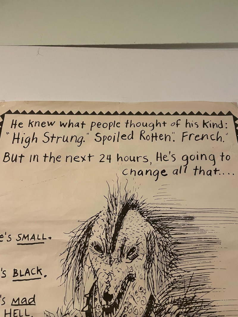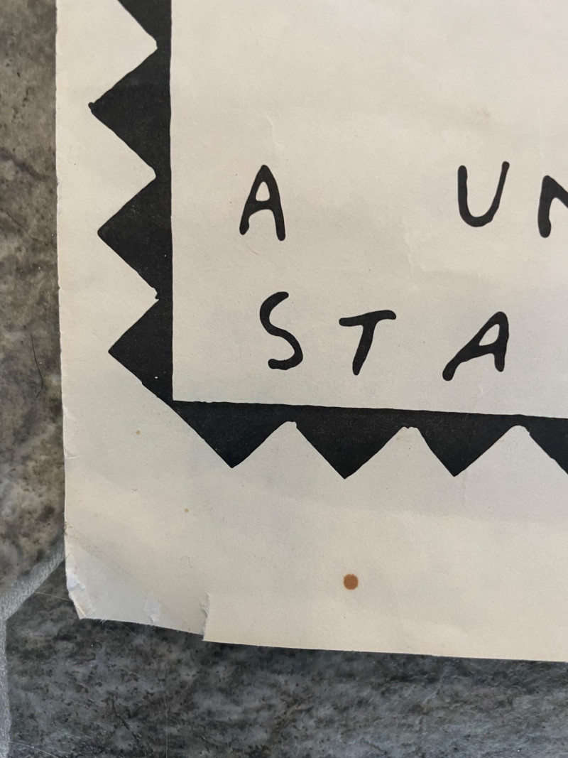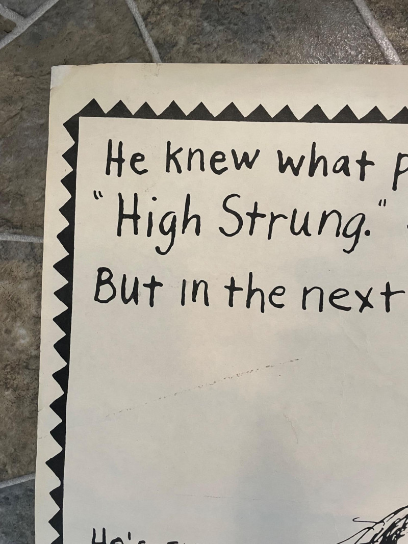 Vintage 1982 original "Poodle with a Mohawk" "movie" poster by infamous Seattle comic book artist Lynda Barry. Has old, clear tape on edges and a few edge tears, but overall in good condition for its age. This is the first one printed (it doesn't have the publisher's red square on the bottom of the poster). He knew what people thought of his kind: "High Strung" "Spoiled Rotten" "French" But in the next 24 hours he's going to change all that... He's small...he's black...he's mad as hell...he's Poodle with a Mohawk! You’ll never call him Fifi again!” Sound Estate Company does not appraise art or guarantee authenticity.
