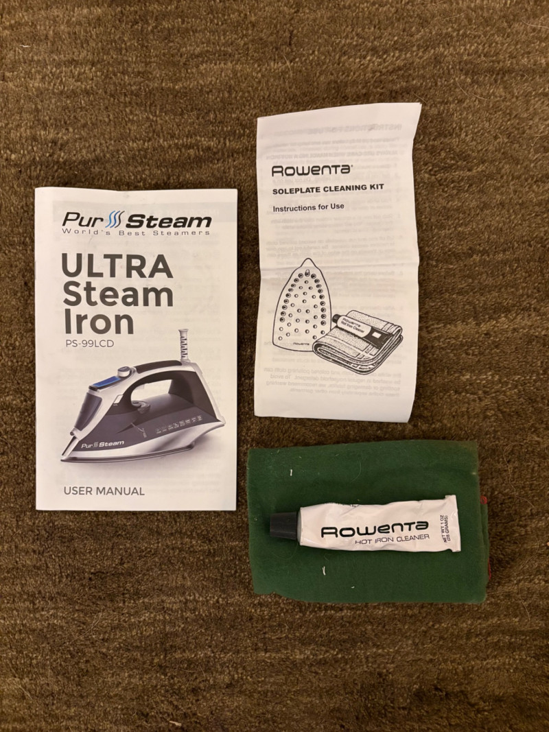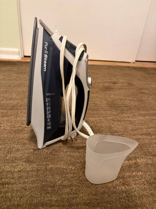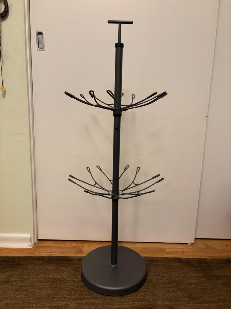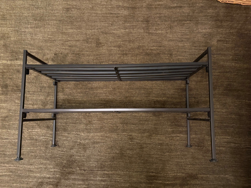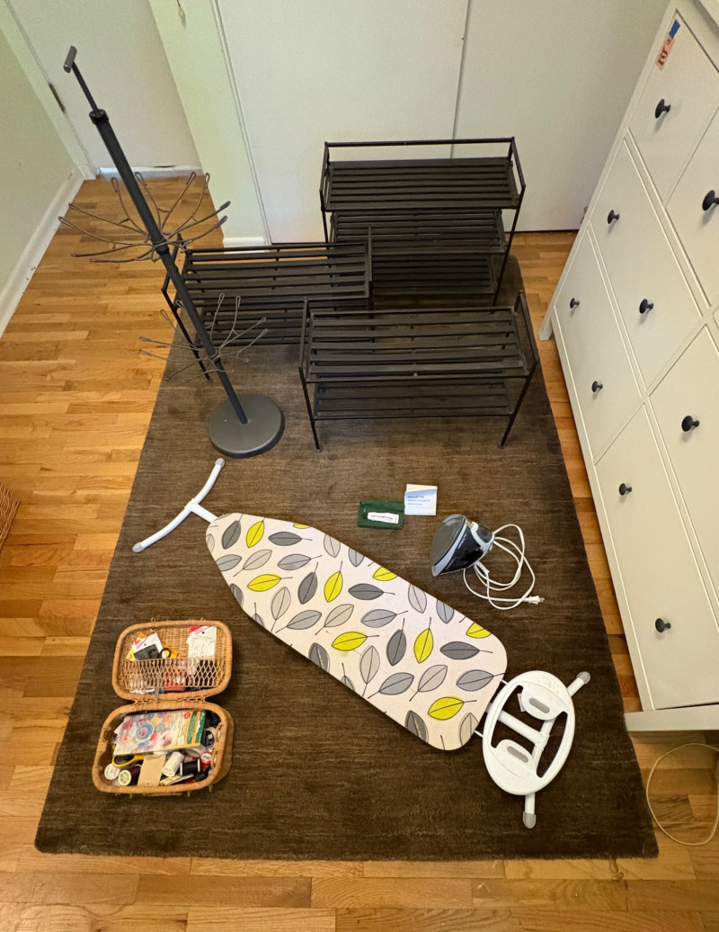 Everything you need to store apparel items in your closet in an orderly fashion and keep them in good repair. All items in good used condition or better. Three sturdy metal shoe racks: two 2-tier racks measuring 15" H x 26.5 W x 11.5" D each and one 3-tier rack measuring 18" H x 26.5" W x 11.5" D. All three in good condition but need to be dusted. Apartment-size ironing board with ironing rest measures 46.5" from the iron holder at end to tip of the board x 13" W and is adjustable height. Pur-Steam iron with additional Rowenta steel plate cleaning kit. In good condition with auto shut-off and large water reservoir. Sewing kit with miscellaneous thread, needles, scissors, and anything else you might need for repairs. 2-tier boot rack which holds 3 pairs of boots per level (racks spin).. Approximately 38" H with weighted bottom to prevent turnovers.