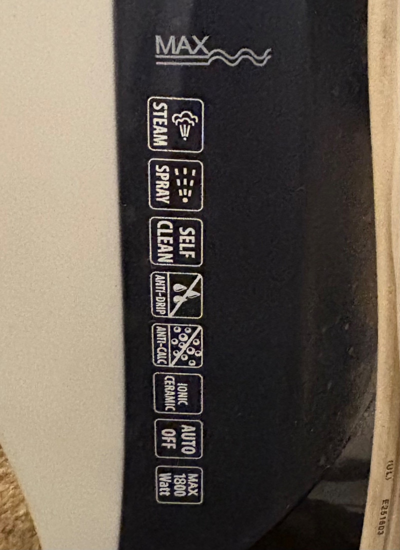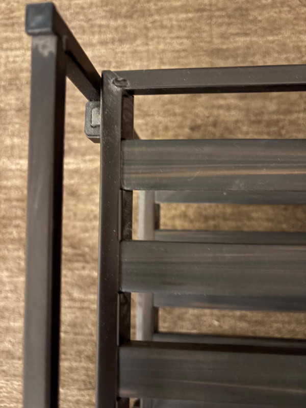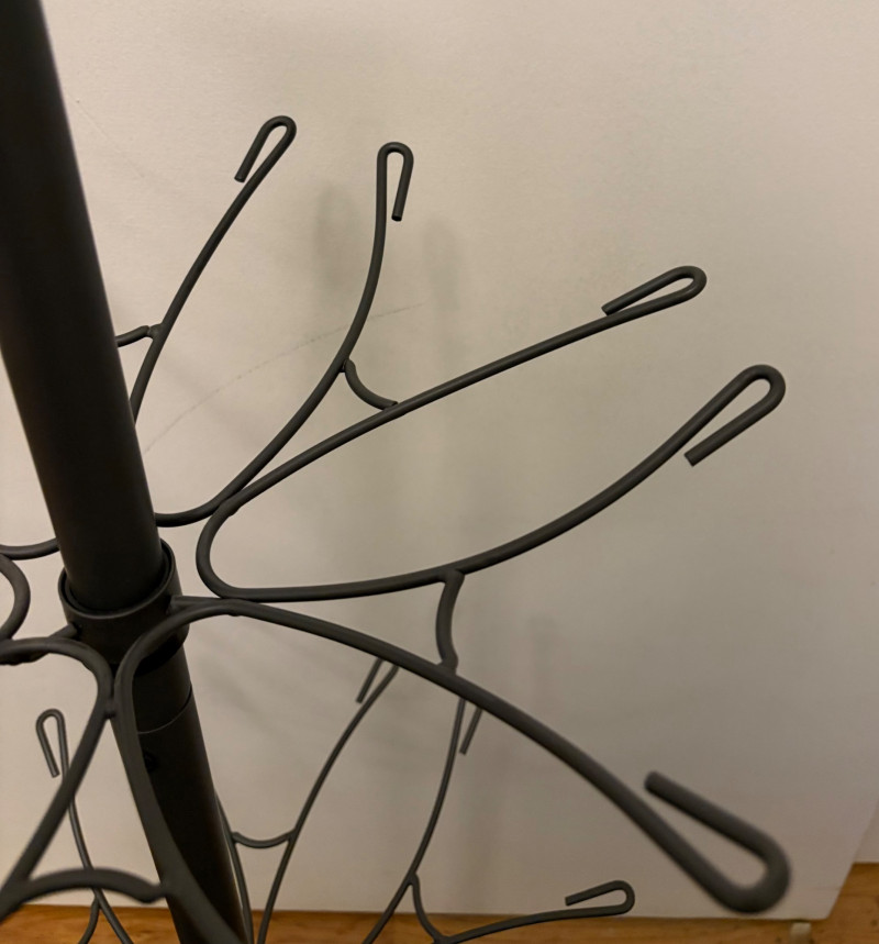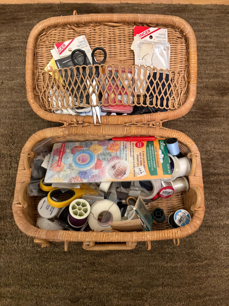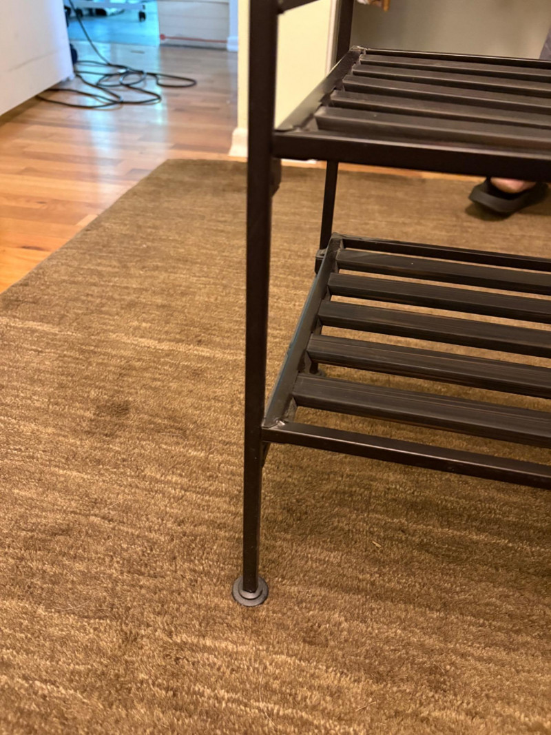 Everything you need to store apparel items in your closet in an orderly fashion and keep them in good repair. All items in good used condition or better. Three sturdy metal shoe racks: two 2-tier racks measuring 15" H x 26.5 W x 11.5" D each and one 3-tier rack measuring 18" H x 26.5" W x 11.5" D. All three in good condition but need to be dusted. Apartment-size ironing board with ironing rest measures 46.5" from the iron holder at end to tip of the board x 13" W and is adjustable height. Pur-Steam iron with additional Rowenta steel plate cleaning kit. In good condition with auto shut-off and large water reservoir. Sewing kit with miscellaneous thread, needles, scissors, and anything else you might need for repairs. 2-tier boot rack which holds 3 pairs of boots per level (racks spin).. Approximately 38" H with weighted bottom to prevent turnovers.