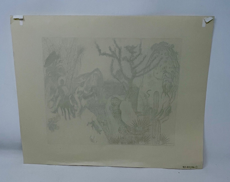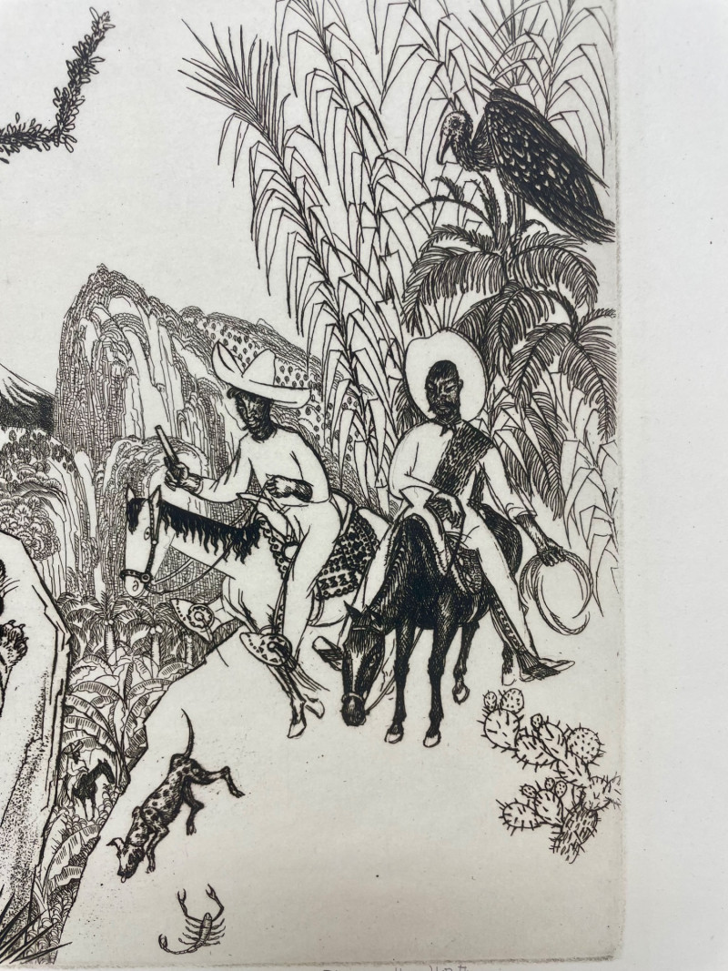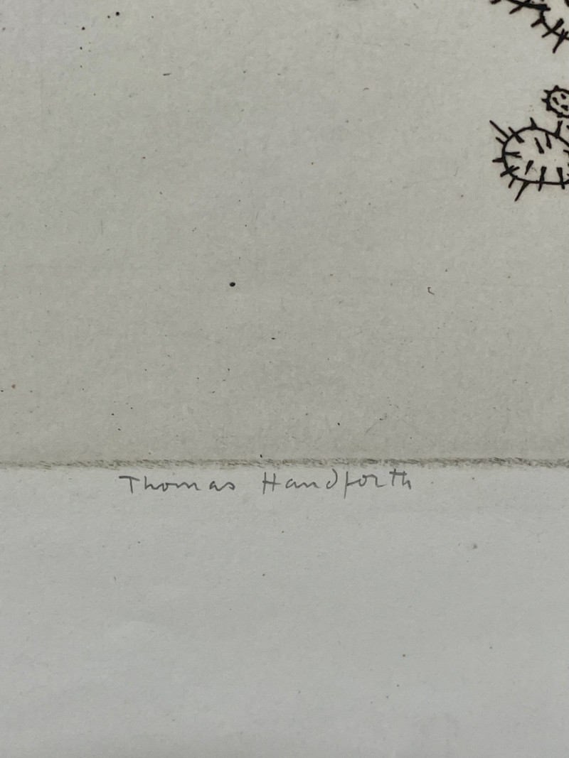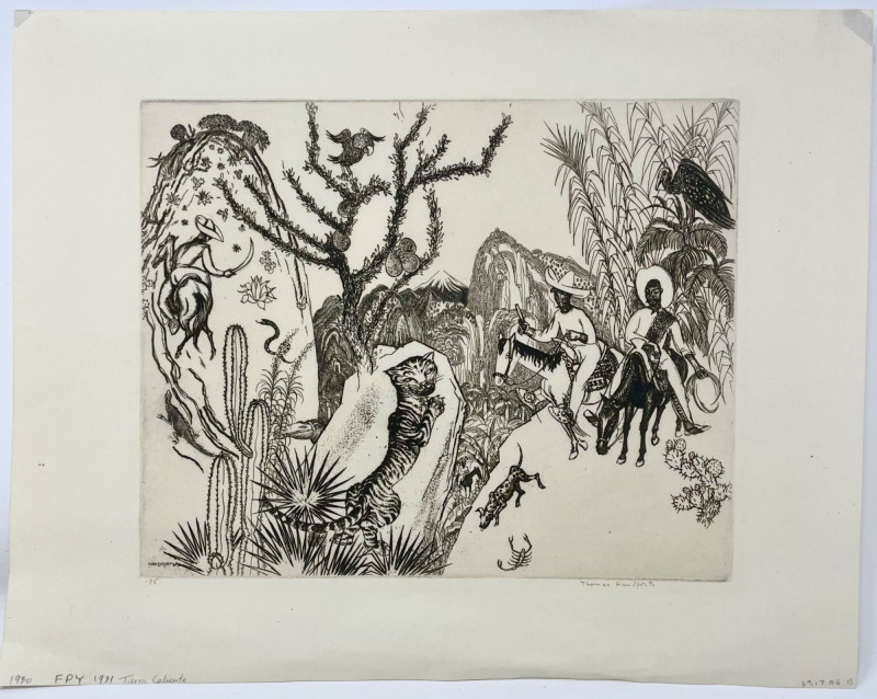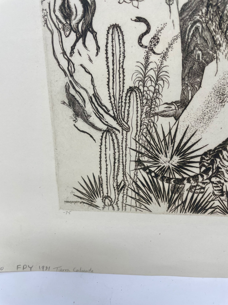 1930 etching on cream laid paper by American artist Thomas Handforth entitled "Tierra Caliente". A fine impression with full margins from an edition of 75 signed in pencil. Purchased for $225 in 1994. This print is in the permanent collection of The Metropolitan Museum of Art, Portland Art Museum, Art Institute of Chicago, and many others. Measures 8.5" x 11" (plate area) with the paper measuring 11.25" x 14.25". Sound Estate Company does not appraise art or guarantee authenticity.