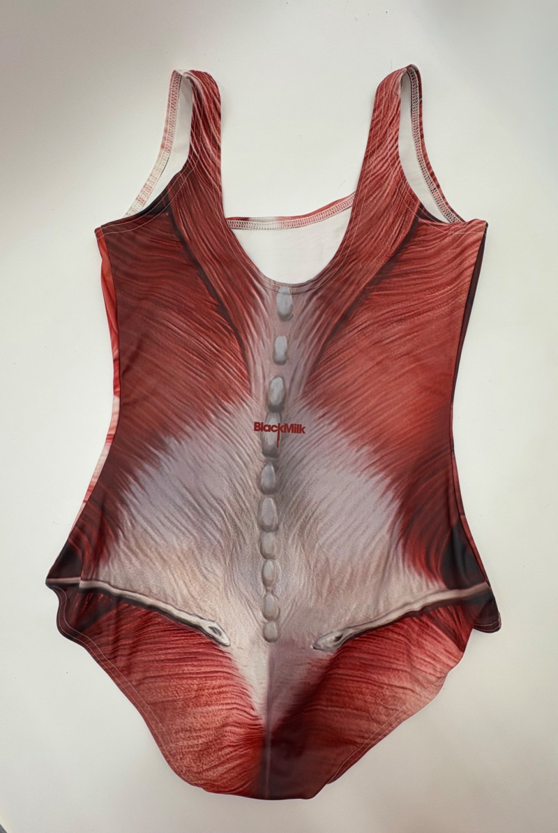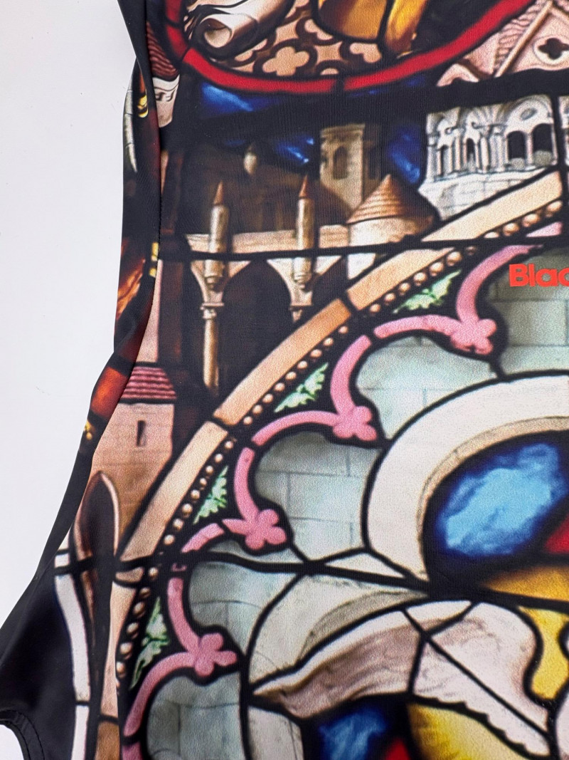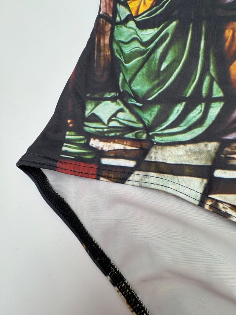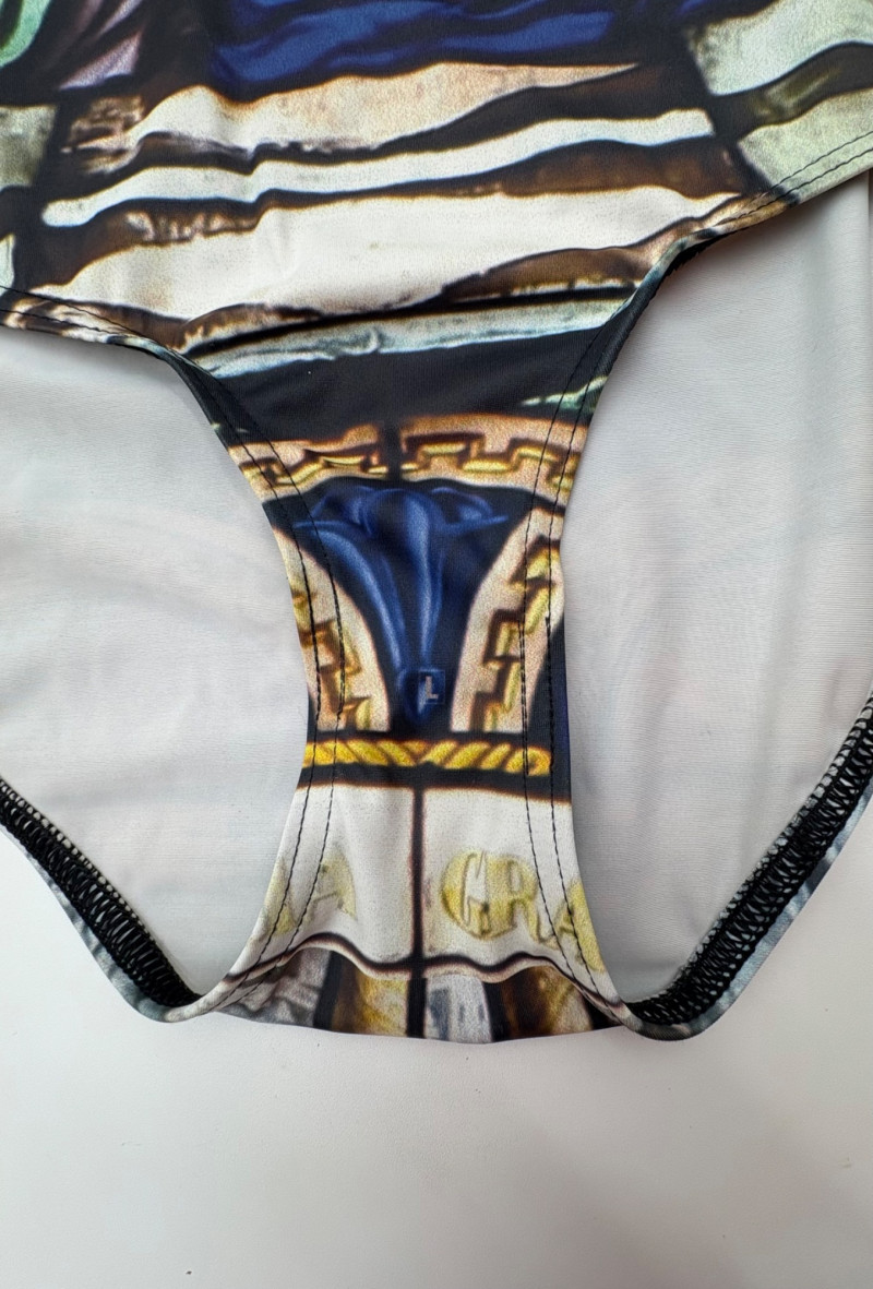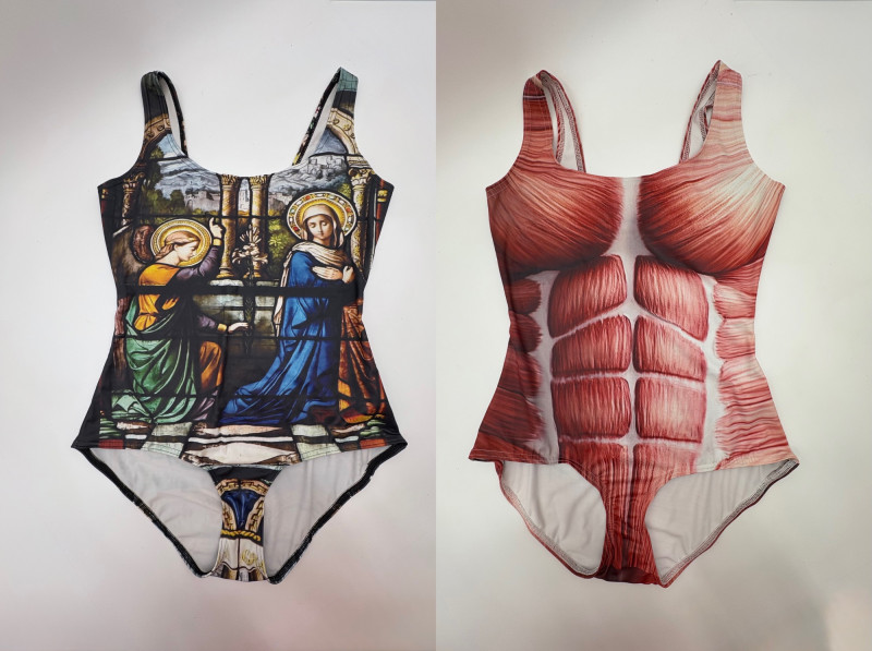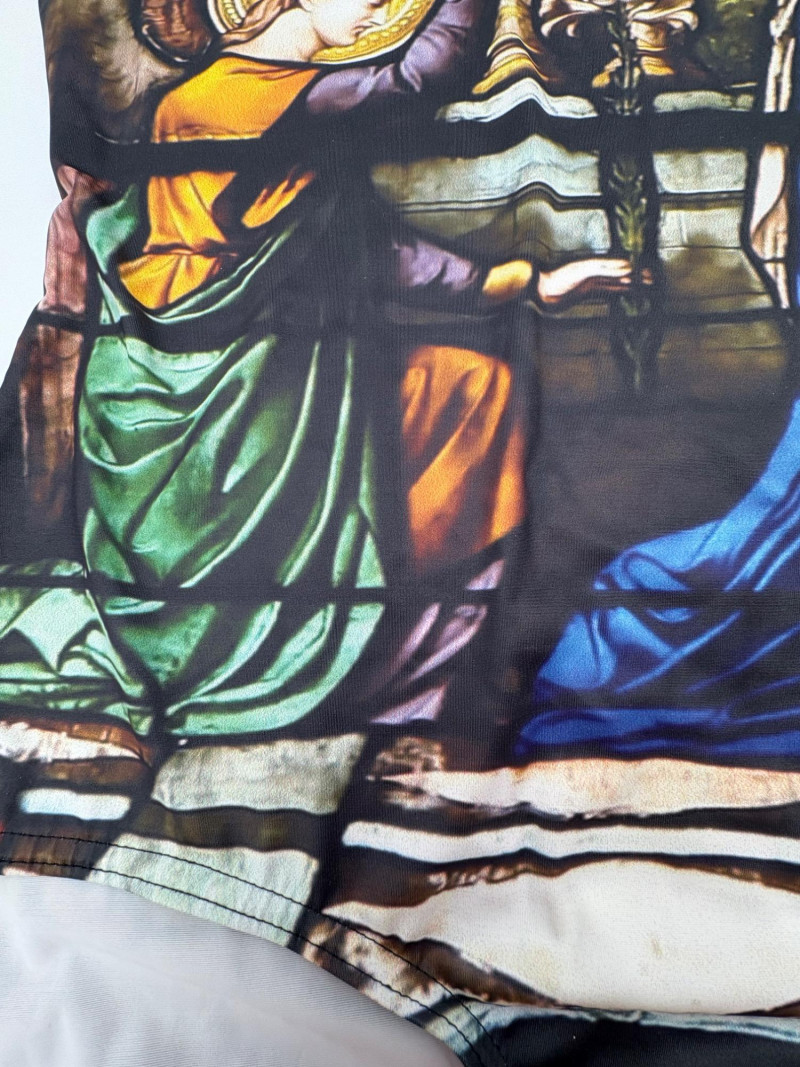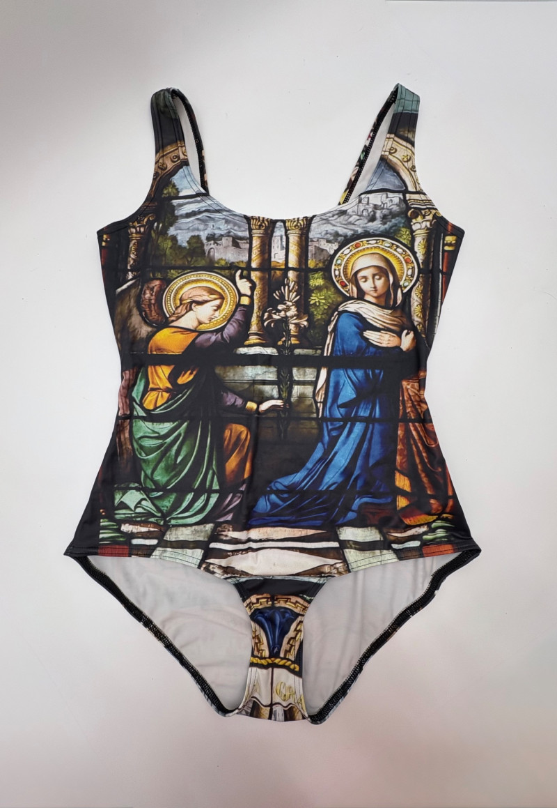 Pair of Black Milk bathing suits from Australia. This company is known for its wild prints on sleek minimalist design suits in high quality Lycra. Here we have a stained glass Annunciation scene and a muscular/skeletal anatomy lesson in a single lot! Suits measure 16" unstretched pit to pit, but have lots of stretch - client wore an XL when she purchased them, but put them away and forgot about them so they were never used. Both say size L on tags.
