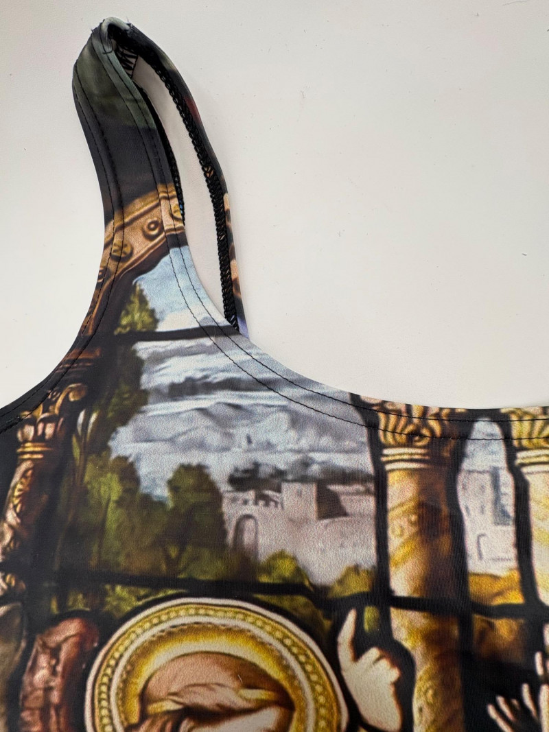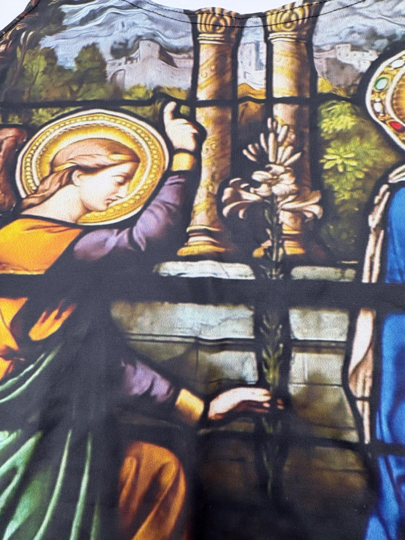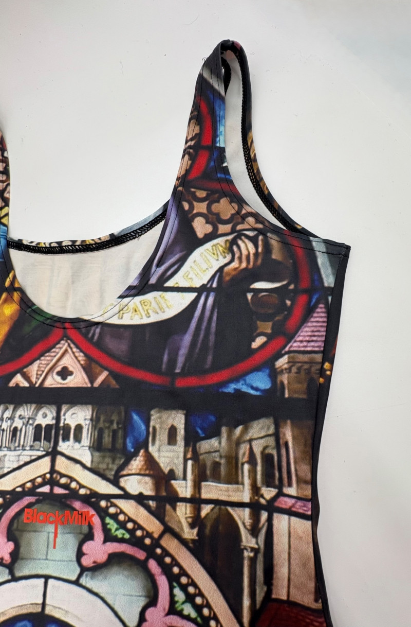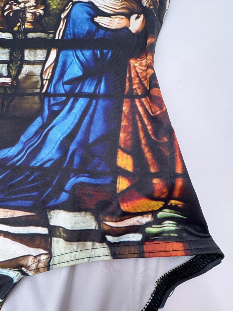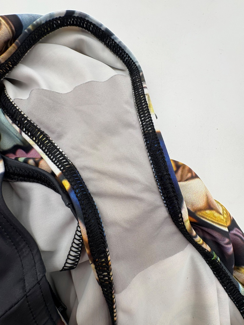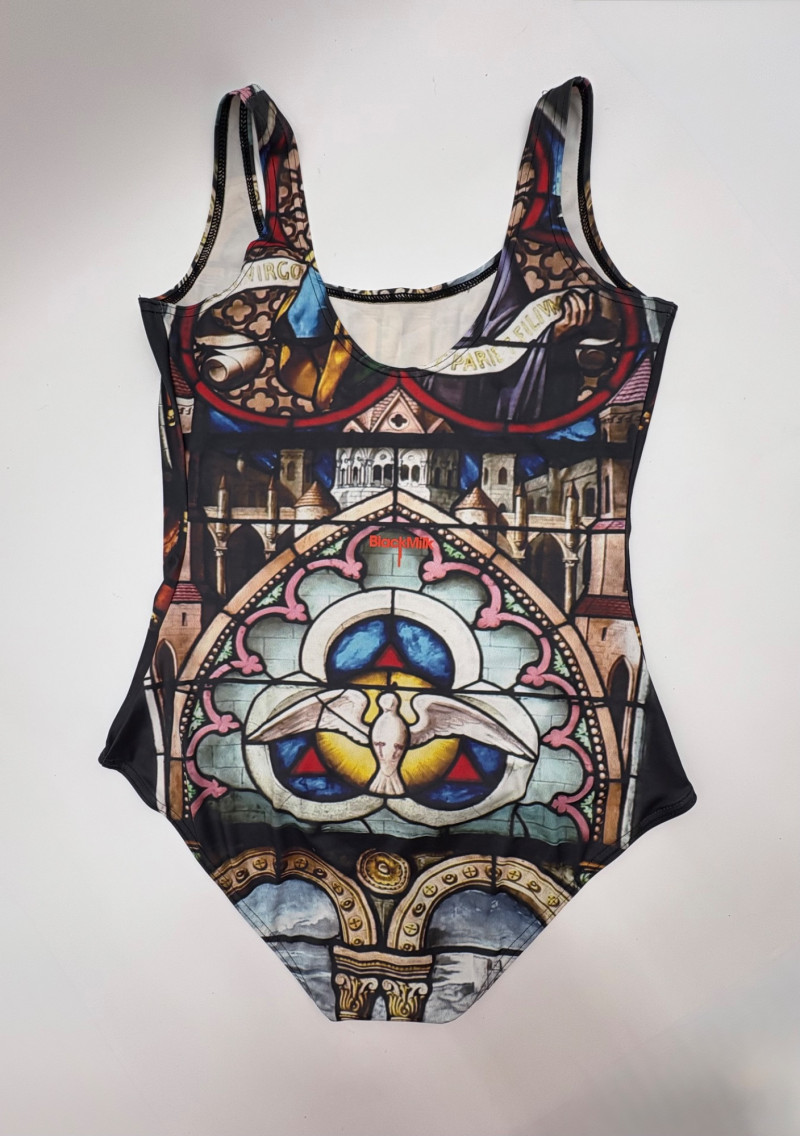 Pair of Black Milk bathing suits from Australia. This company is known for its wild prints on sleek minimalist design suits in high quality Lycra. Here we have a stained glass Annunciation scene and a muscular/skeletal anatomy lesson in a single lot! Suits measure 16" unstretched pit to pit, but have lots of stretch - client wore an XL when she purchased them, but put them away and forgot about them so they were never used. Both say size L on tags.