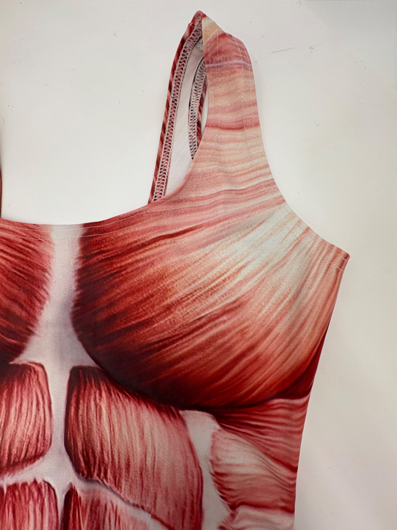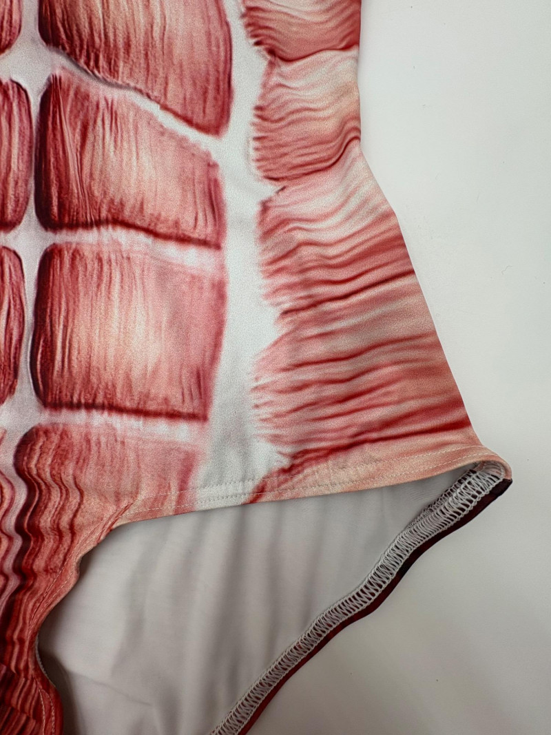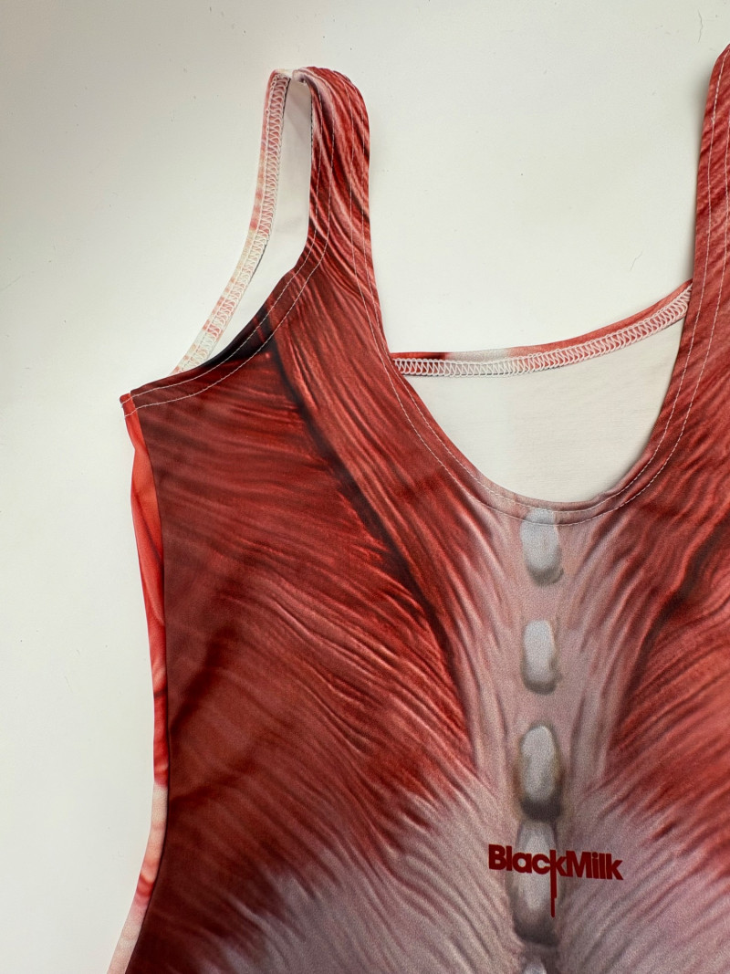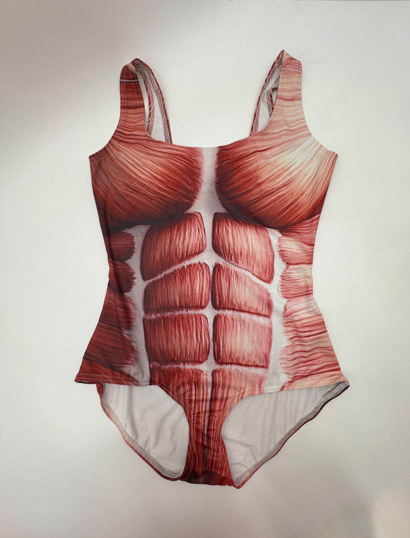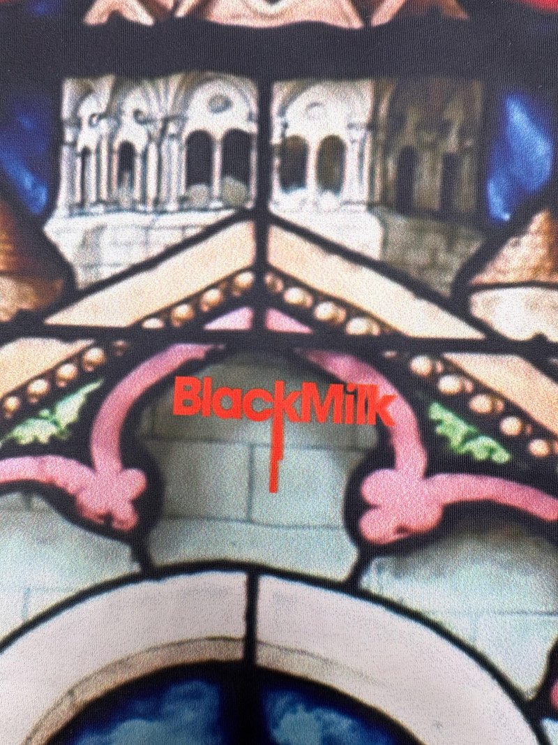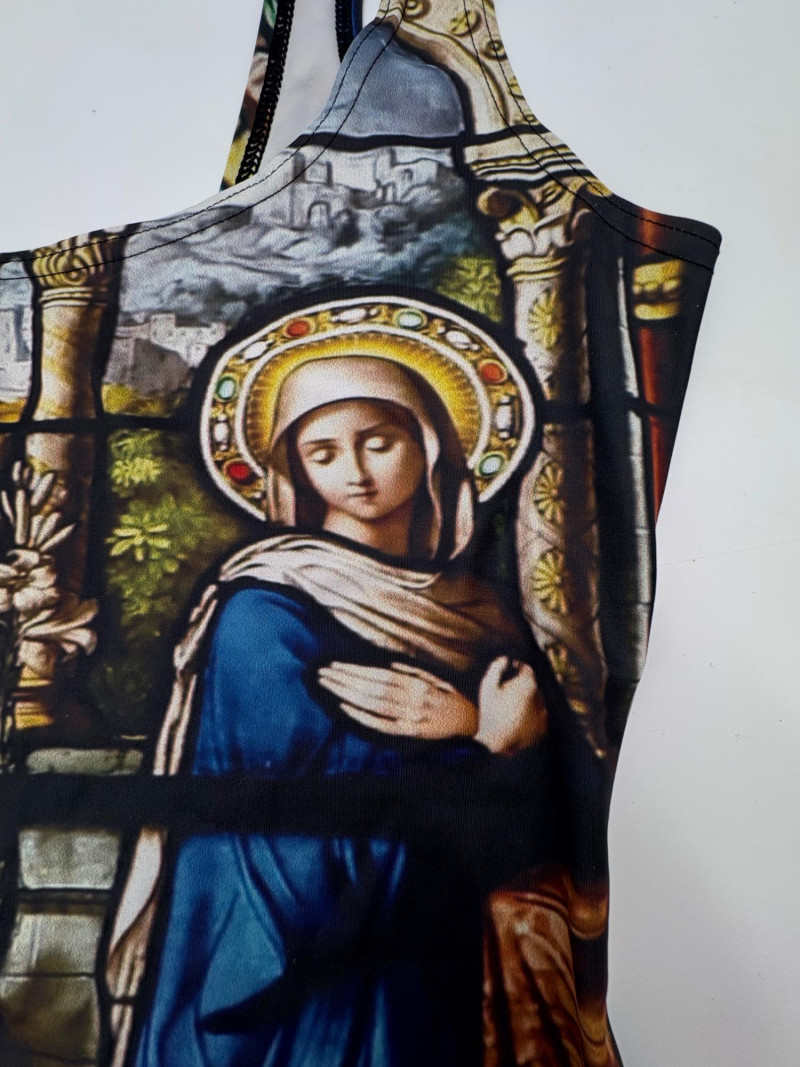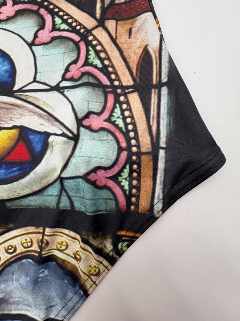Pair of Black Milk bathing suits from Australia. This company is known for its wild prints on sleek minimalist design suits in high quality Lycra. Here we have a stained glass Annunciation scene and a muscular/skeletal anatomy lesson in a single lot! Suits measure 16" unstretched pit to pit, but have lots of stretch - client wore an XL when she purchased them, but put them away and forgot about them so they were never used. Both say size L on tags.